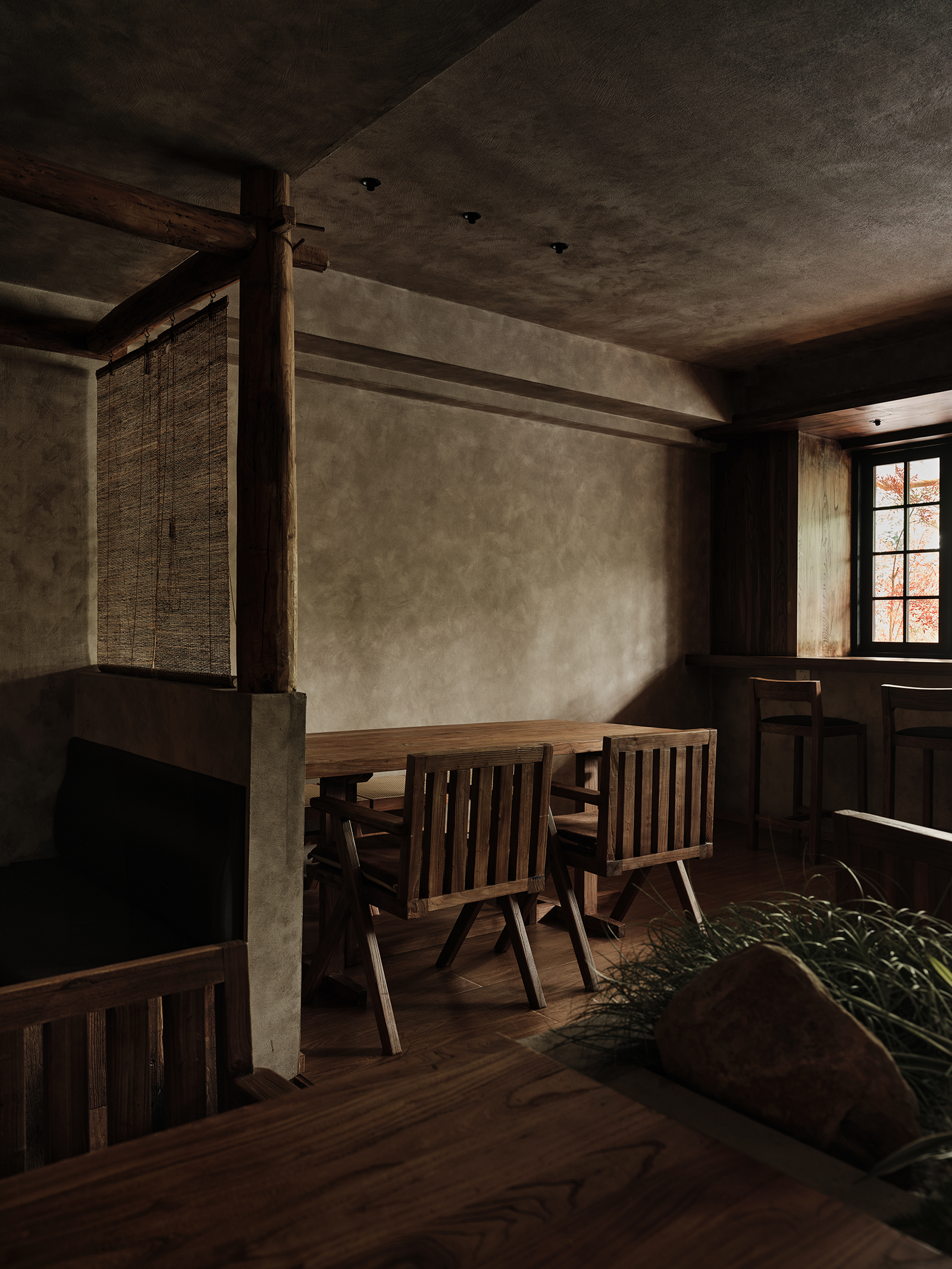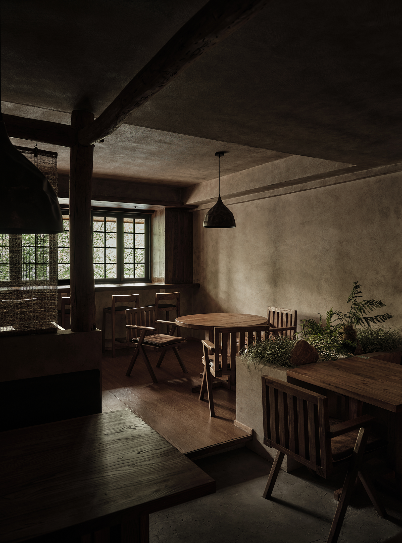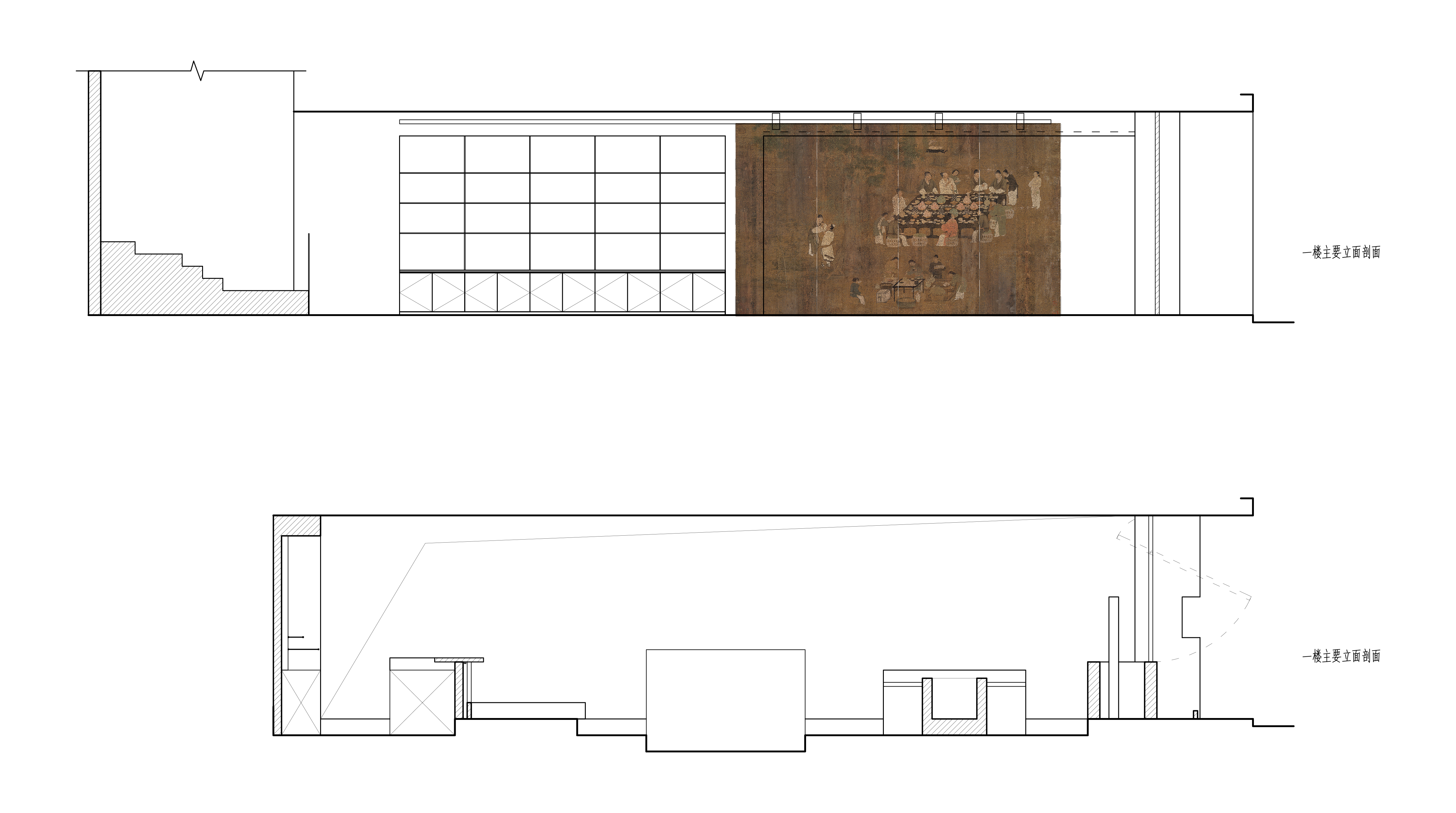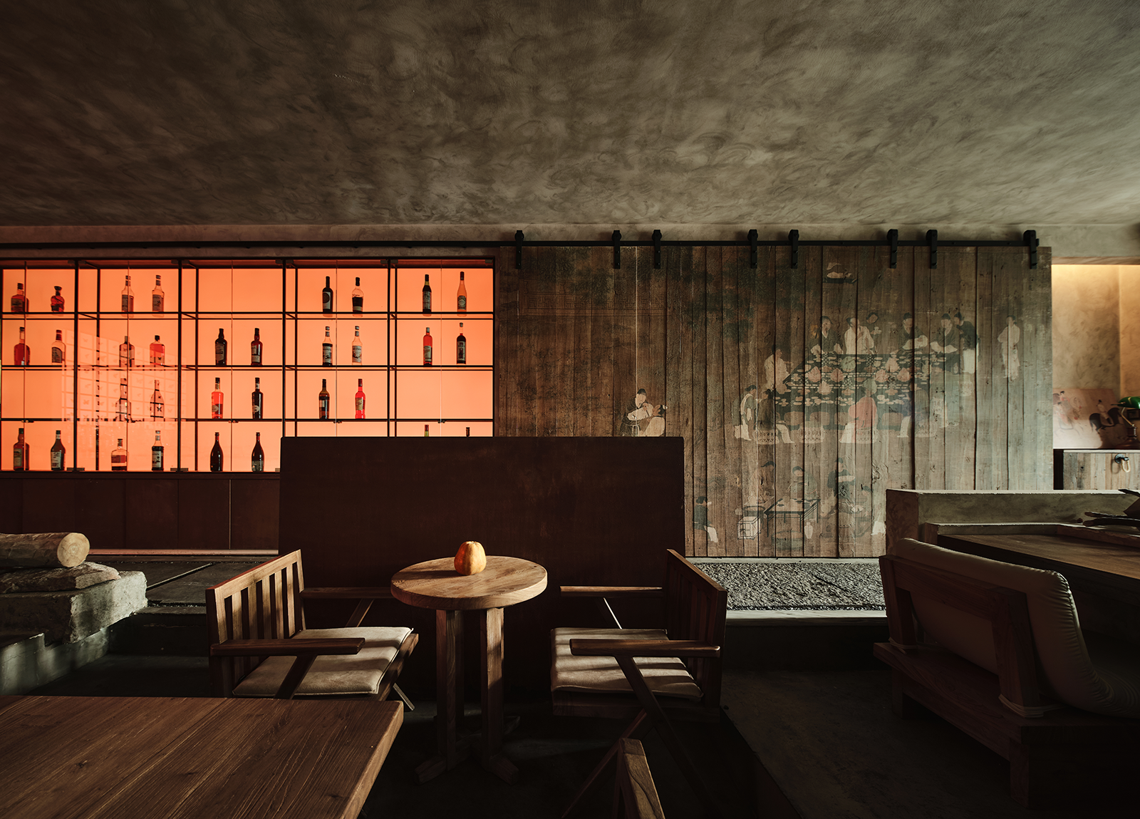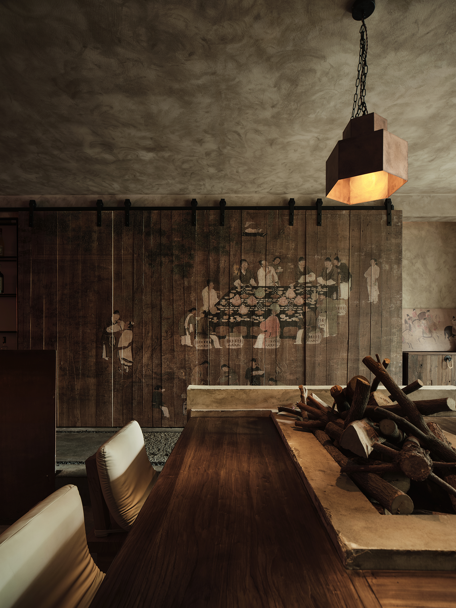 空间布局:餐厅的正餐部分与茶水吧区域虽然没用明确的划分,但基本上也是将一楼前厅区作为一个日茶夜酒的Bar空间。一楼既然以茶酒为主,考虑复合周边月湖与天一阁的风雅格调。我想起北宋赵佶《文会图》里描绘文士们围坐大桌宴饮畅谈的场景。恰巧本案室内,建筑可以下挖,结合错落地台,有可以席地而坐,也有布置矮凳,刚好也能形成一个围坐场景,与墙面老木板移门上的画面内容相呼应。考虑到茶饮散客为主,所以把山上锯来的木材堆在大桌子之中,邻座对面为陌生人时,可以隔绝部分视线。