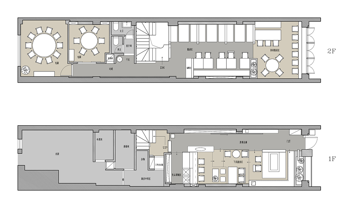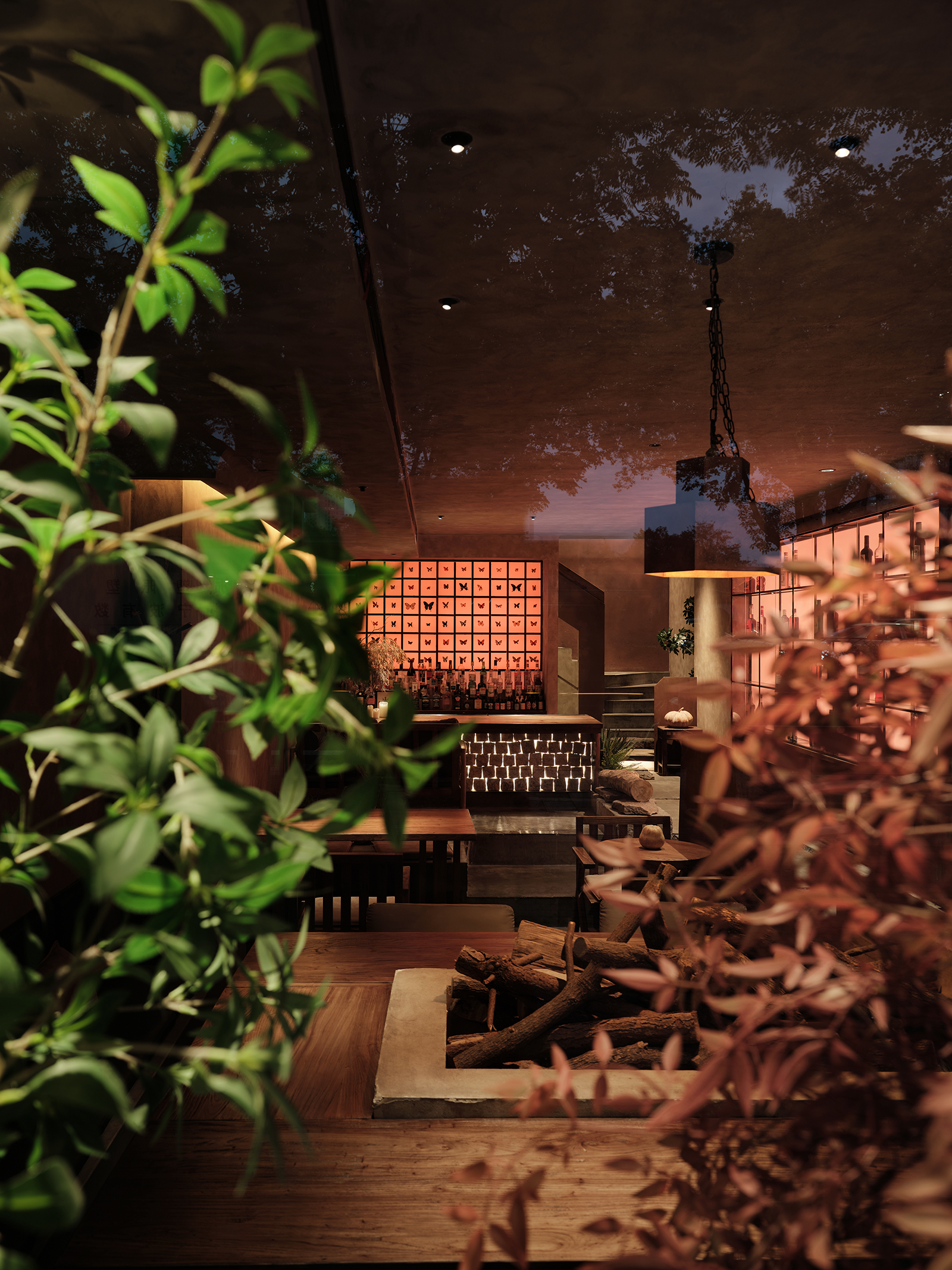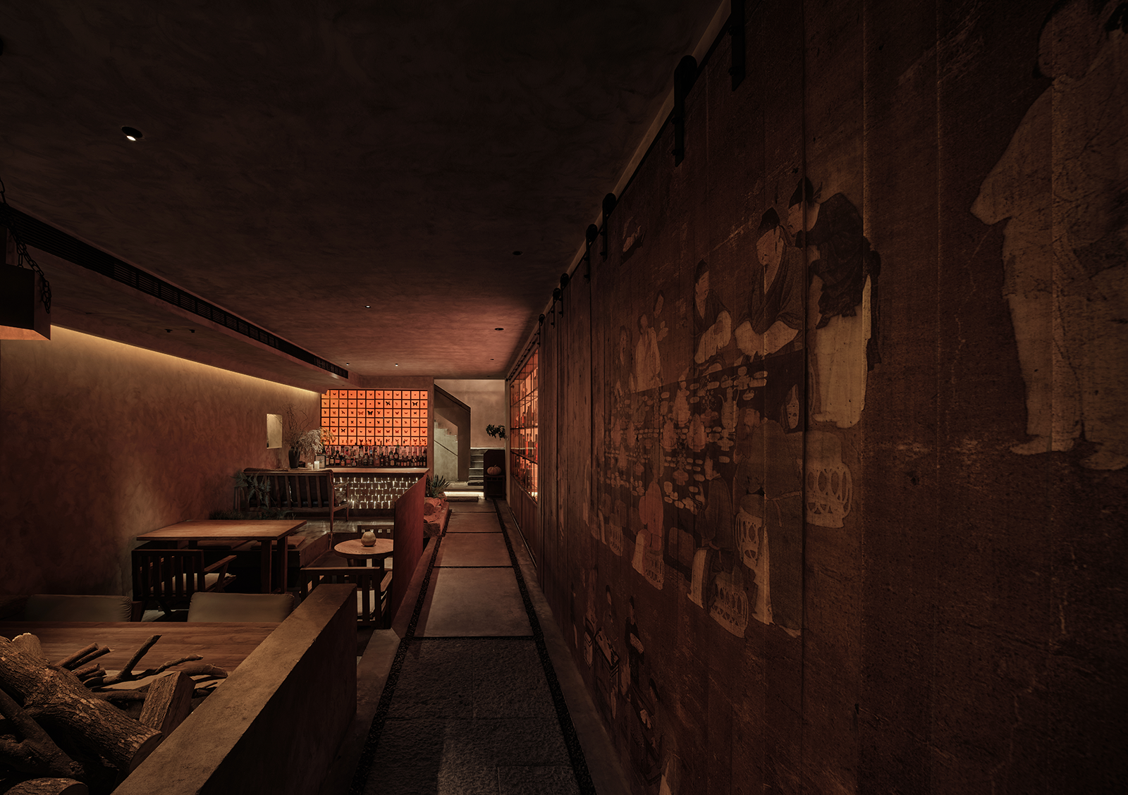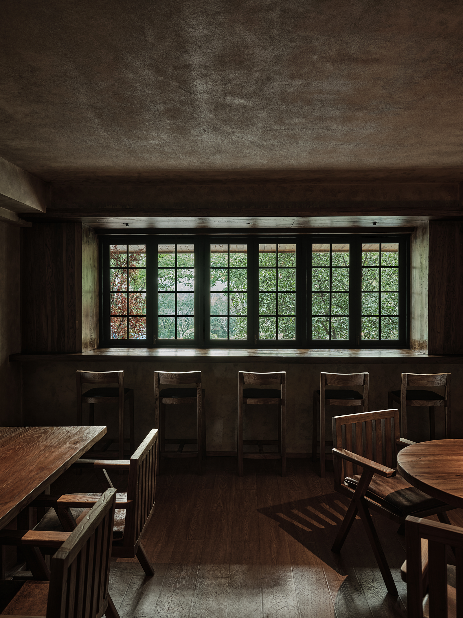 空间布局:餐厅的正餐部分与茶水吧区域虽然没用明确的划分,但基本上也是将一楼前厅区作为一个日茶夜酒的Bar空间。一楼既然以茶酒为主,考虑复合周边月湖与天一阁的风雅格调。我想起北宋赵佶《文会图》里描绘文士们围坐大桌宴饮畅谈的场景。恰巧本案室内,建筑可以下挖,结合错落地台,有可以席地而坐,也有布置矮凳,刚好也能形成一个围坐场景,与墙面老木板移门上的画面内容相呼应。考虑到茶饮散客为主,所以把山上锯来的木材堆在大桌子之中,邻座对面为陌生人时,可以隔绝部分视线。