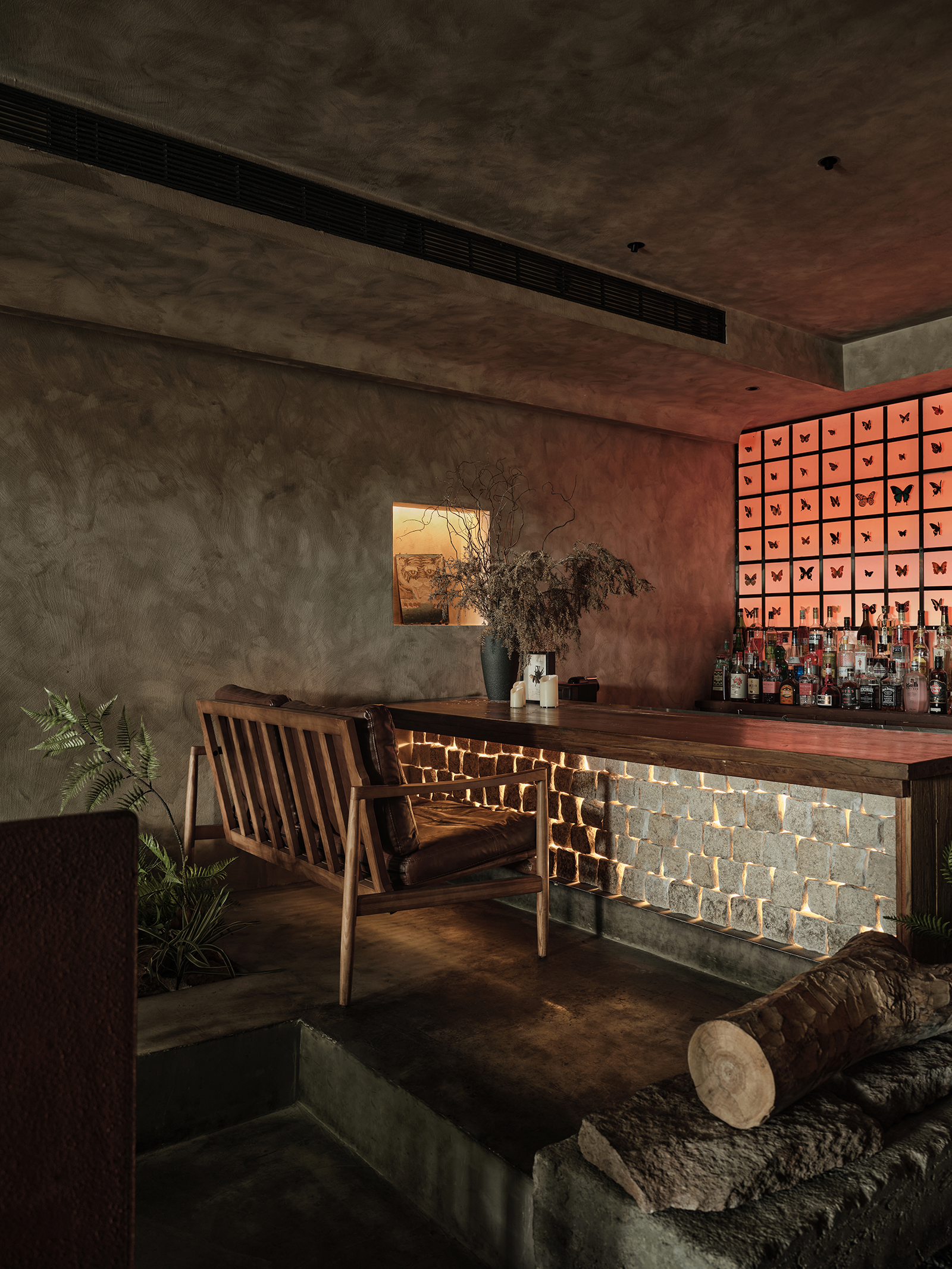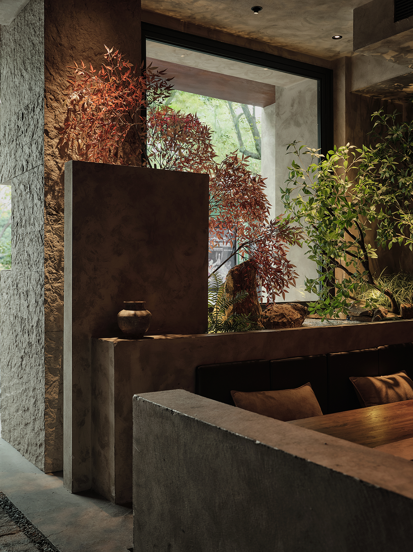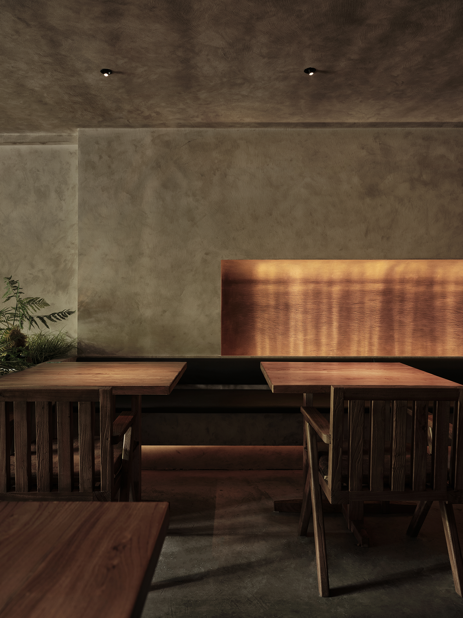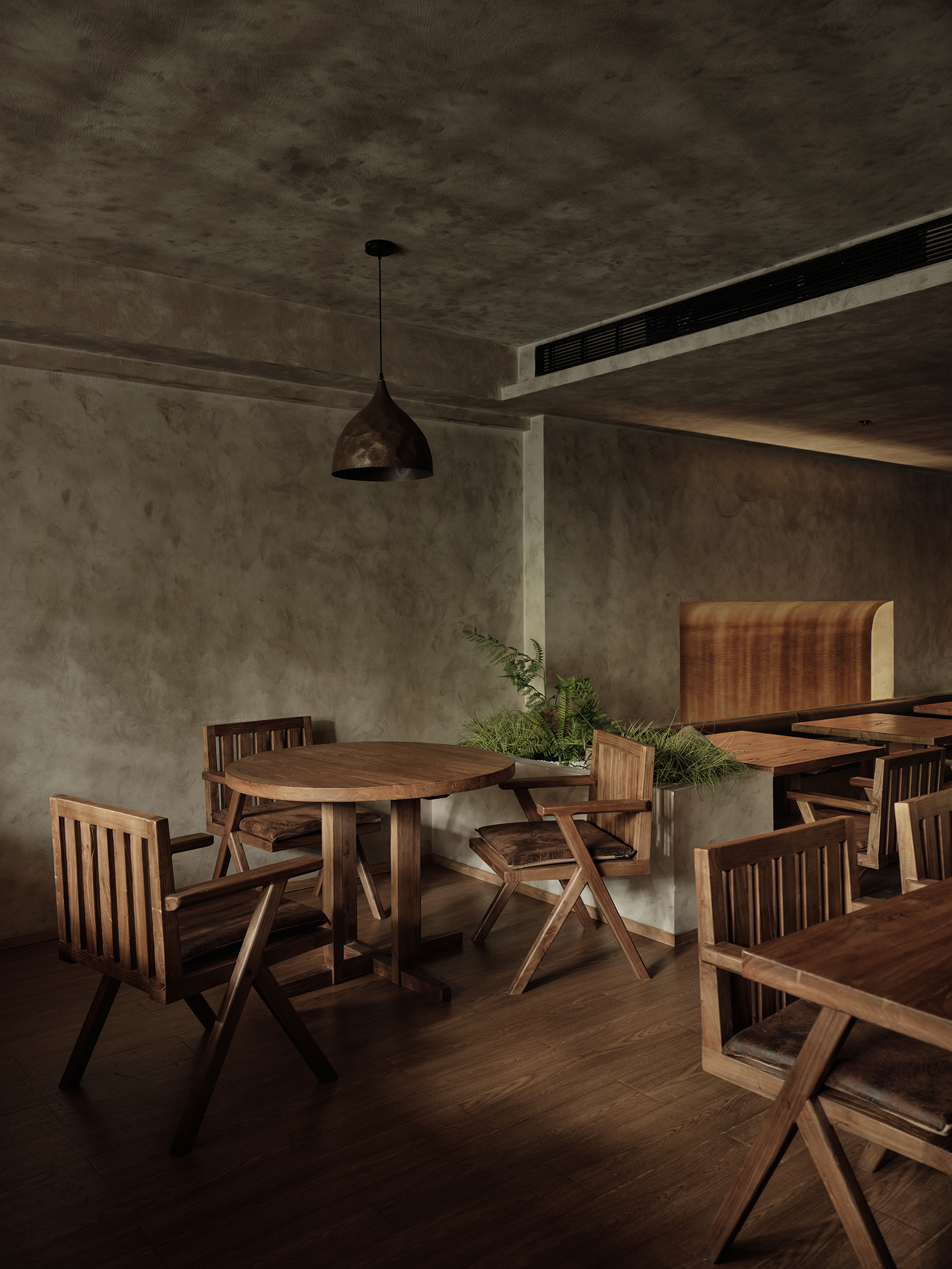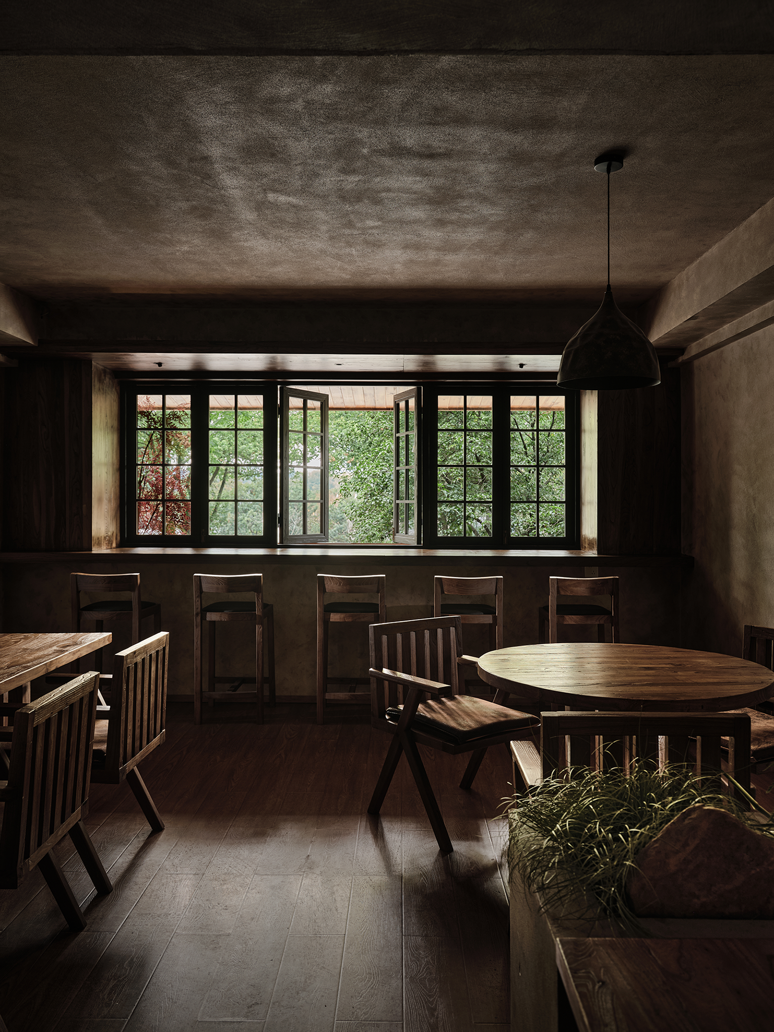 空间布局:餐厅的正餐部分与茶水吧区域虽然没用明确的划分,但基本上也是将一楼前厅区作为一个日茶夜酒的Bar空间。一楼既然以茶酒为主,考虑复合周边月湖与天一阁的风雅格调。我想起北宋赵佶《文会图》里描绘文士们围坐大桌宴饮畅谈的场景。恰巧本案室内,建筑可以下挖,结合错落地台,有可以席地而坐,也有布置矮凳,刚好也能形成一个围坐场景,与墙面老木板移门上的画面内容相呼应。考虑到茶饮散客为主,所以把山上锯来的木材堆在大桌子之中,邻座对面为陌生人时,可以隔绝部分视线。