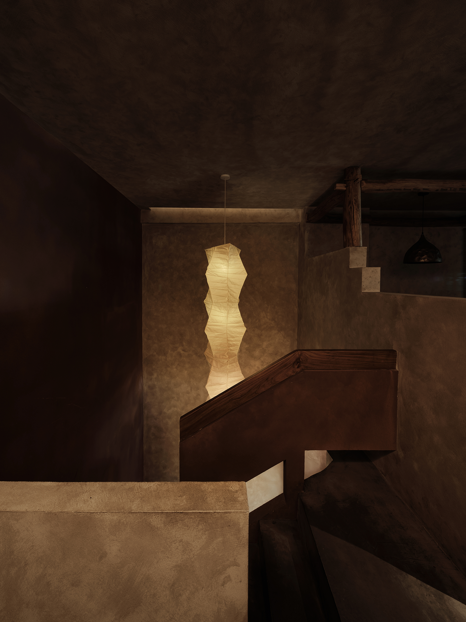 踏步上楼,楼梯处挂着一段长长的吊灯,用温暖的光源连接楼上楼下。