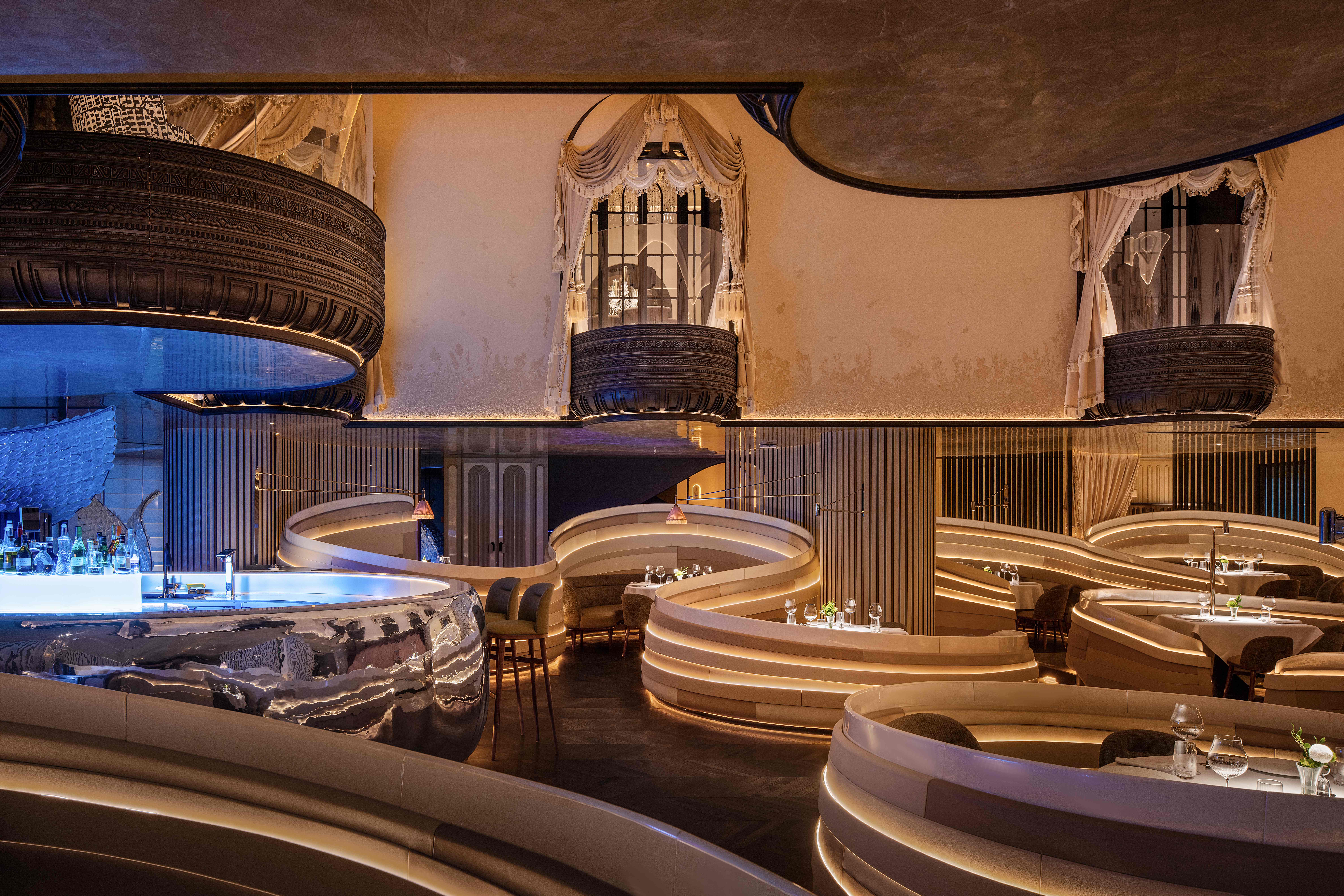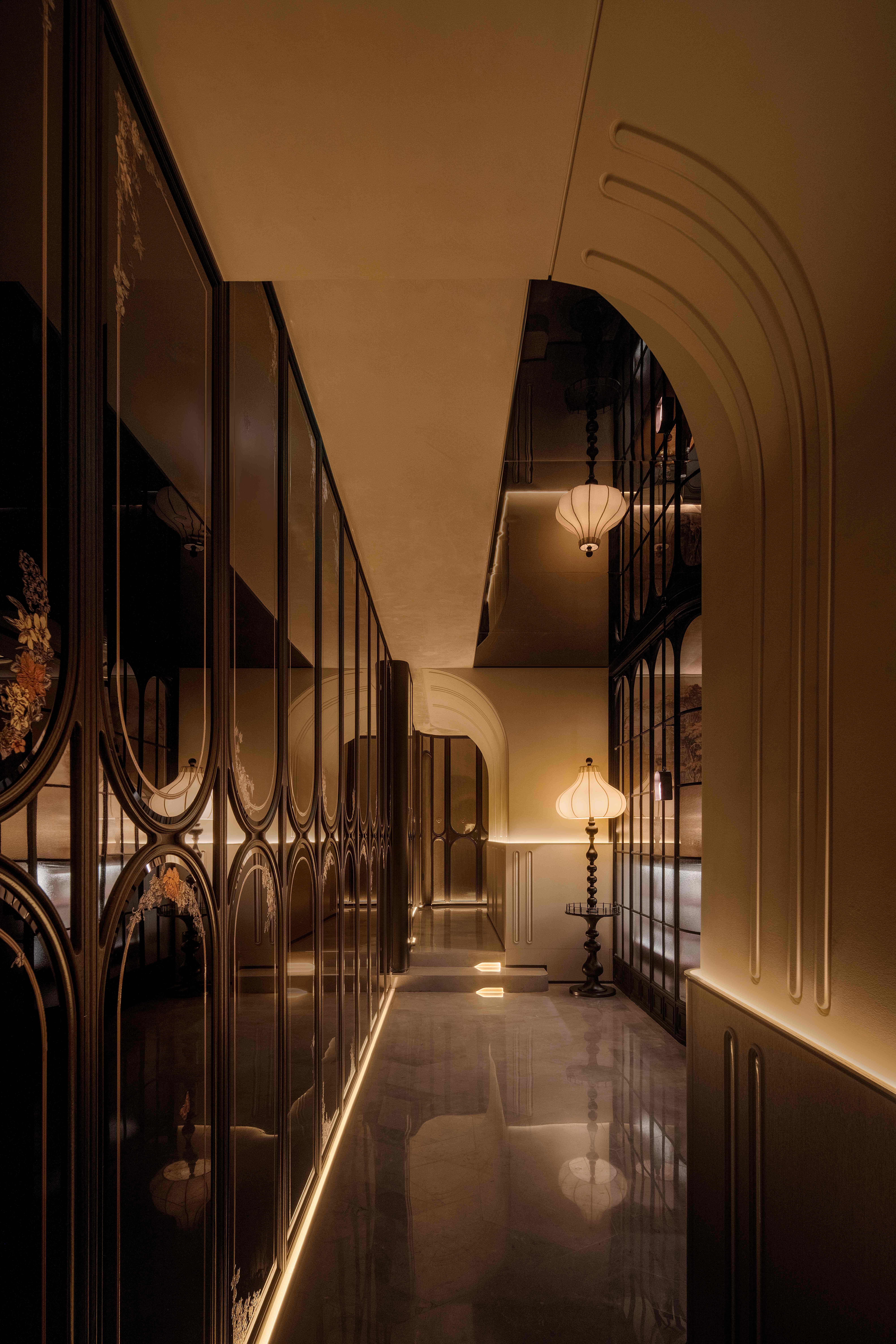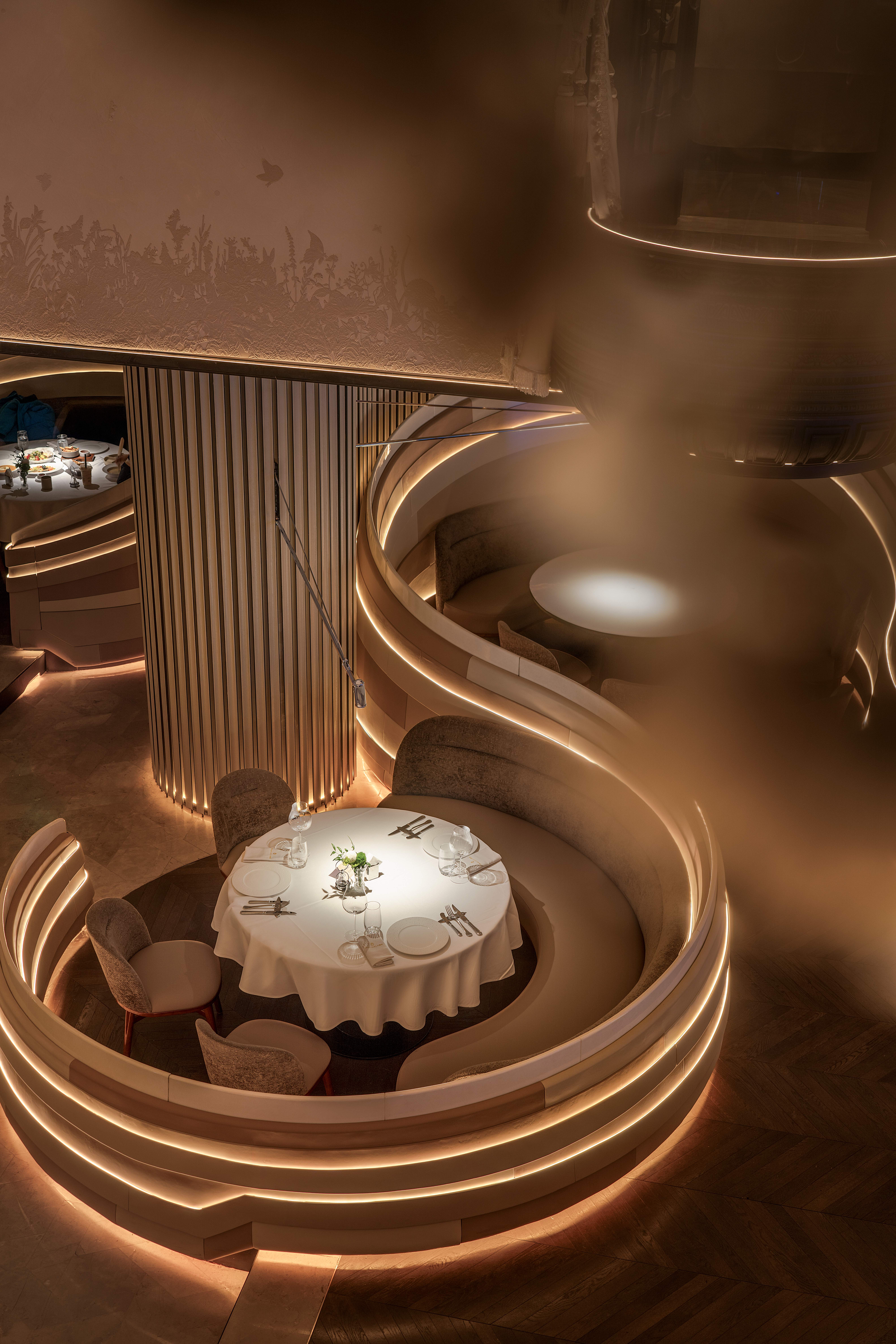空间布局:餐厅共三层,空间整体布局注重功能性与氛围感平衡,呼应天鹅湖的灵动形态。公共用餐区以曲线卡座、弧形隔断模拟湖水涟漪,打破规整边界,营造自由舒展的就餐氛围。双层挑高区域如天鹅栖息的开阔湖面,上方帷幔似湖面轻烟,二楼包房则像湖中小岛,借半围合结构形成私密又关联的空间层次,让食客在不同区域,都能感知 “湖” 的延展与变化,串联起漫游天鹅湖的空间体验。