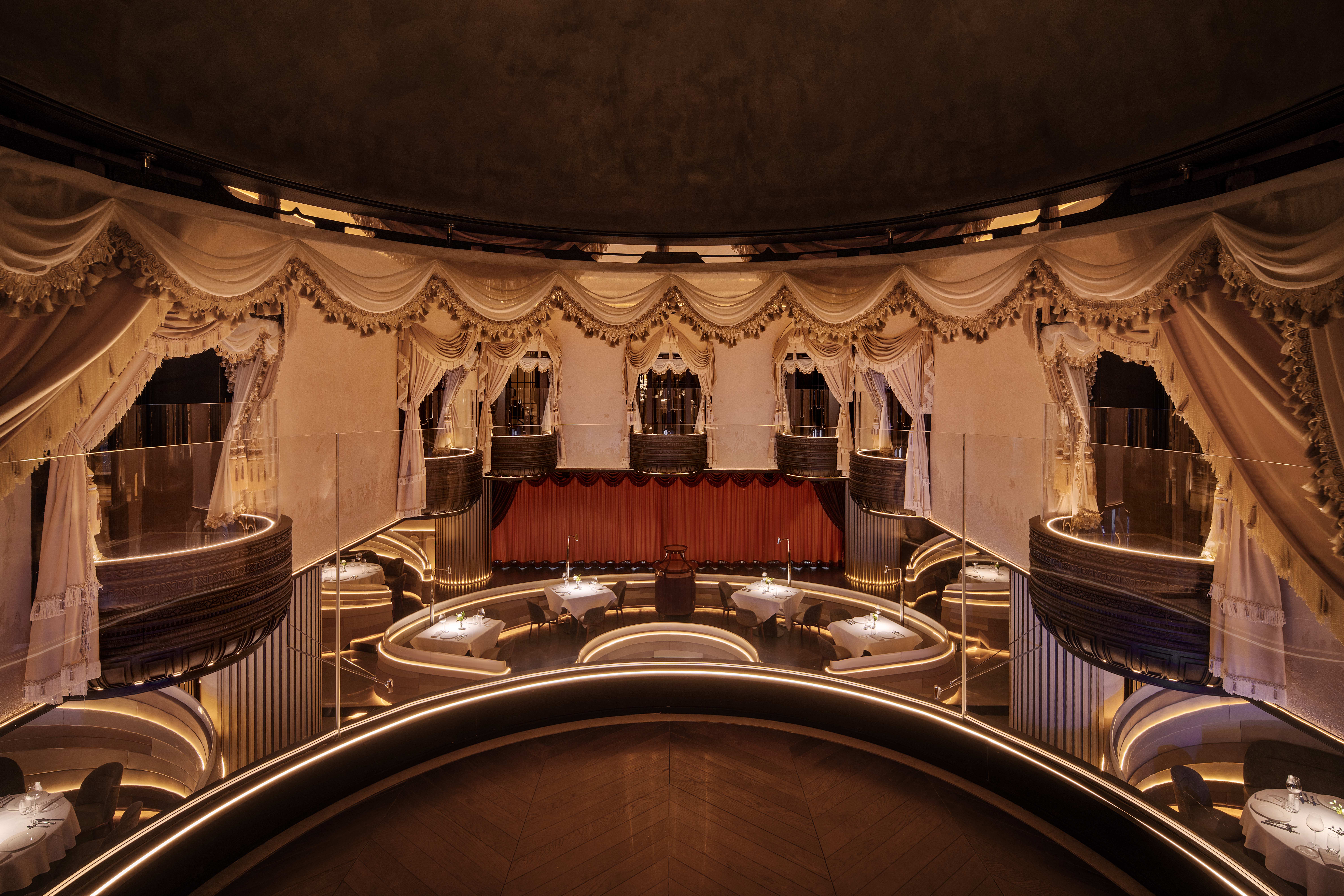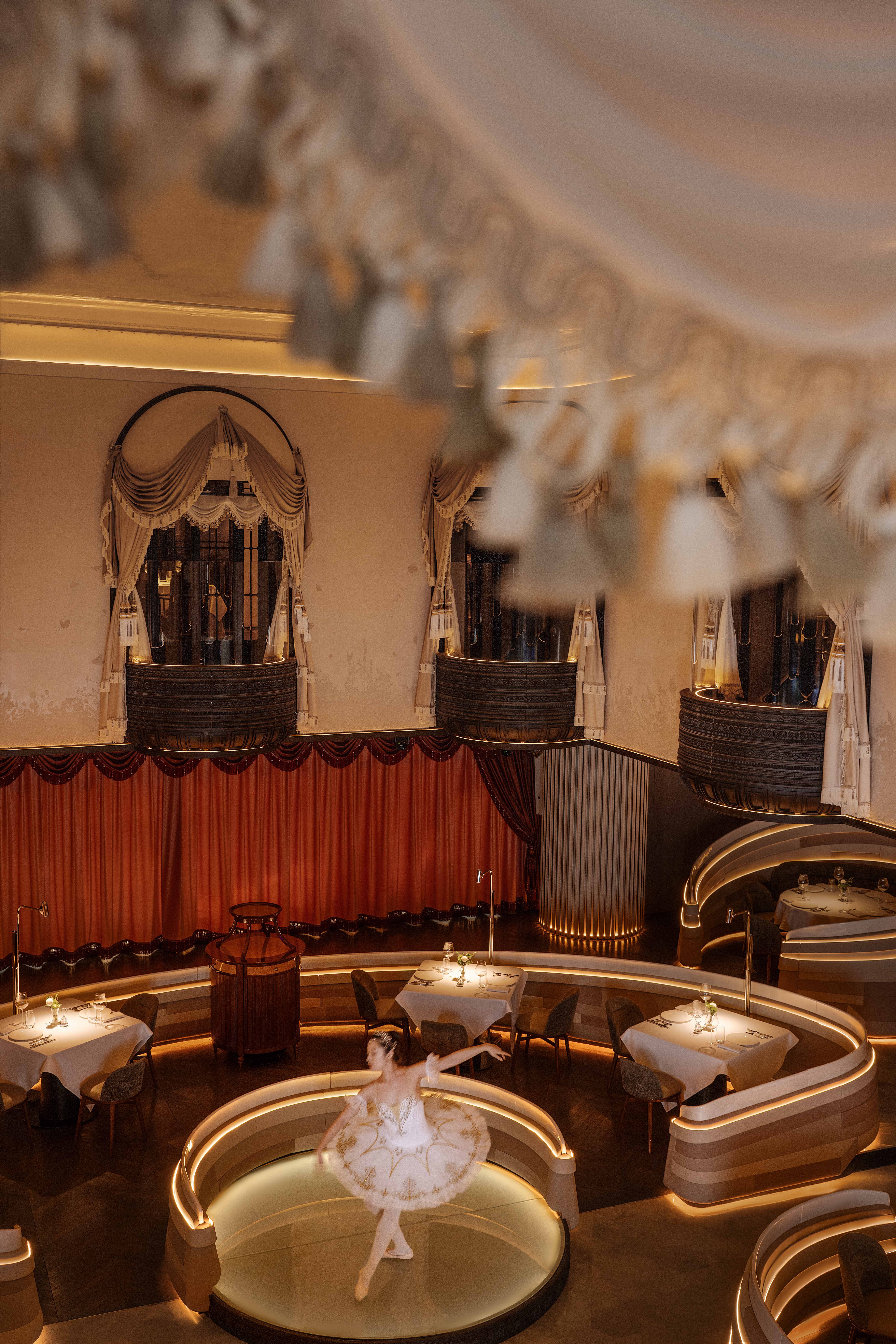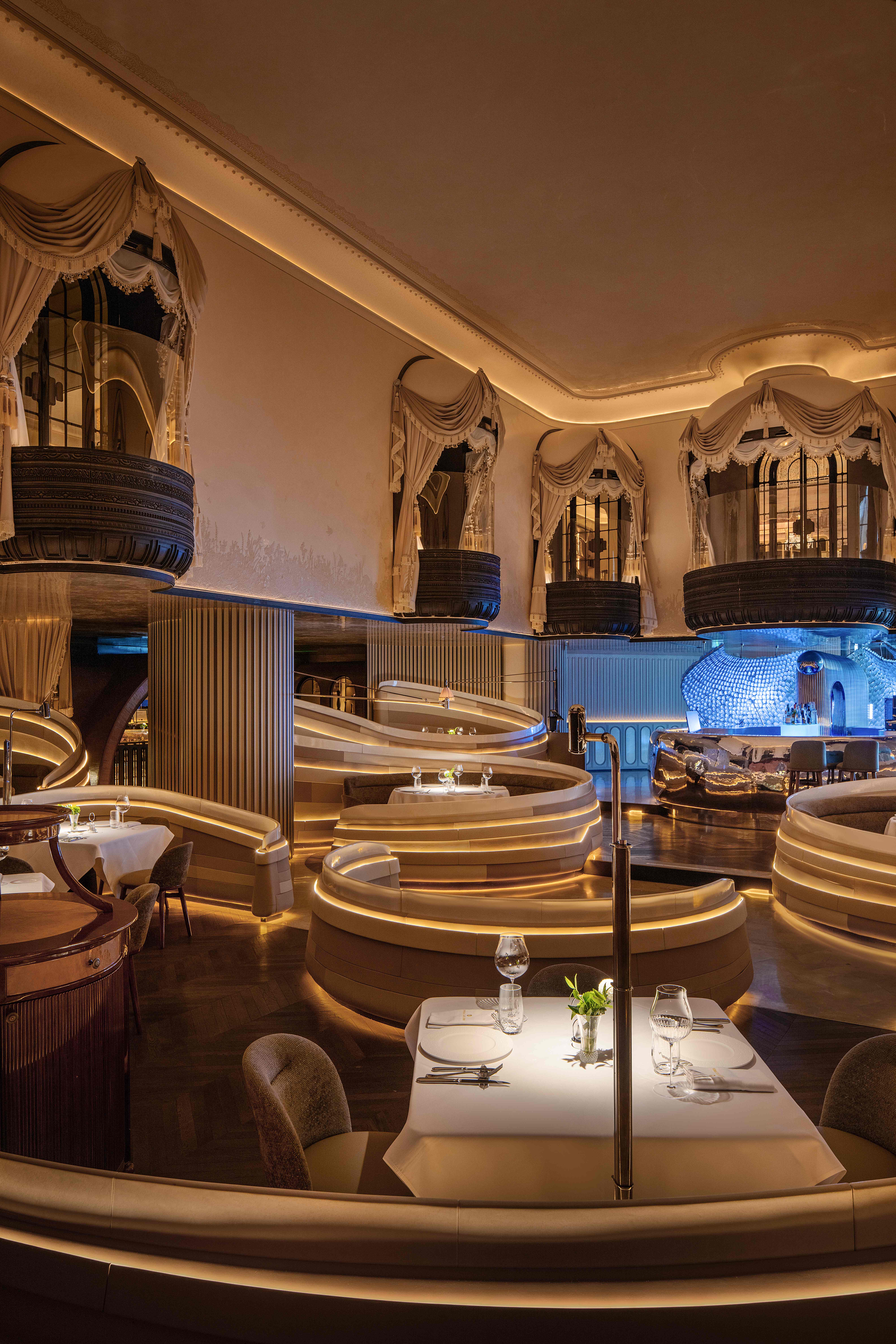 空间布局:餐厅共三层,空间整体布局注重功能性与氛围感平衡,呼应天鹅湖的灵动形态。公共用餐区以曲线卡座、弧形隔断模拟湖水涟漪,打破规整边界,营造自由舒展的就餐氛围。双层挑高区域如天鹅栖息的开阔湖面,上方帷幔似湖面轻烟,二楼包房则像湖中小岛,借半围合结构形成私密又关联的空间层次,让食客在不同区域,都能感知 “湖” 的延展与变化,串联起漫游天鹅湖的空间体验。