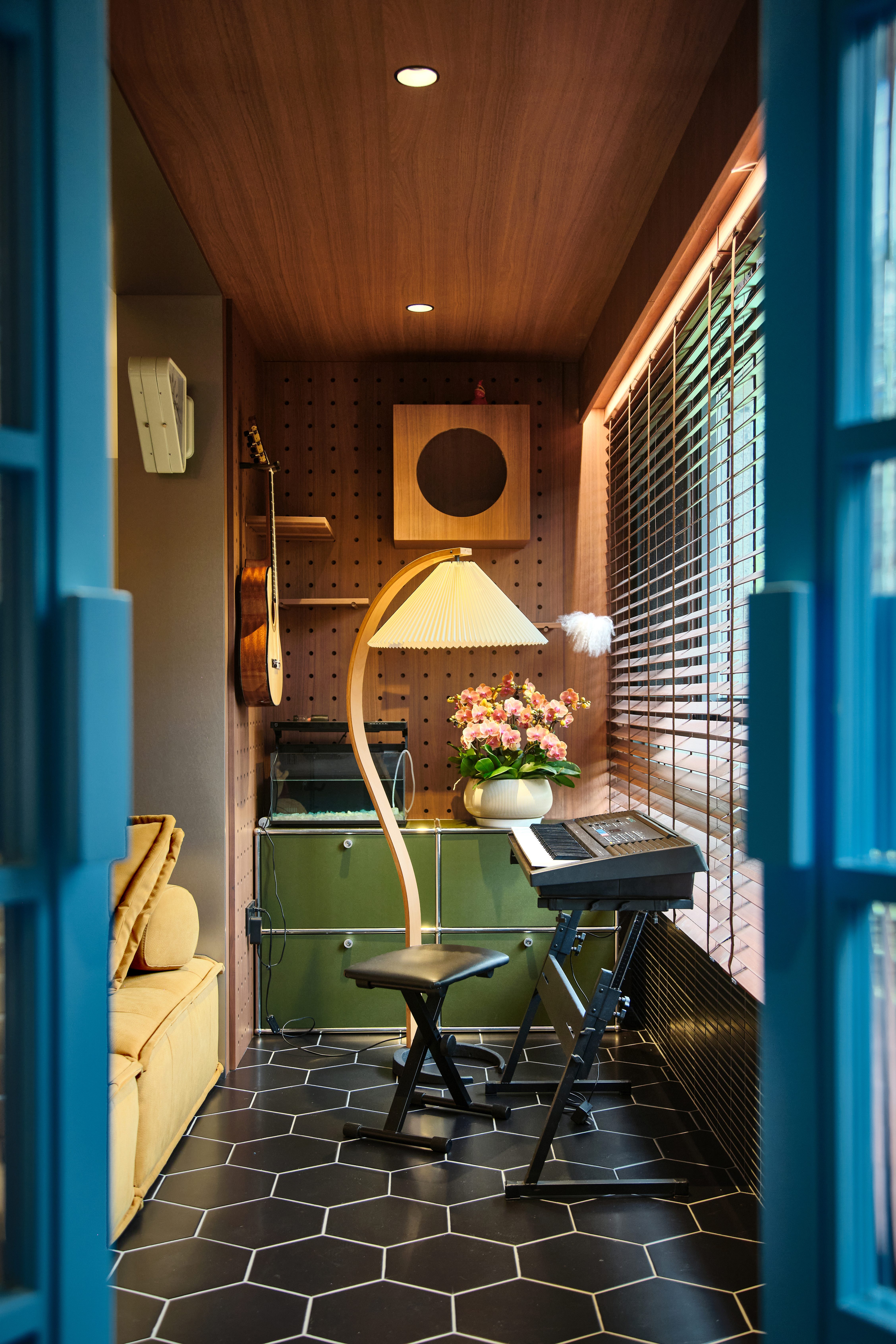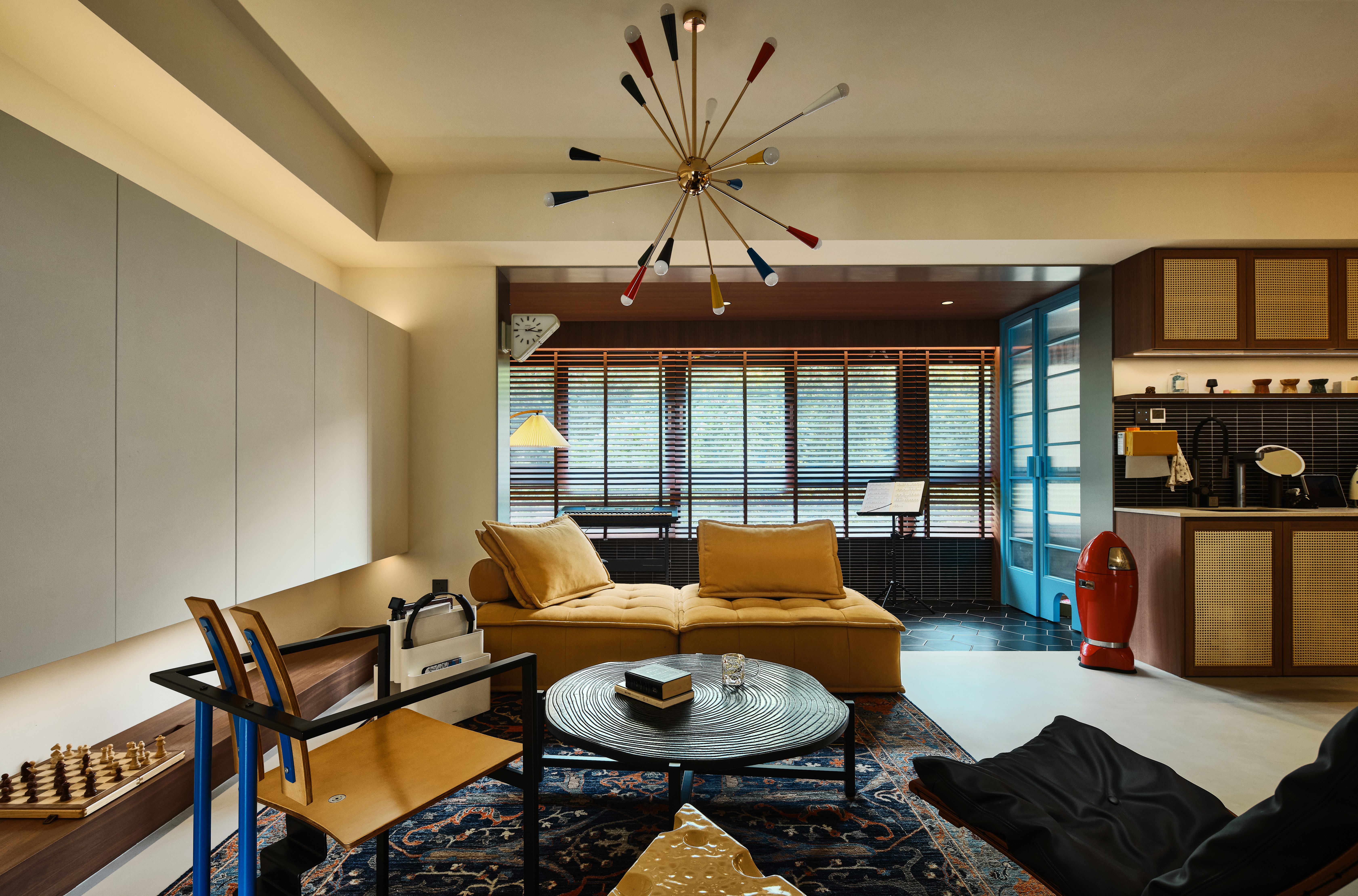 空间布局:我们将客餐厅空间最大化,拆除了原先客餐厅之间的门,但原先的阳台洗衣区不能暴露在开放空间,同时还要满足女业主练习瑜伽的需求,所以我们将洗衣区和瑜伽区通过两扇湖水蓝色的玻璃隔开,做成可分可和的空间。