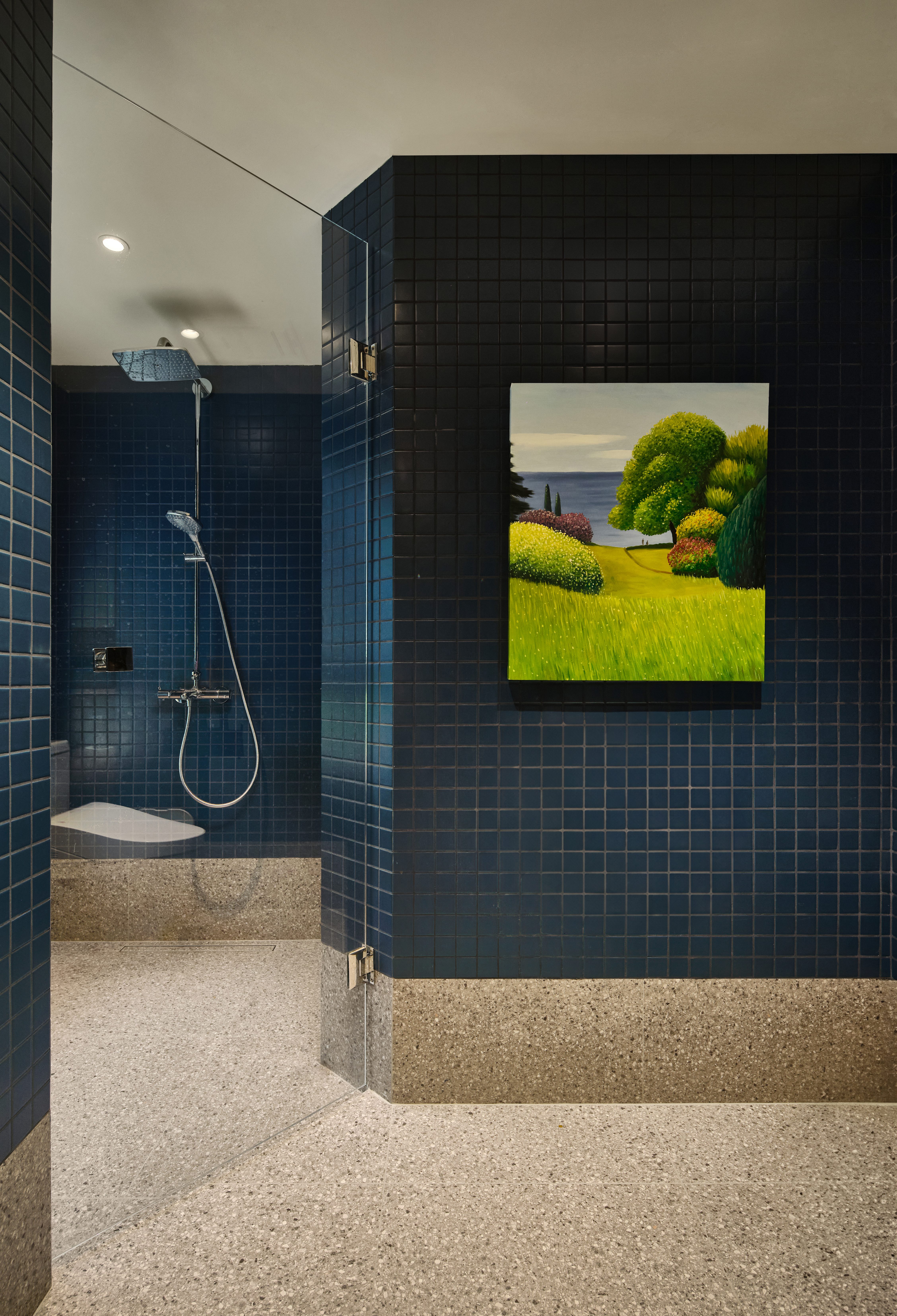 设计选材:整体是地面在原来硬装的地面地砖表面做的pandomo材质,没有对原来硬装的地面进行大面积拆除,墙面是做的艺术涂料,在阳台空间做了湖水蓝色的跳色以及一些深色的空间,强化业主的个性与品位。