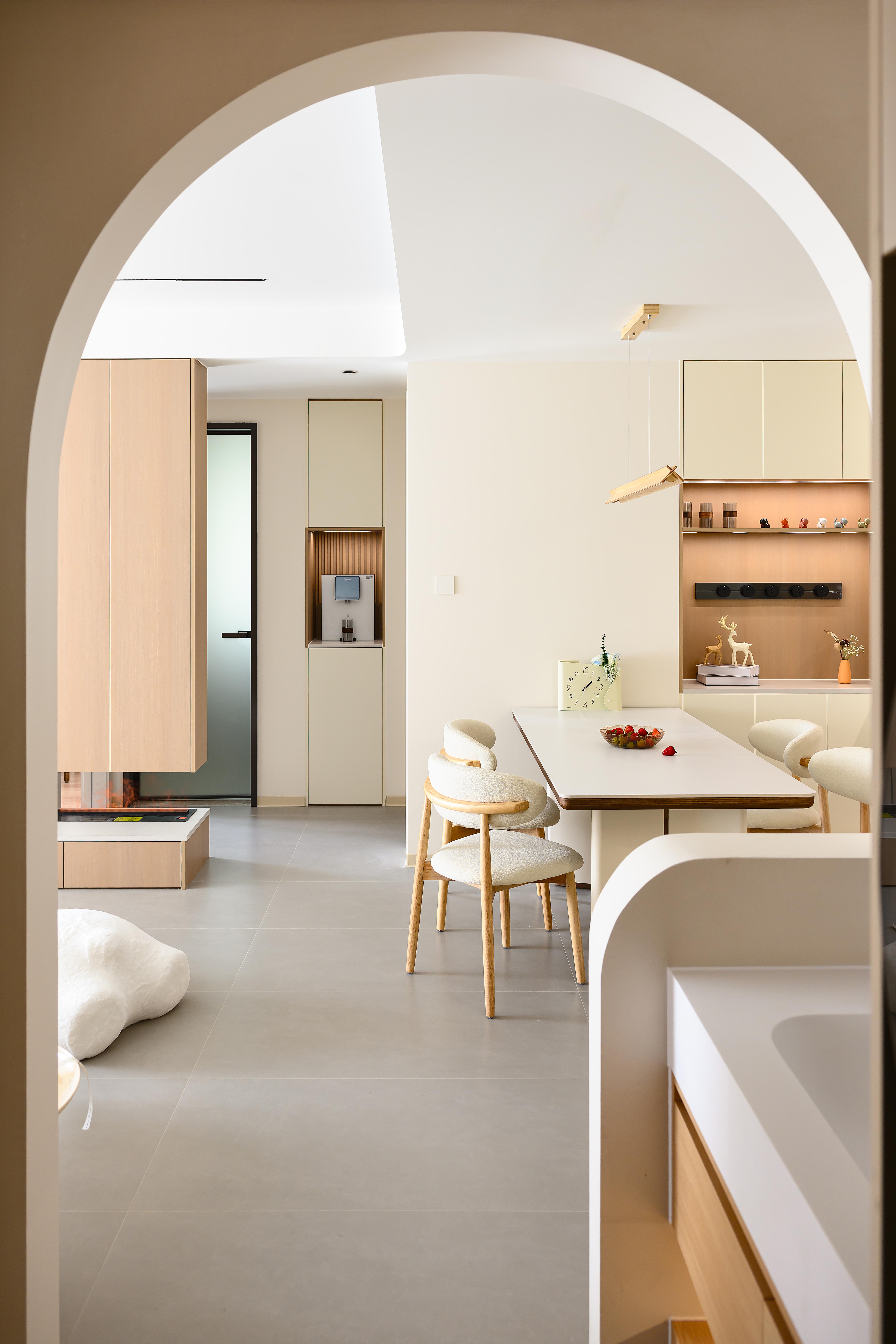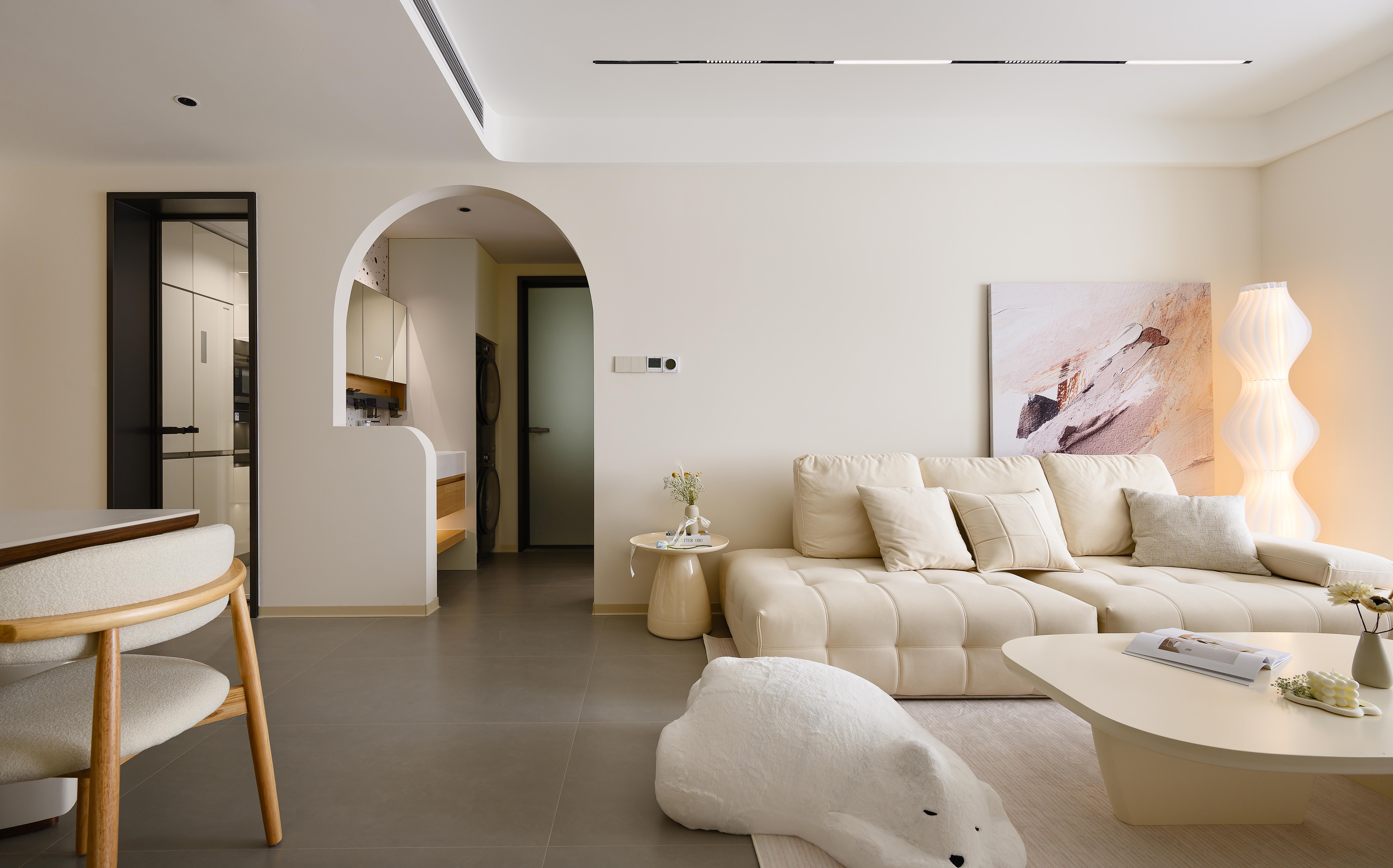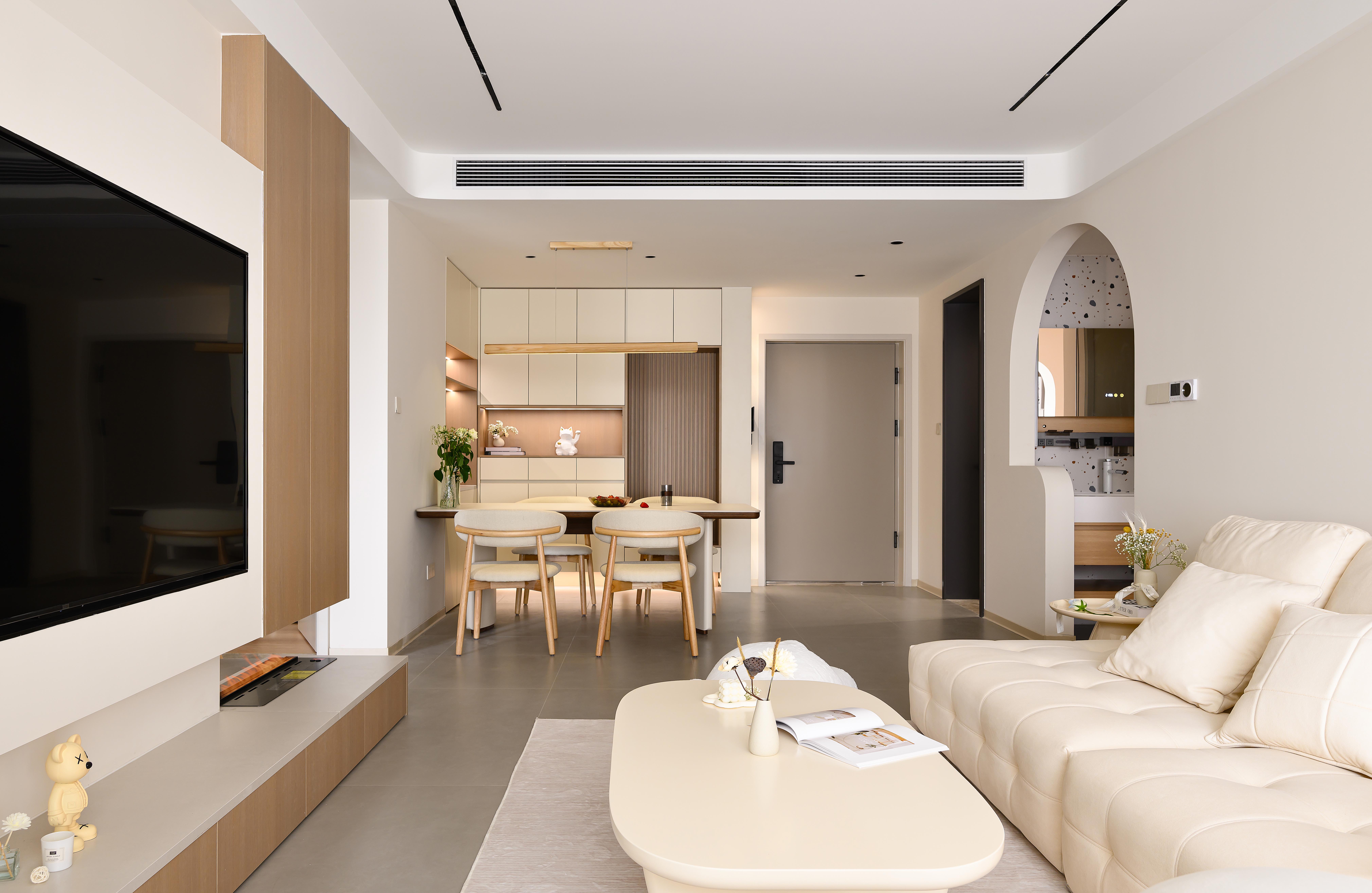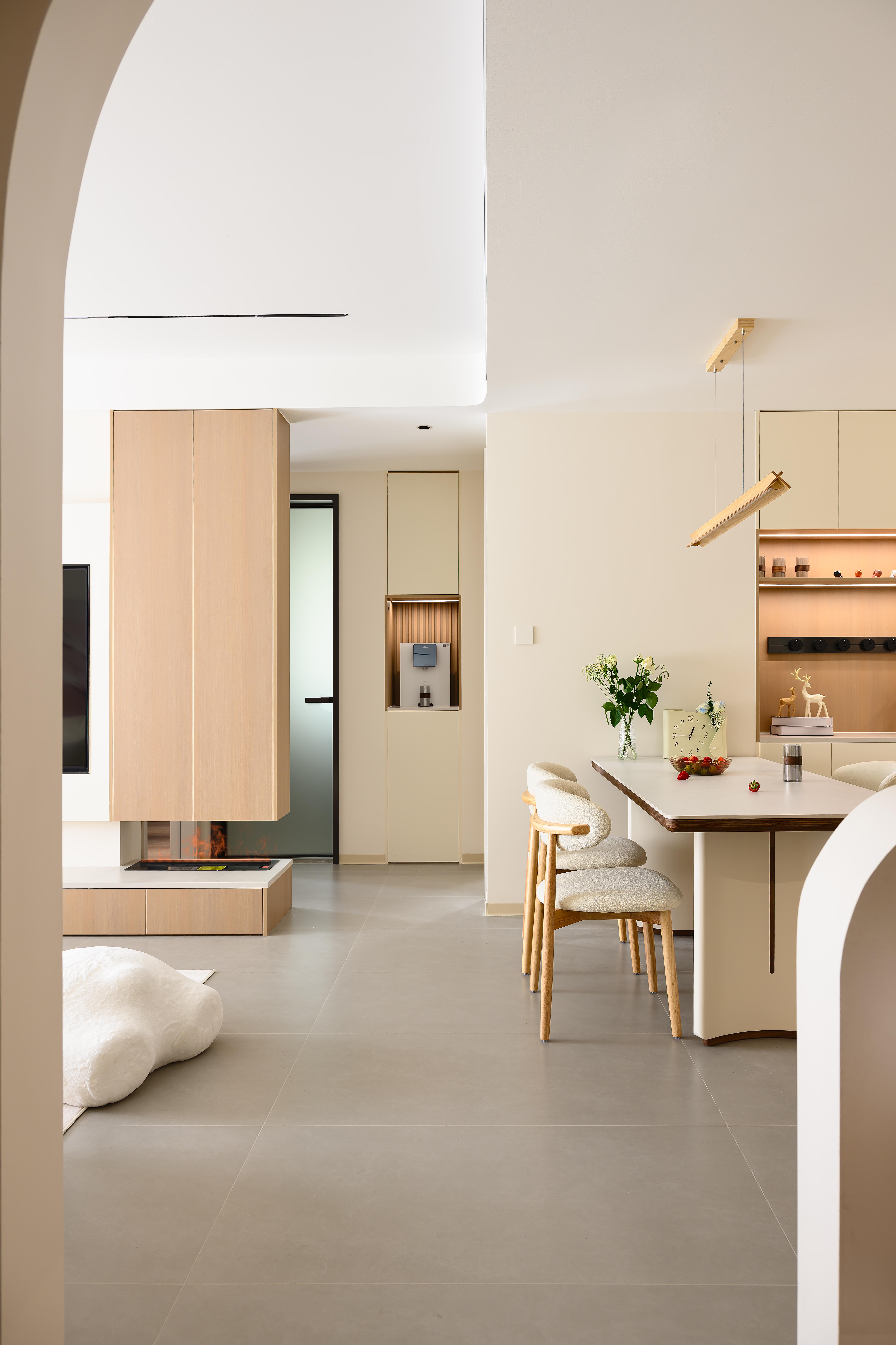 空间意境:采用客餐厅一体化开放式布局,打破空间边界,增强空间通透感,以弧形拱门为设计亮点,柔化直角线条的硬朗感,赋予空间灵动韵律,同时自然引导视线延伸,让各功能区过渡更流畅,营造无界却有序的居住体验,以米白色、浅木色为基础色调,构建低饱和度色彩体系,包裹空间的同时消解视觉压迫。