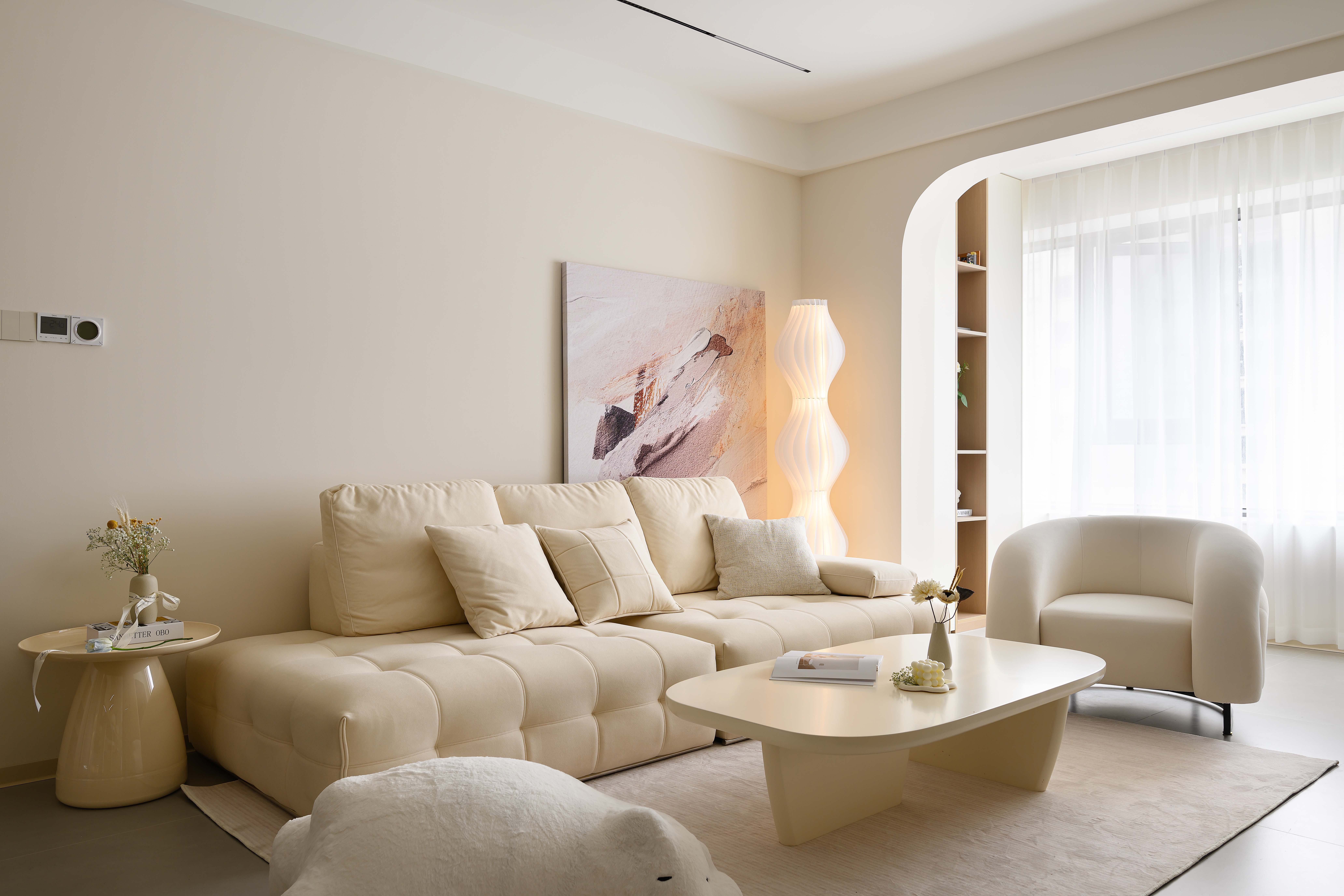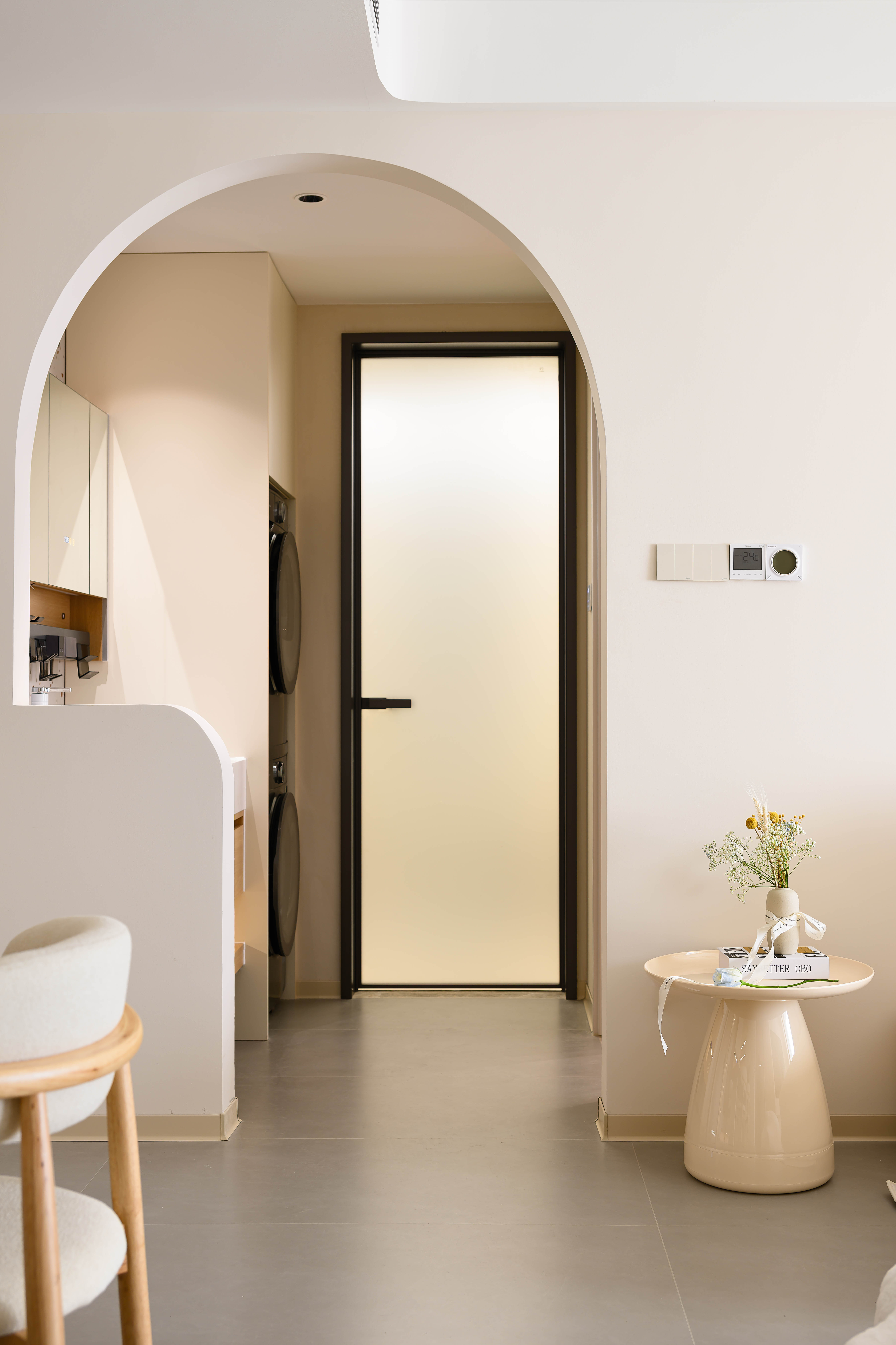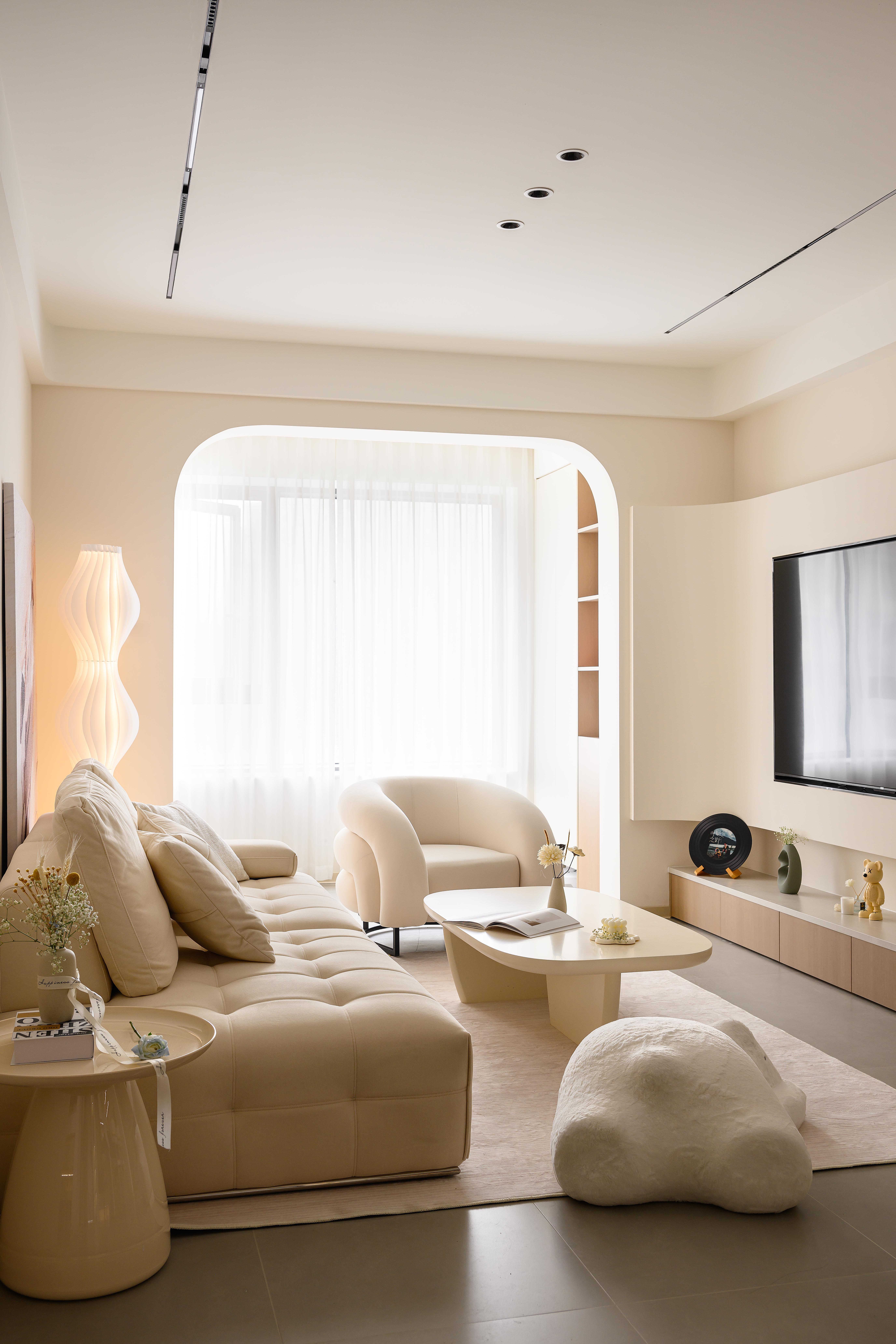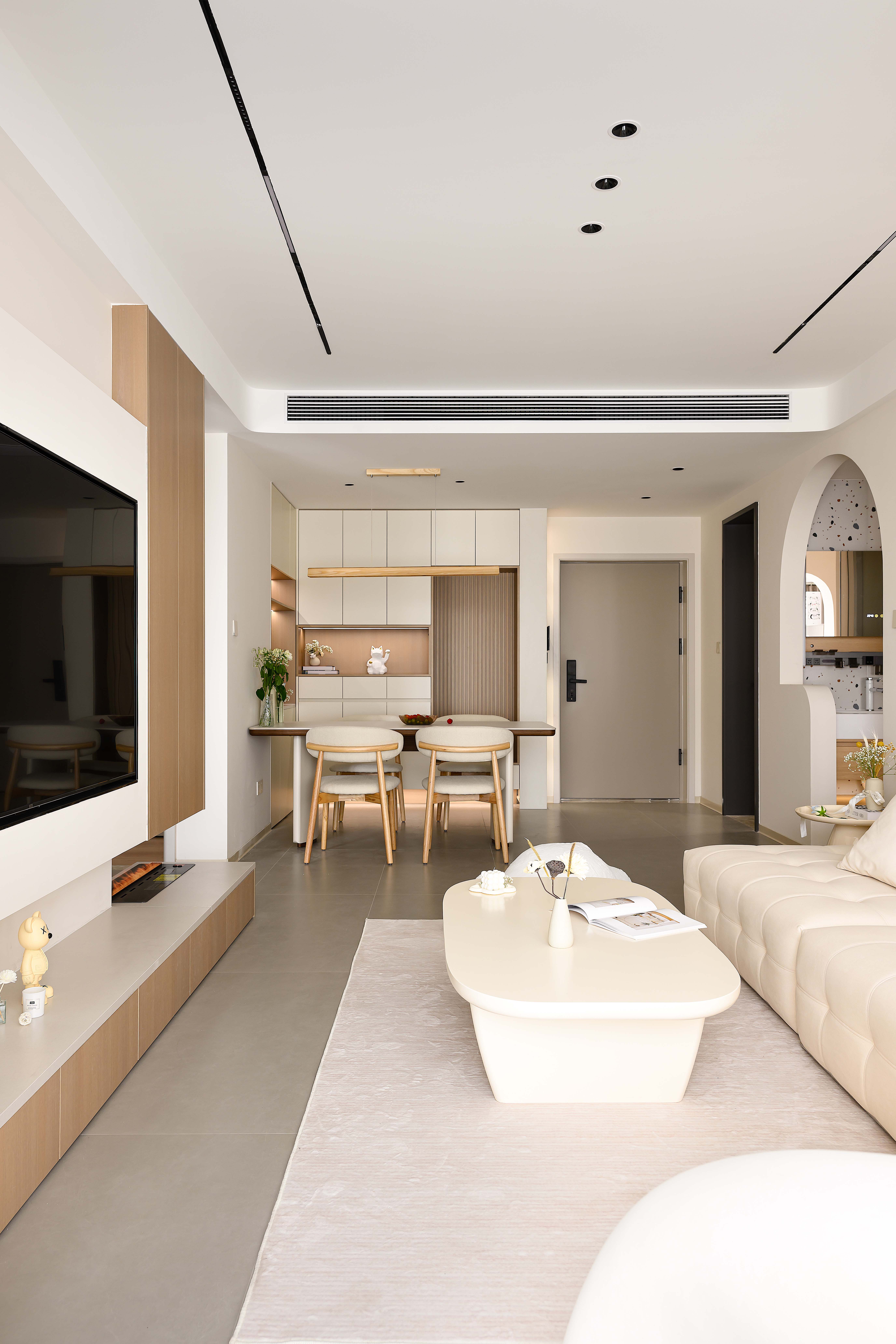 空间意境:采用客餐厅一体化开放式布局,打破空间边界,增强空间通透感,以弧形拱门为设计亮点,柔化直角线条的硬朗感,赋予空间灵动韵律,同时自然引导视线延伸,让各功能区过渡更流畅,营造无界却有序的居住体验,以米白色、浅木色为基础色调,构建低饱和度色彩体系,包裹空间的同时消解视觉压迫。