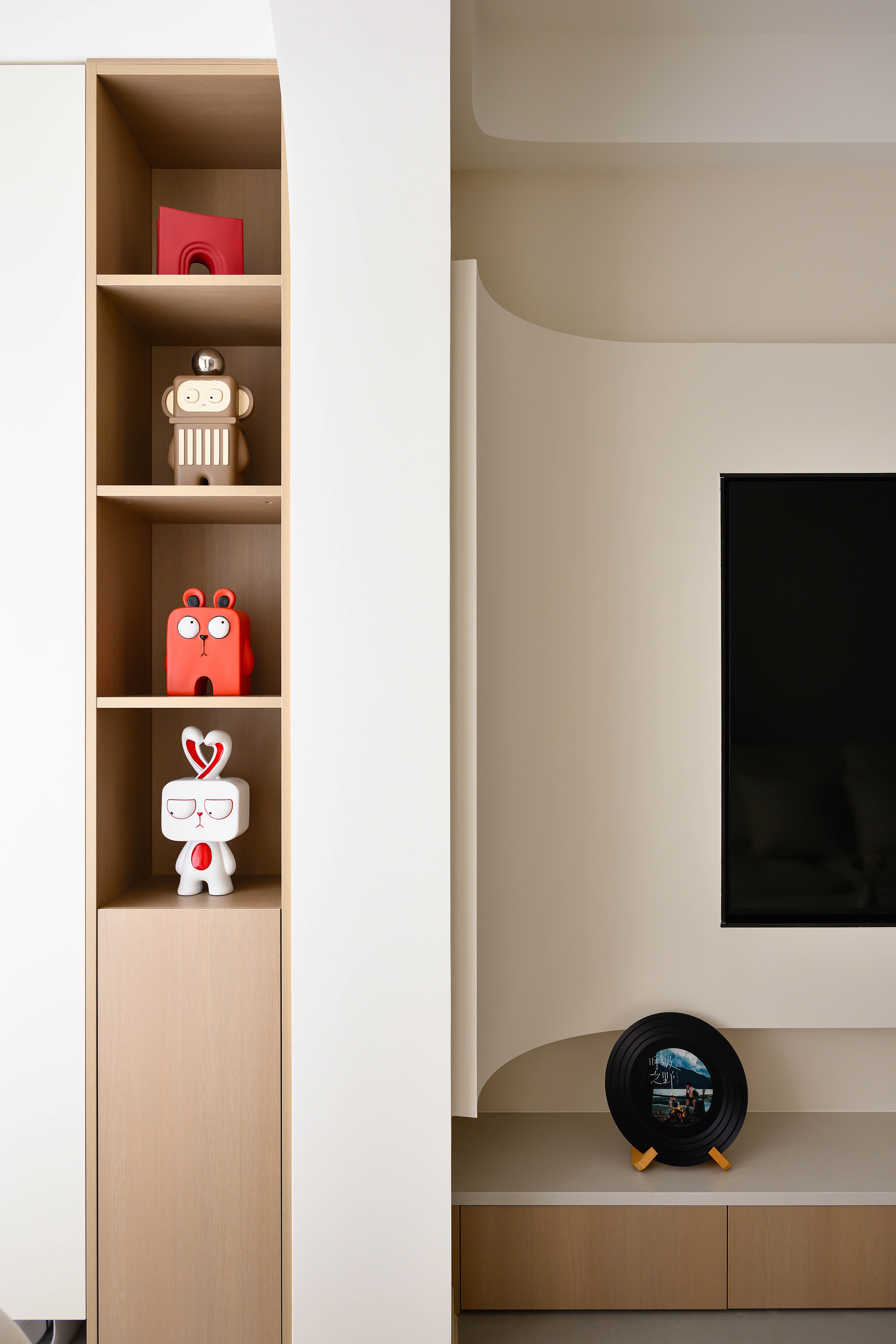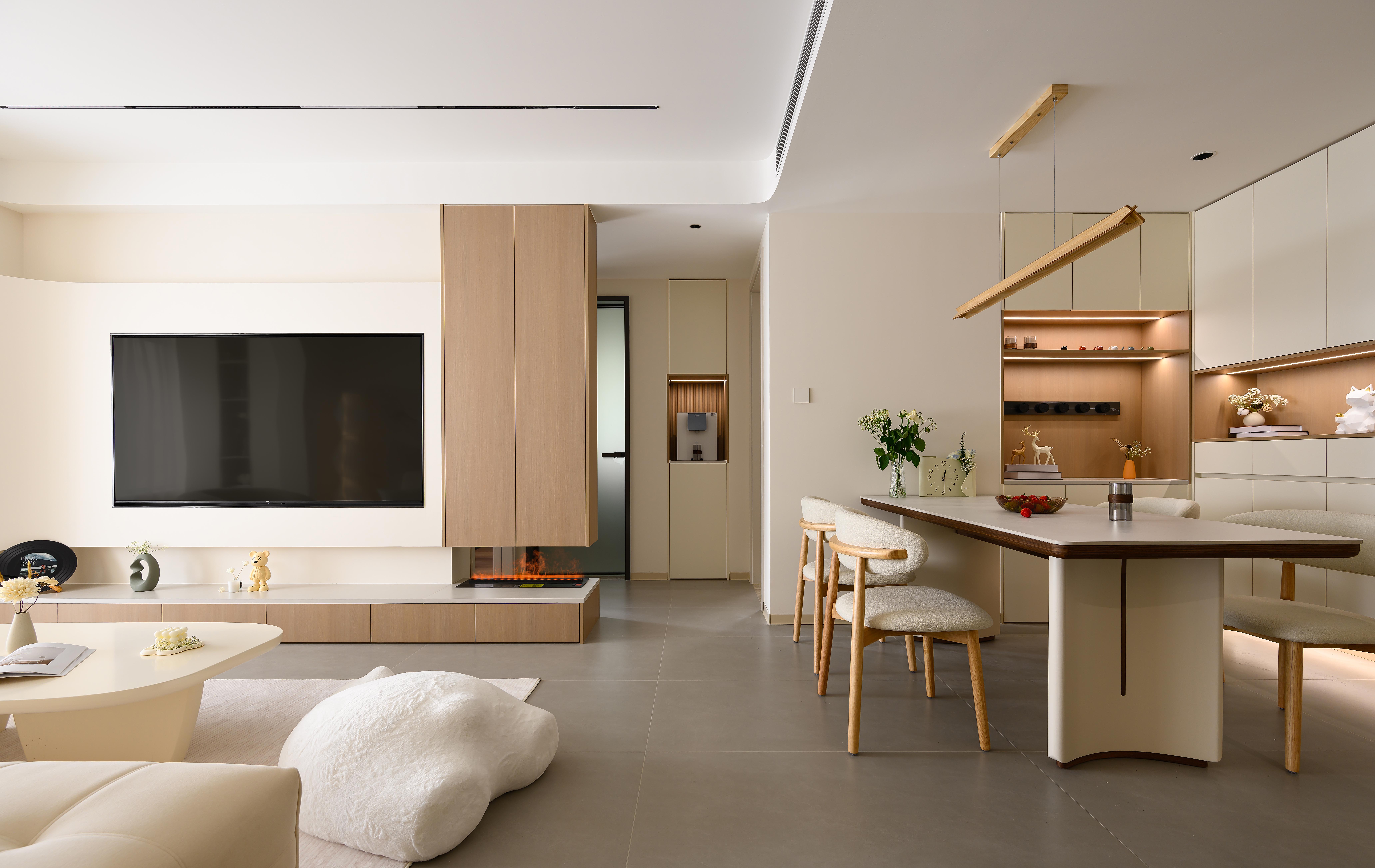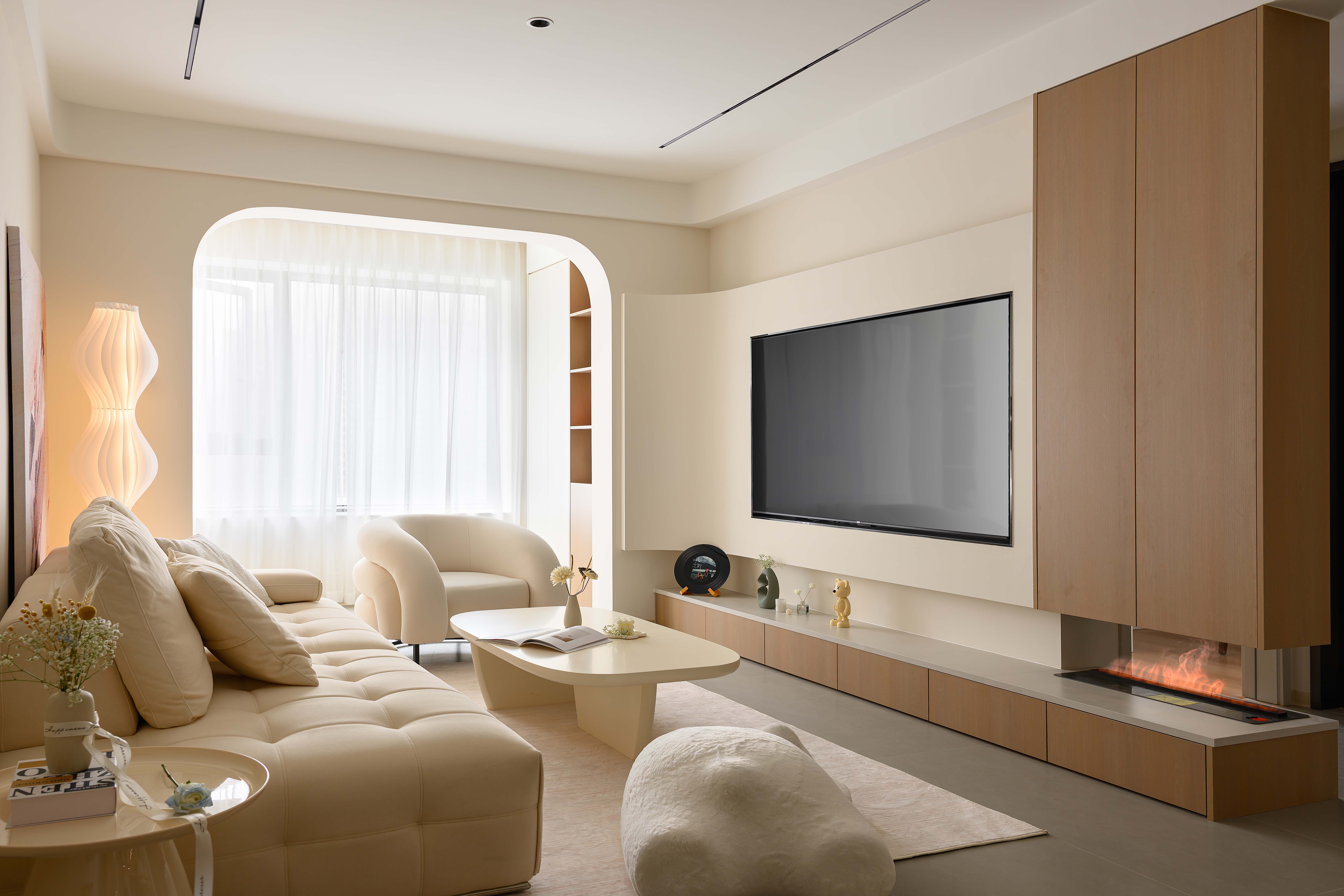 空间布局:浅木色柜体、家具则注入自然温度,从视觉到心理传递治愈感,适配现代都市人对归家即放空的需求。柜体、装饰板选用浅木材质,以自然纹理传递质朴感,平衡奶油色的柔和,增添空间层次。云朵沙发、抱枕等布艺家具,以亲肤触感强化包裹感,呼应场景的治愈主题,线性灯、筒灯嵌入天花,避免强光直射,营造柔光包裹的温馨感。艺术挂画的画布肌理、仿真火焰壁炉的金属质感,通过材质对比丰富视觉层次,让简约不单调,提升空间艺术格调。