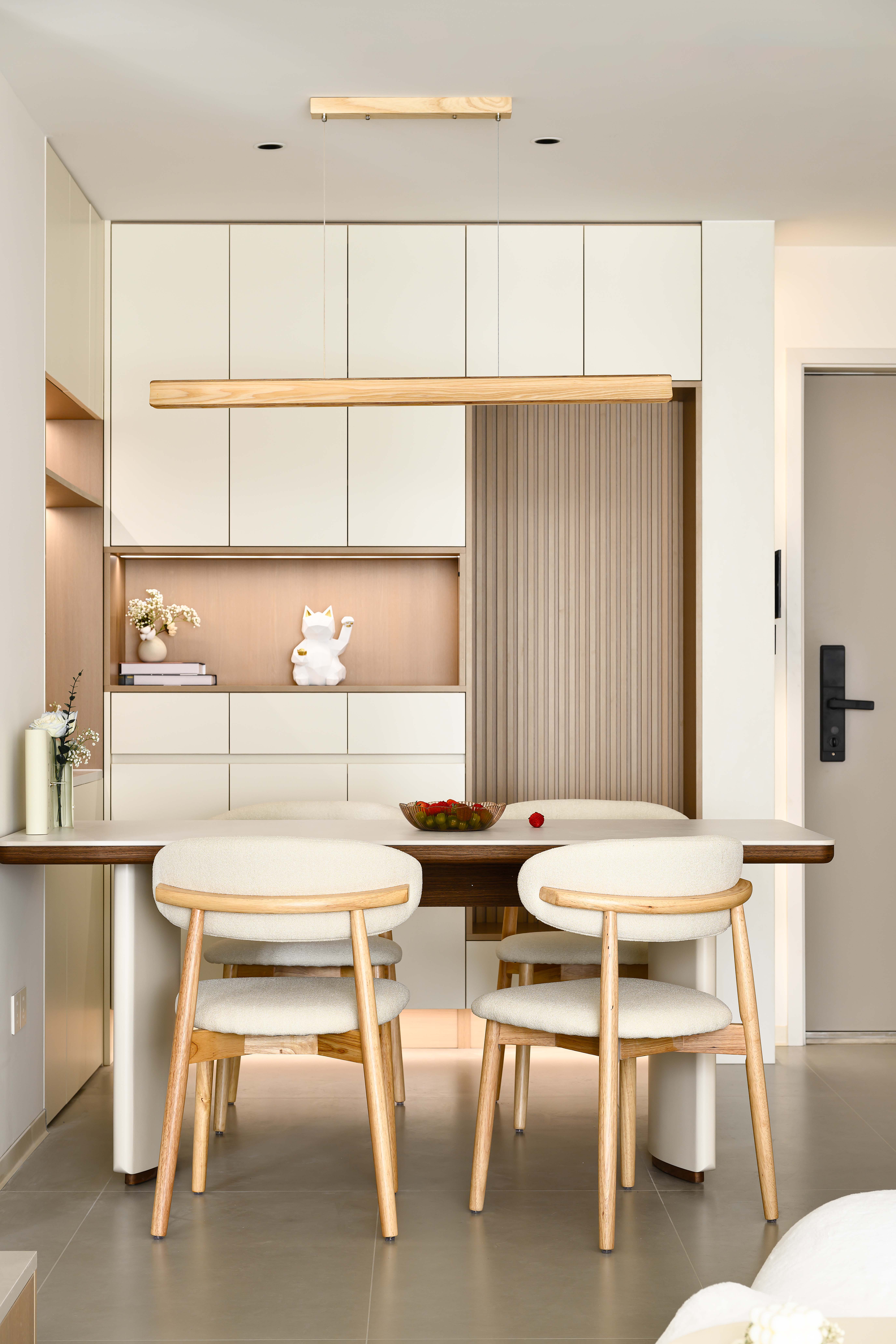项目定位:云絮间设计以现代原木奶油风为核心基调,围绕“自然、舒适、治愈”的理念,通过空间布局、色彩材质、灯光细节的协同设计,打造兼具美学与实用性的温馨居所,诠释松弛感与烟火气并存的生活美学。