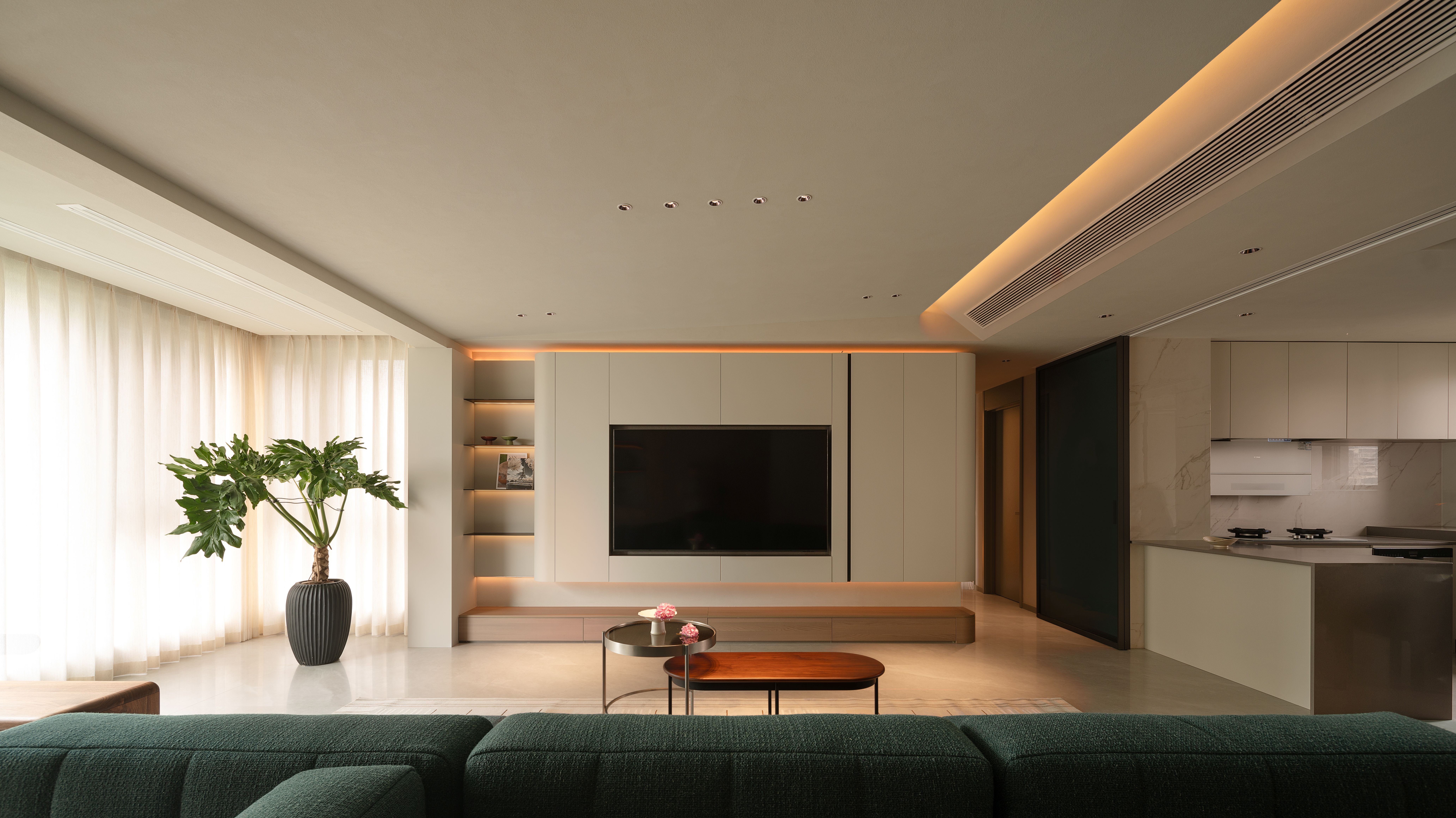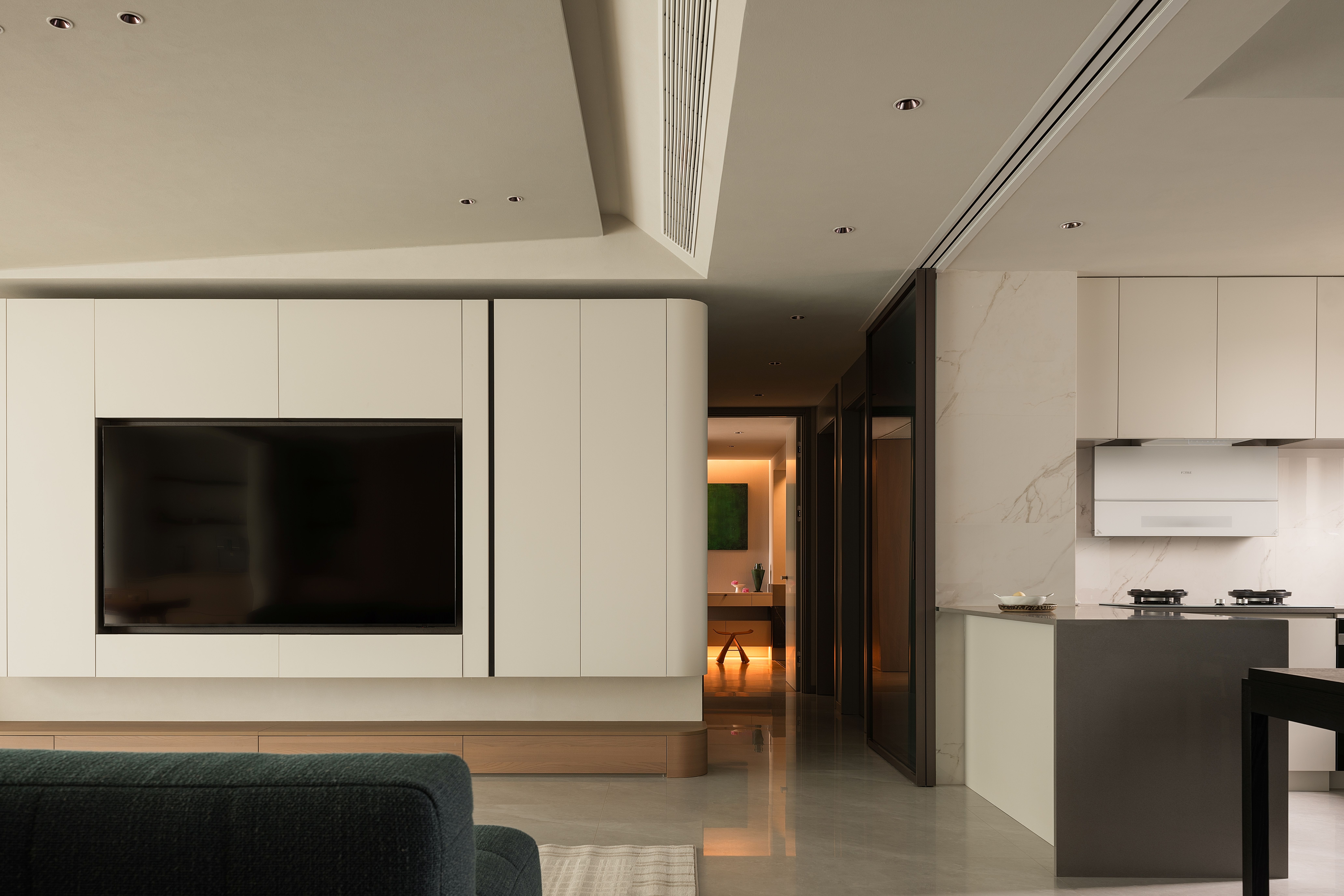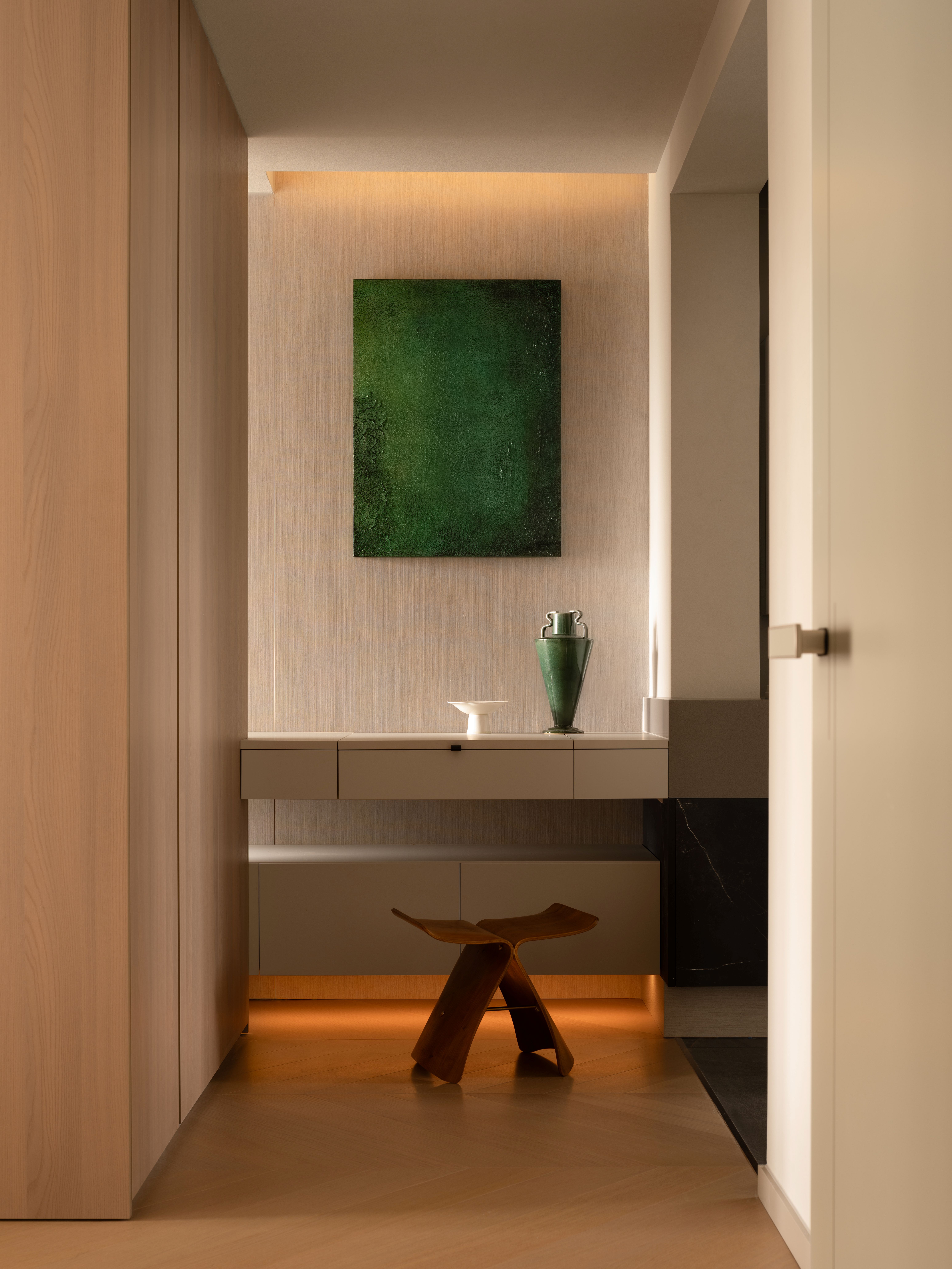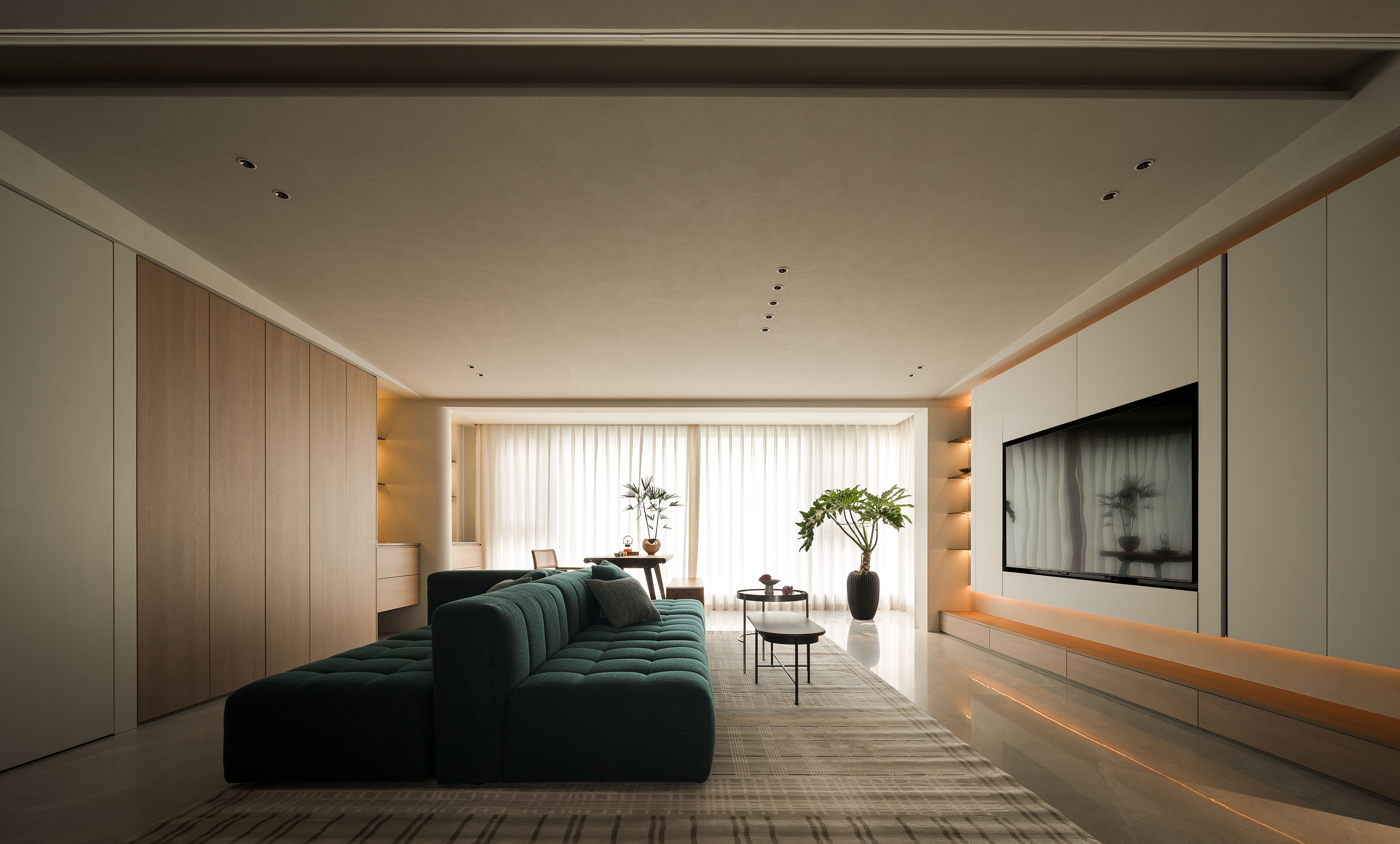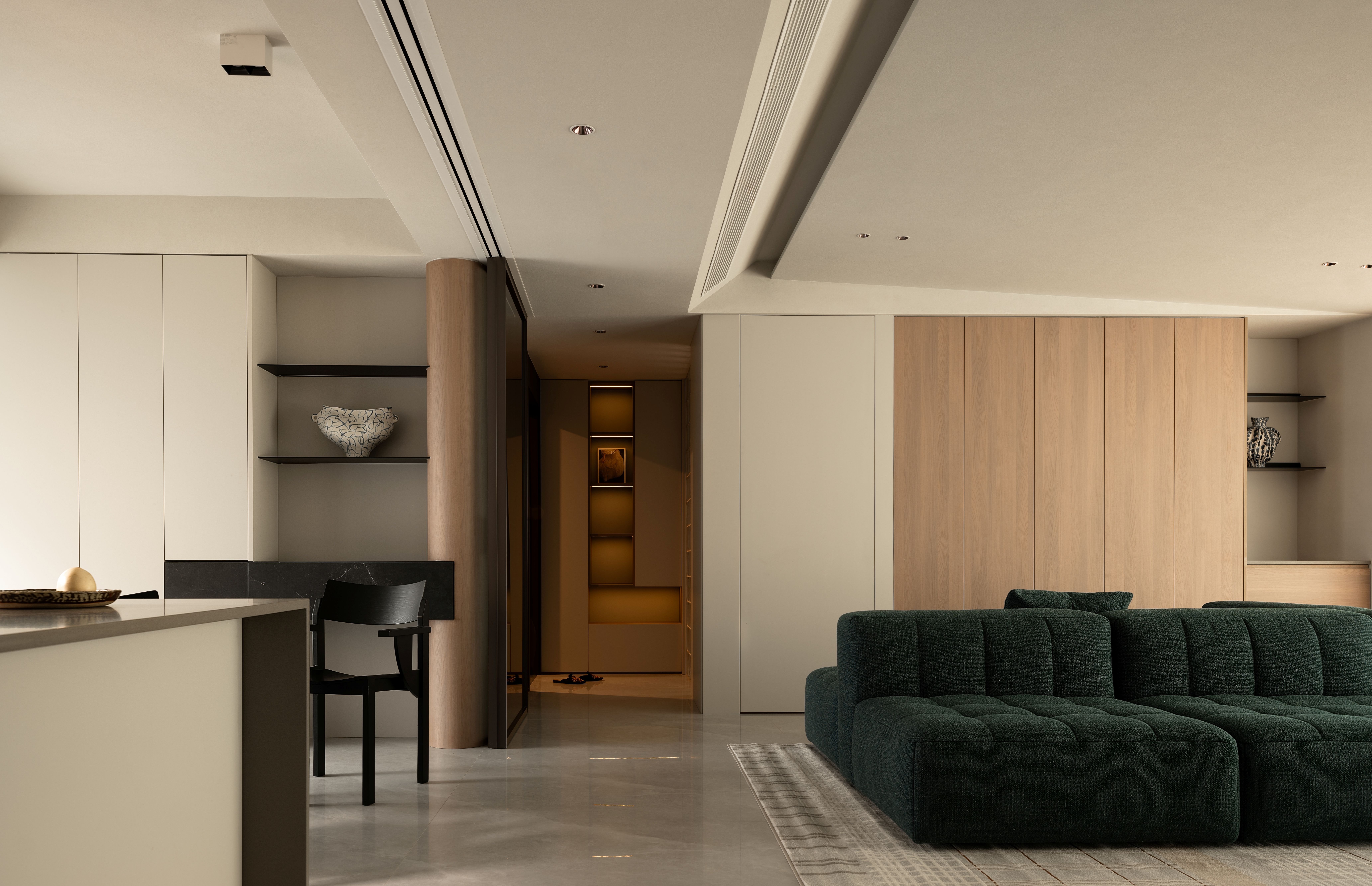 项目定位:本项目将几何抽象与自然元素相结合,设计理念注重空间的实用美学,围绕着有序的收纳系统、理性与温柔的几何形态构建,致力于提供一种既具有艺术感又能满足日常生活需求的空间体验。通过智能科技与自然光影的融合,营造出一个具有现代生活仪式感、温暖且功能性强的居住环境。