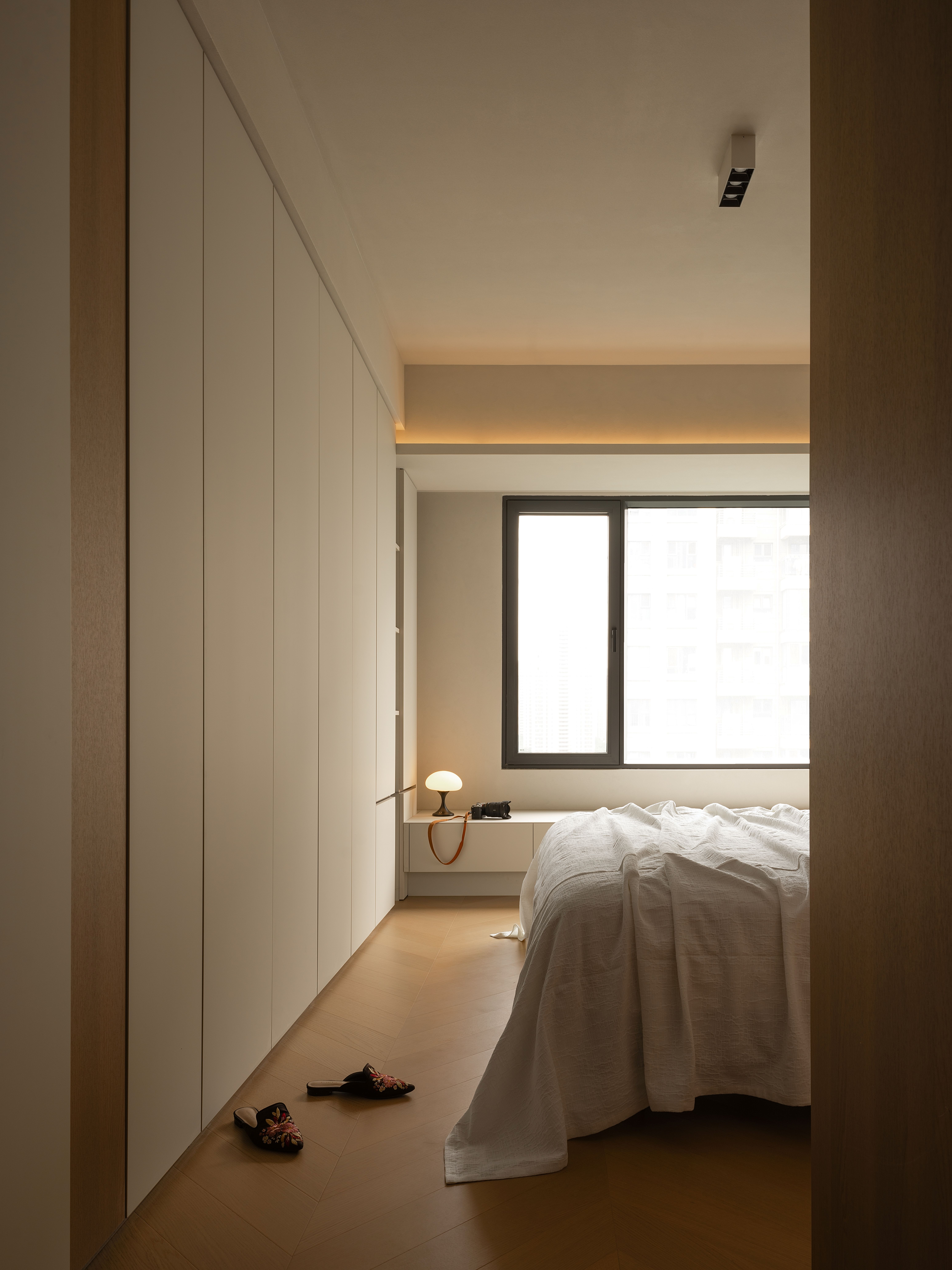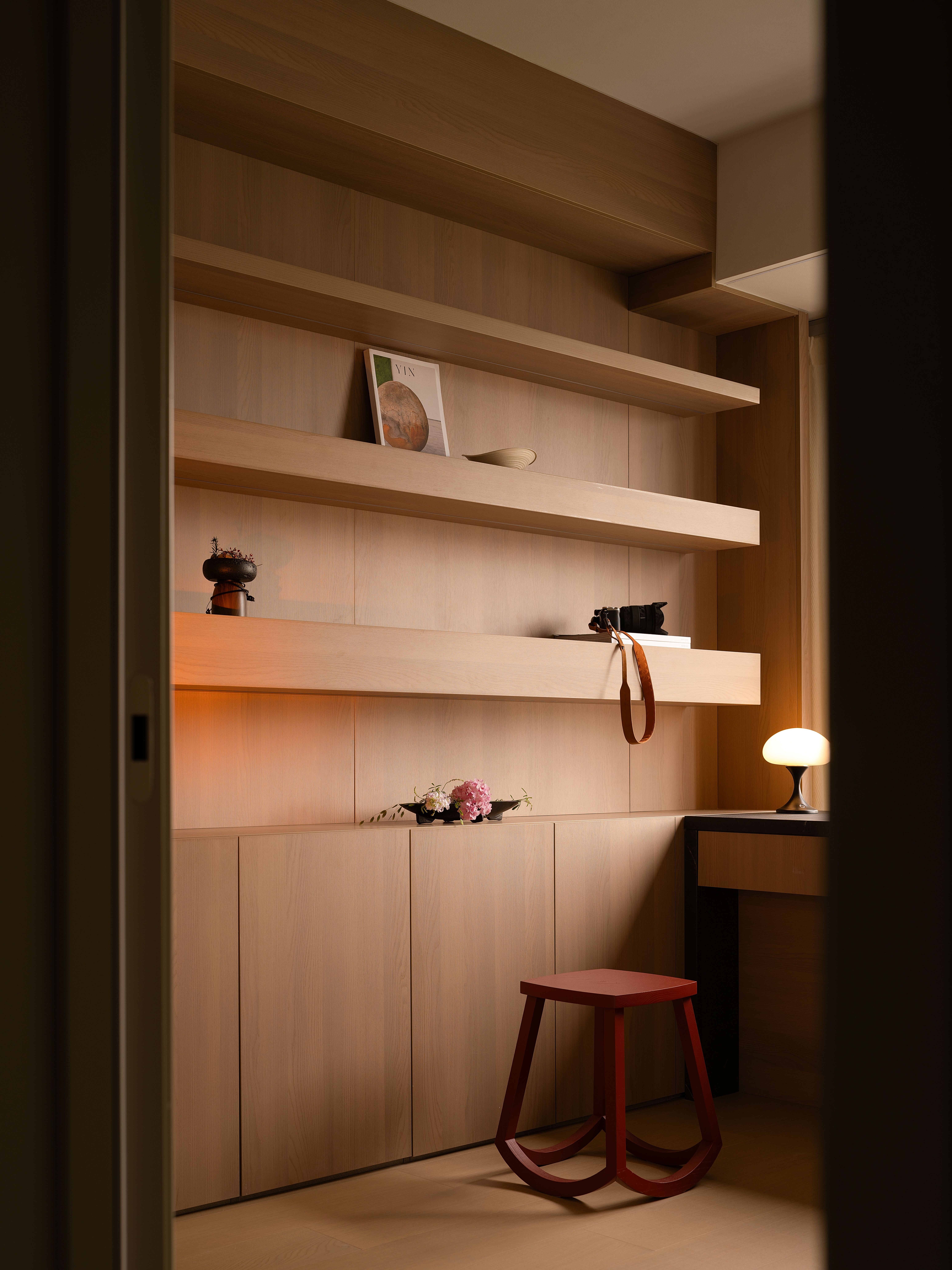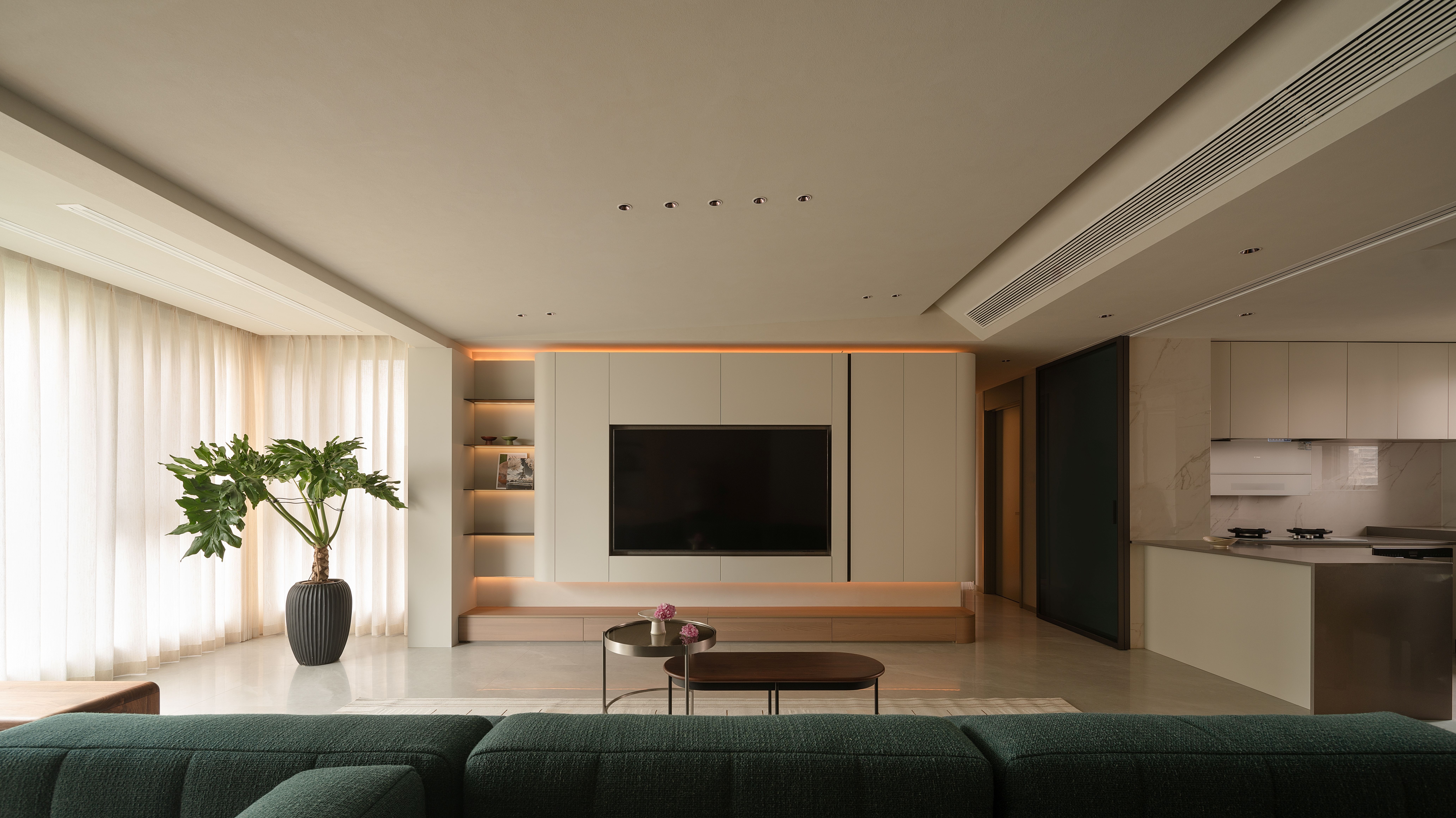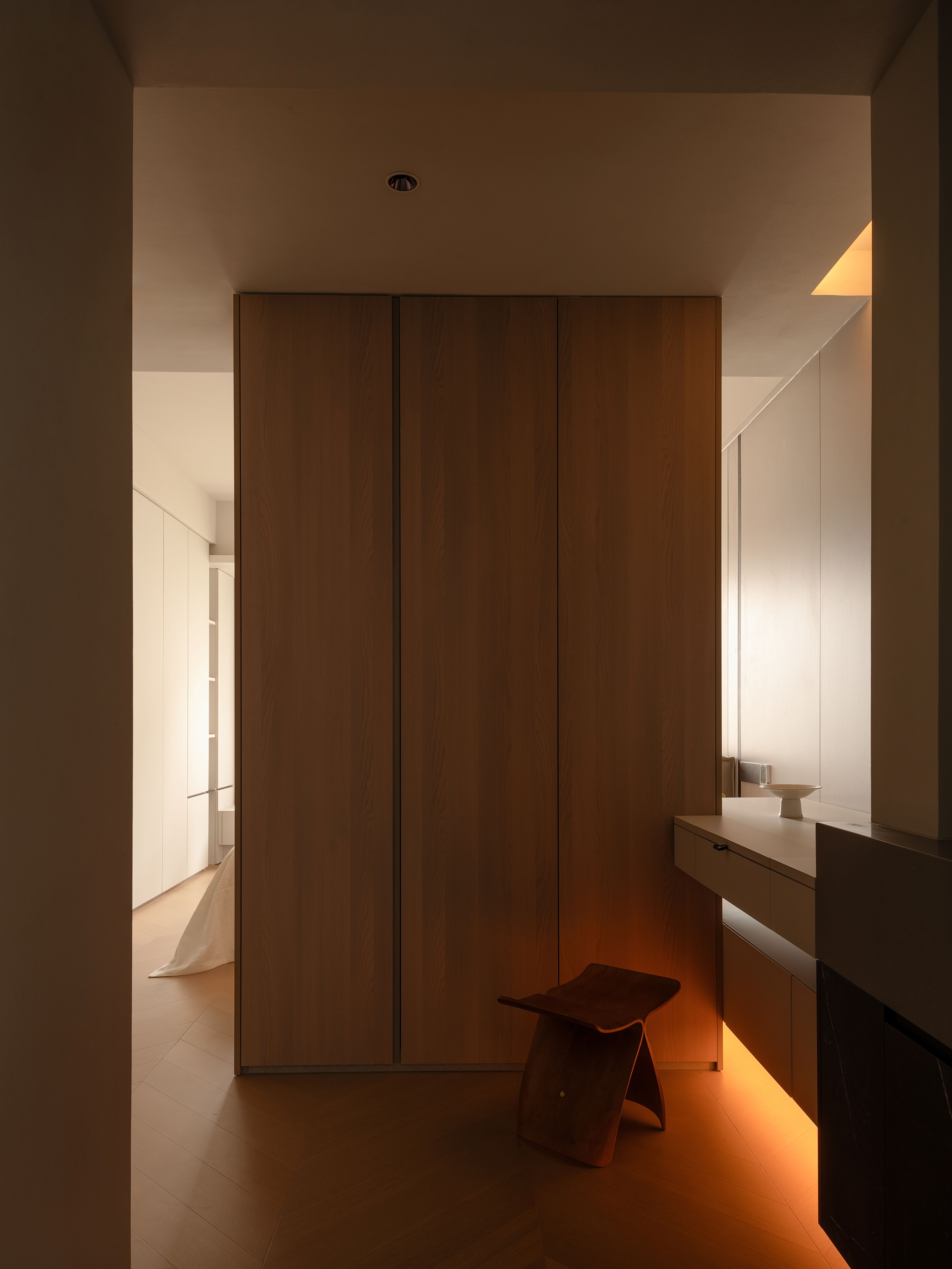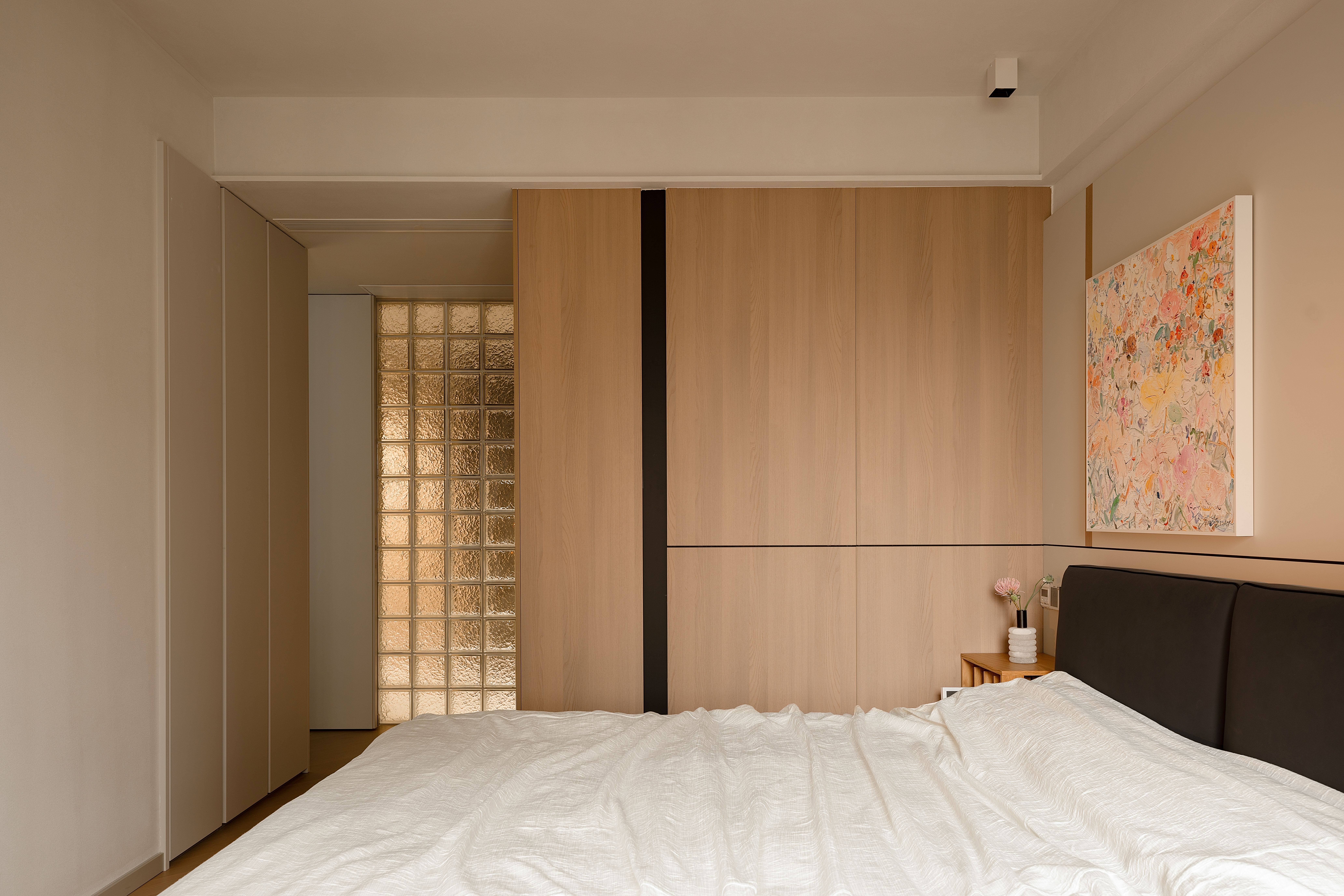 项目定位:本项目将几何抽象与自然元素相结合,设计理念注重空间的实用美学,围绕着有序的收纳系统、理性与温柔的几何形态构建,致力于提供一种既具有艺术感又能满足日常生活需求的空间体验。通过智能科技与自然光影的融合,营造出一个具有现代生活仪式感、温暖且功能性强的居住环境。