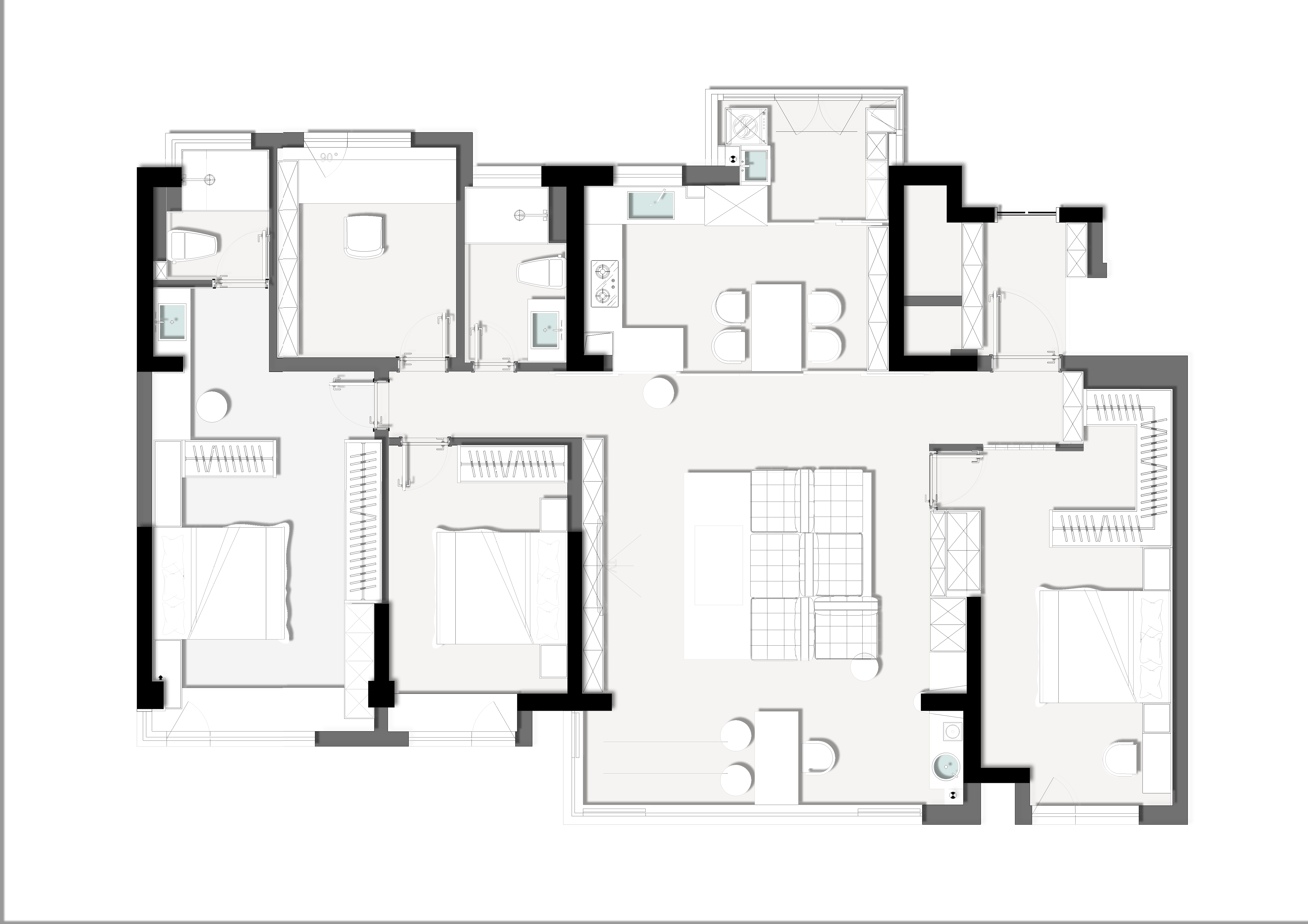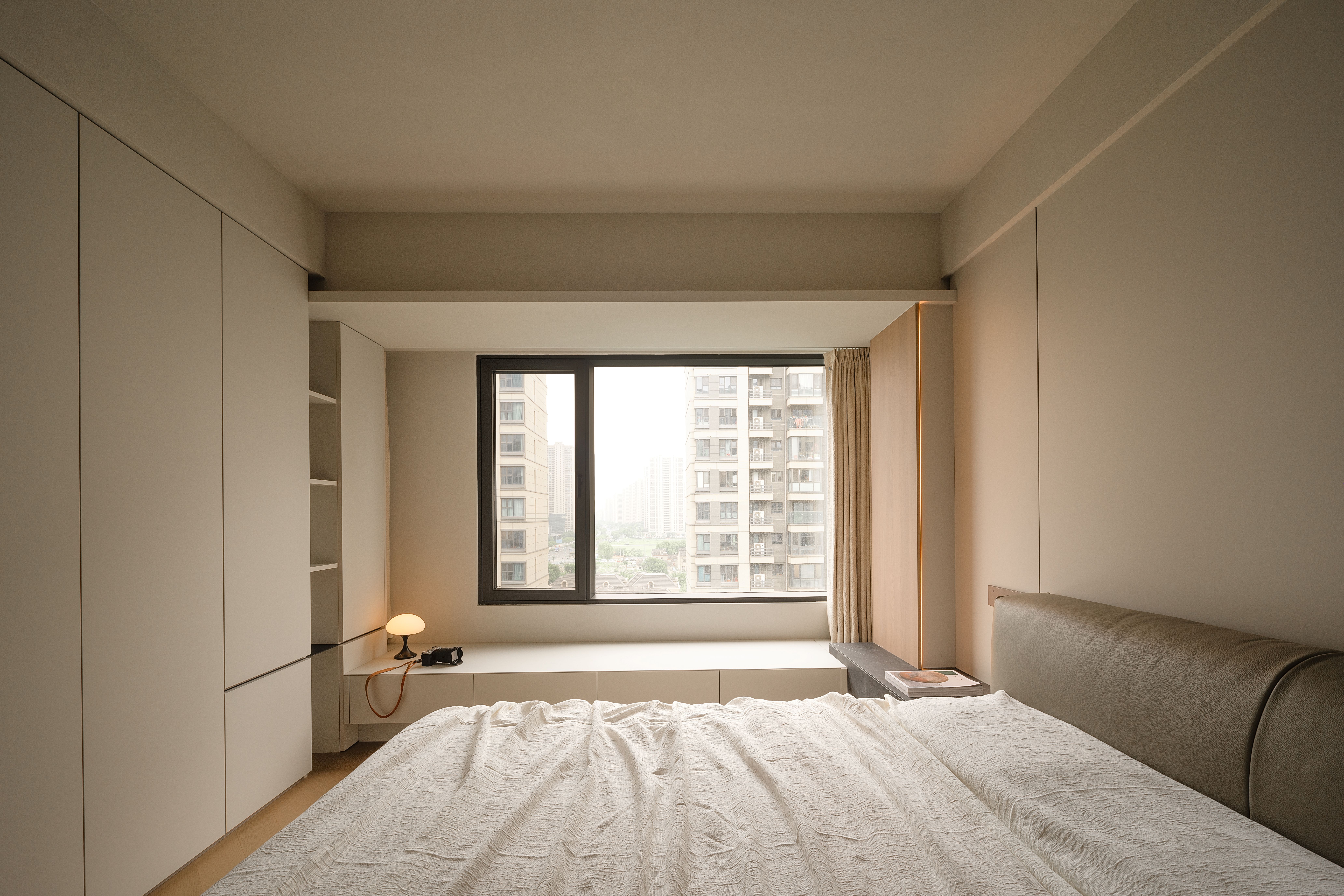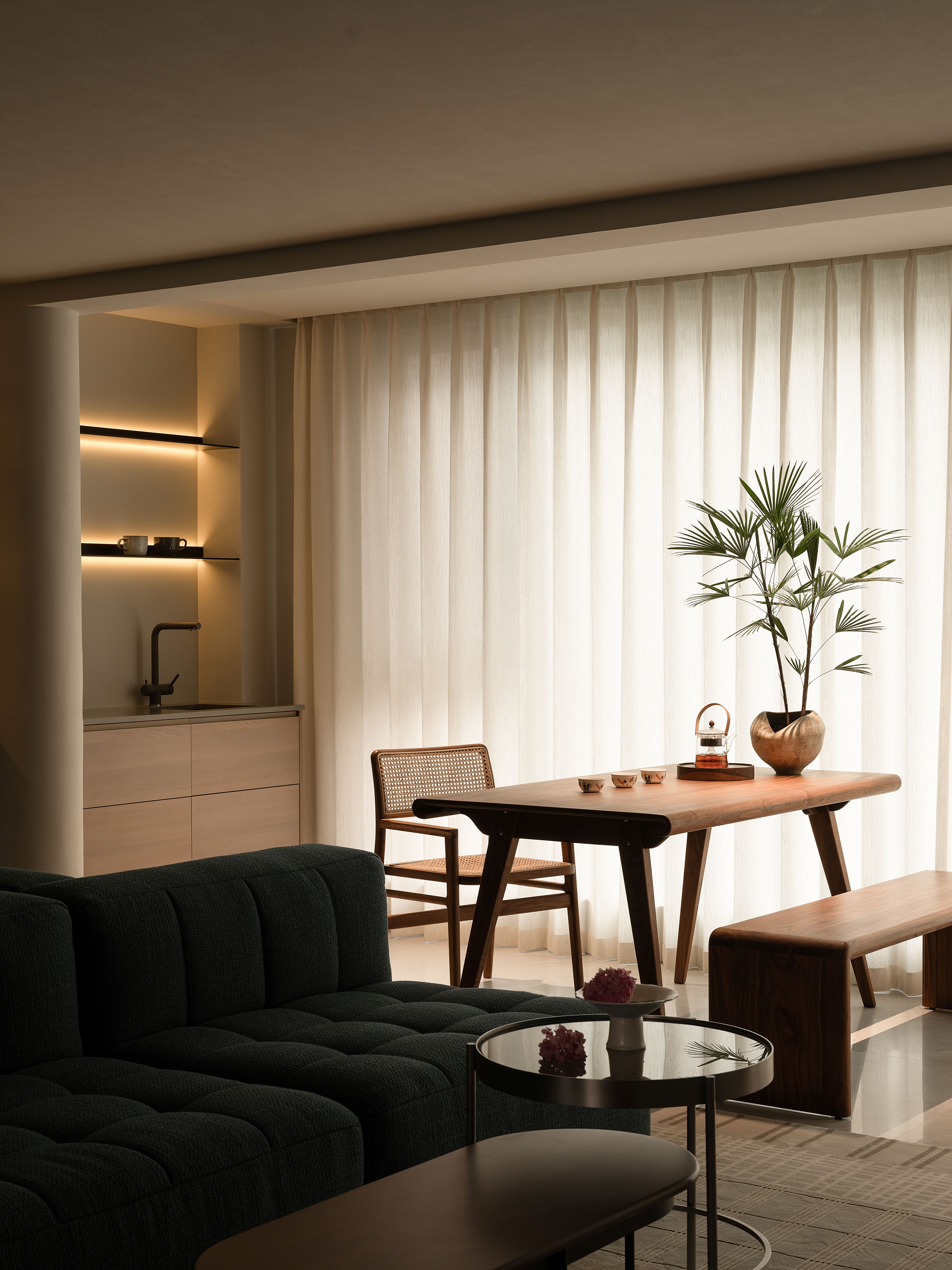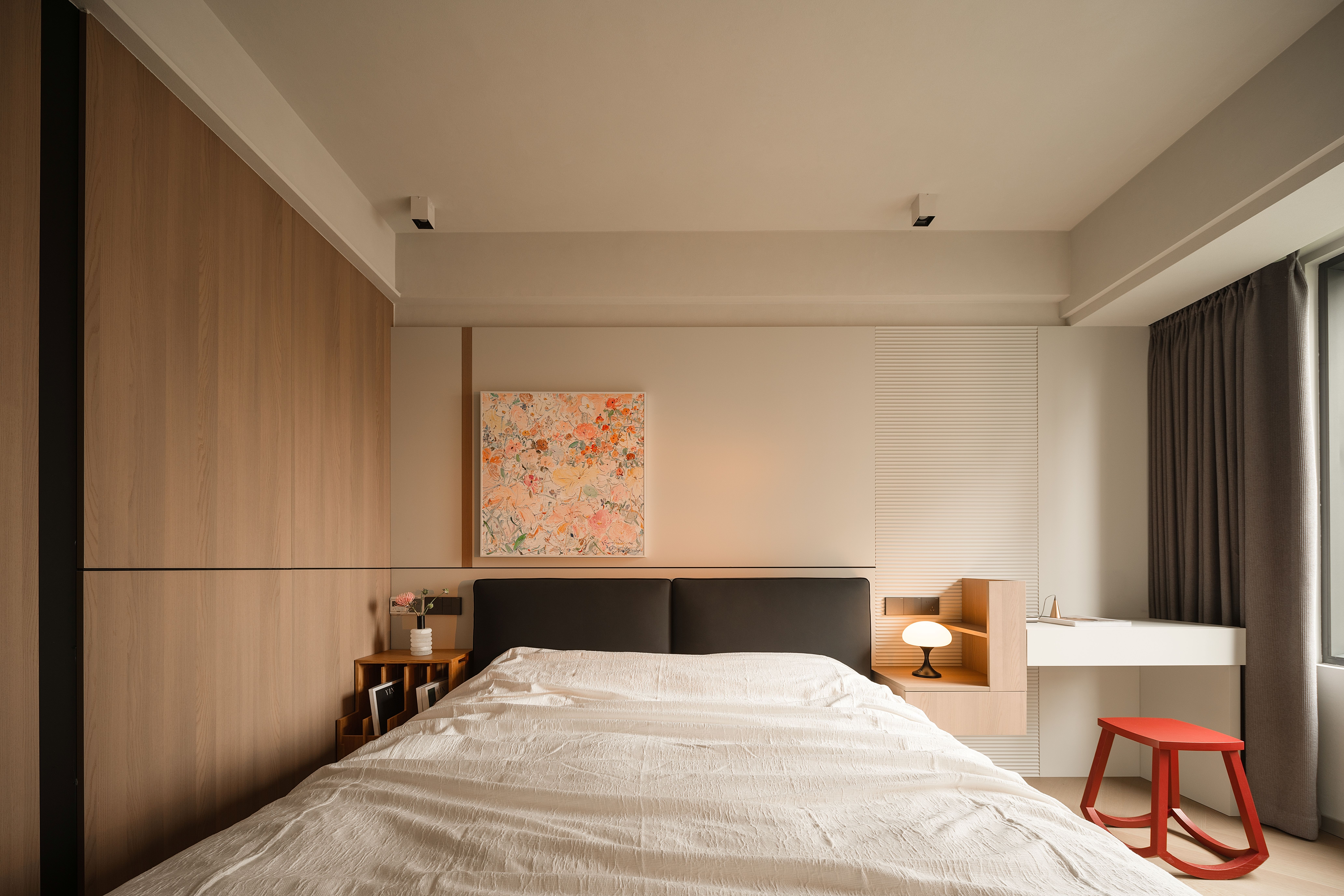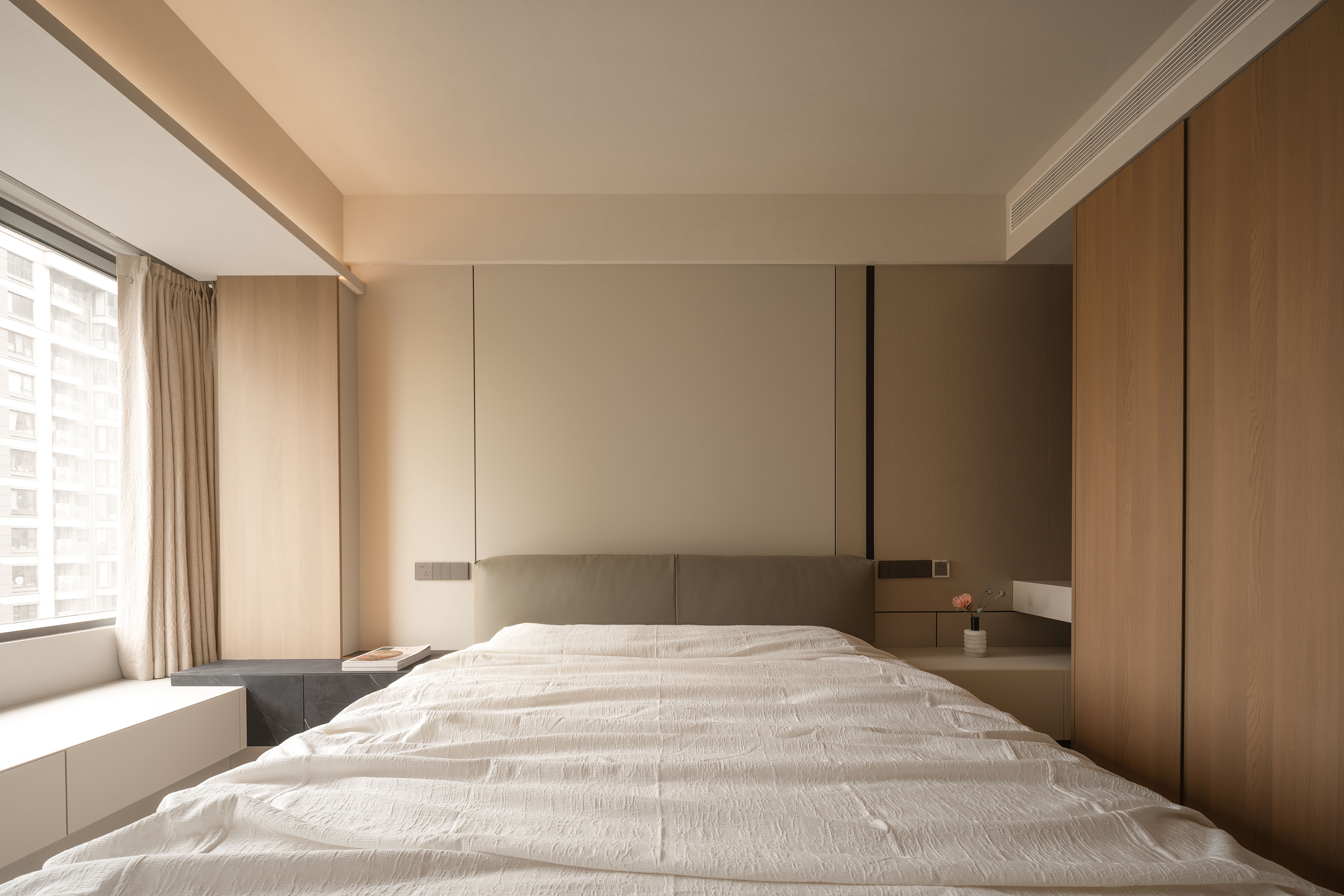 项目定位:本项目将几何抽象与自然元素相结合,设计理念注重空间的实用美学,围绕着有序的收纳系统、理性与温柔的几何形态构建,致力于提供一种既具有艺术感又能满足日常生活需求的空间体验。通过智能科技与自然光影的融合,营造出一个具有现代生活仪式感、温暖且功能性强的居住环境。