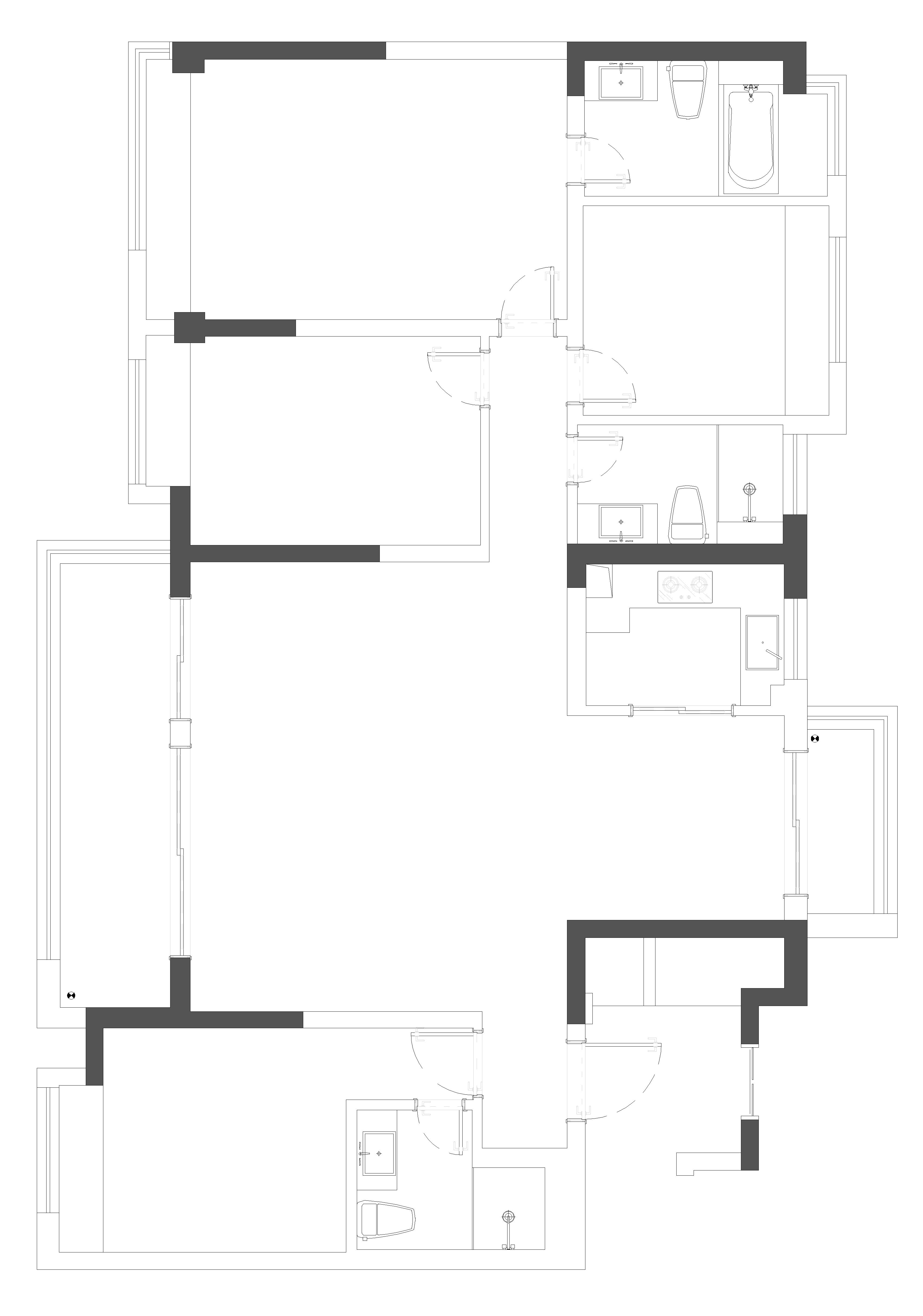 空间布局:空间布局创新点在于通过拆除墙体、开放阳台与客厅、以及将厨房与餐厅打通来创造流畅的动线,提升空间的互动性与使用便利性。特别是将原始卫生间改为衣帽间,卧室与客厅之间设立隐形门,通过凹凸结构的巧妙处理,提升了空间的视觉层次感和功能性,优化了空间的收纳和过渡功能。