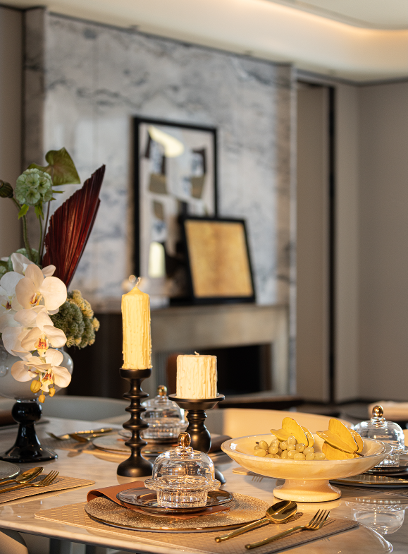 空间意境:浅白色沙发与墙体肌理相融,构筑出素雅基底。夕阳斜照,壁炉温光漫溢,与深咖色茶几形成强烈的明暗对话。高低错落的双层奢石手工茶几,以雕塑形态注入艺术灵动,亦赋予空间丰富的层次节奏。