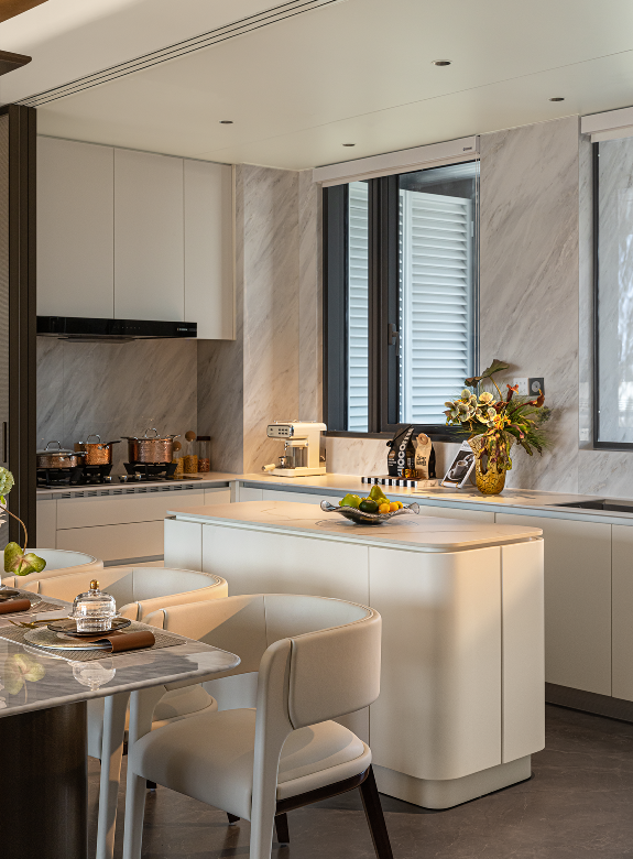 空间布局:开放厨房陈设简洁大气,皮质餐椅传递品质与舒适,名贵大理石台面则赋予空间一抹温馨而浪漫的底色。