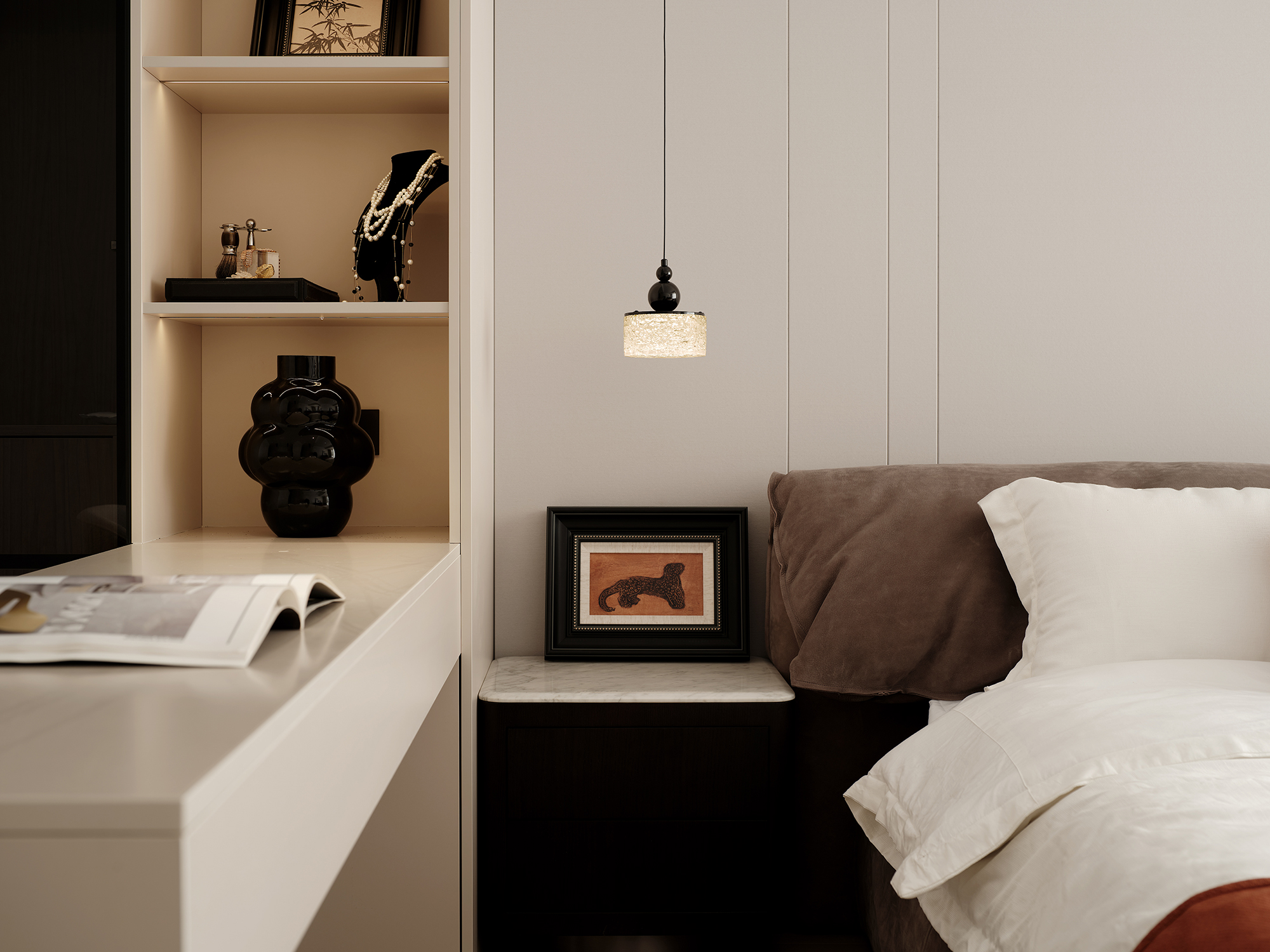 设计选材:防艺术漆背景墙以艺术肌理与两侧咖色木制温润质感,达成刚柔并济又极具视觉冲击力的微妙平衡,异材质碰撞间迸发出克制的高级感,柔和的光线与精致摆件,散发着浓郁的生活品味。