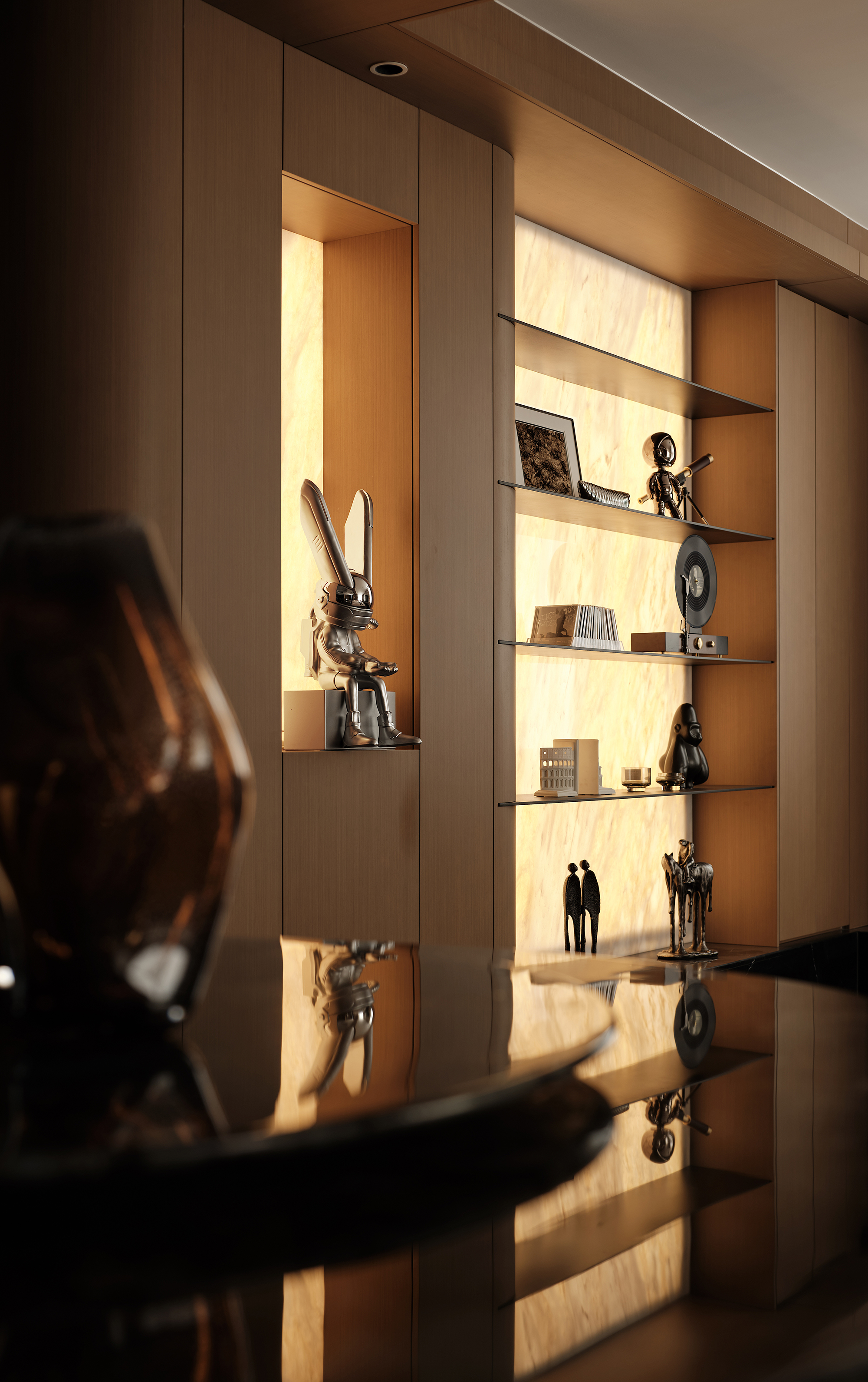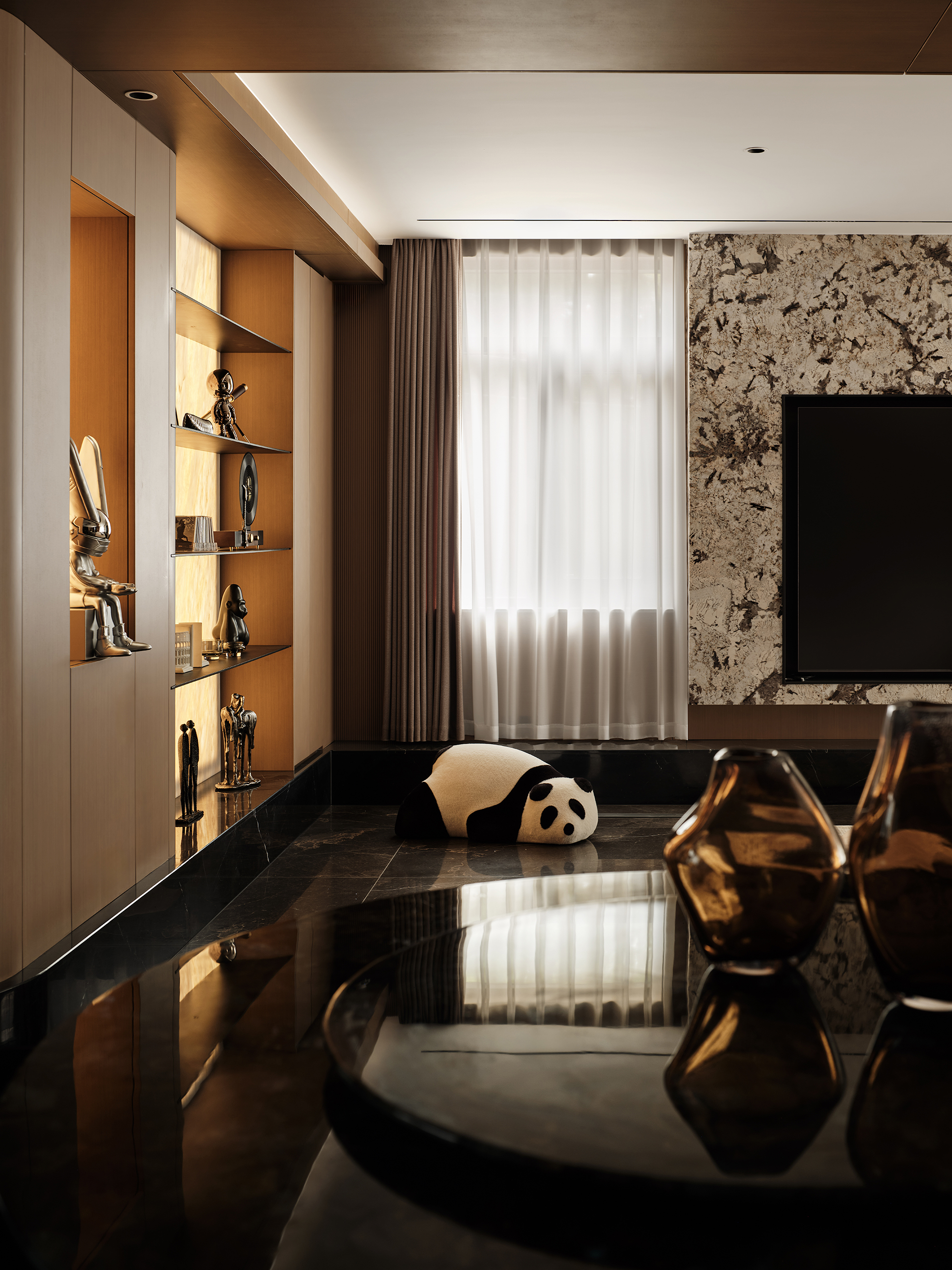 空间布局:咖色木制柜与奢材电视背景墙融合,形成强烈对比,奠定空间的轻奢基调,黑色地台与深色哑光地面融为一体,将设计与实用性结合,用细腻的肌理质感为“家”这个场域增添温度。
