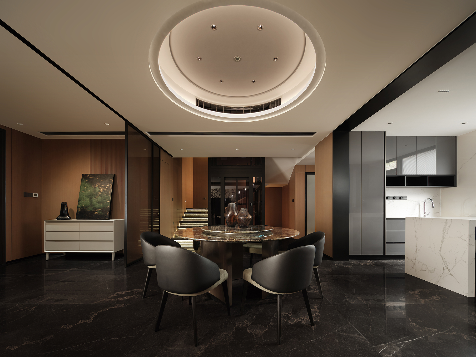 空间意境:温润的木质元素与带有颗粒质感的大理石台面相互映衬,深浅交织,营造出和谐又富有层次感的视觉效果。居中摆放的绿色奢石圆桌,搭配线条简约的皮质座椅,围合出温馨且极具格调的用餐空间。