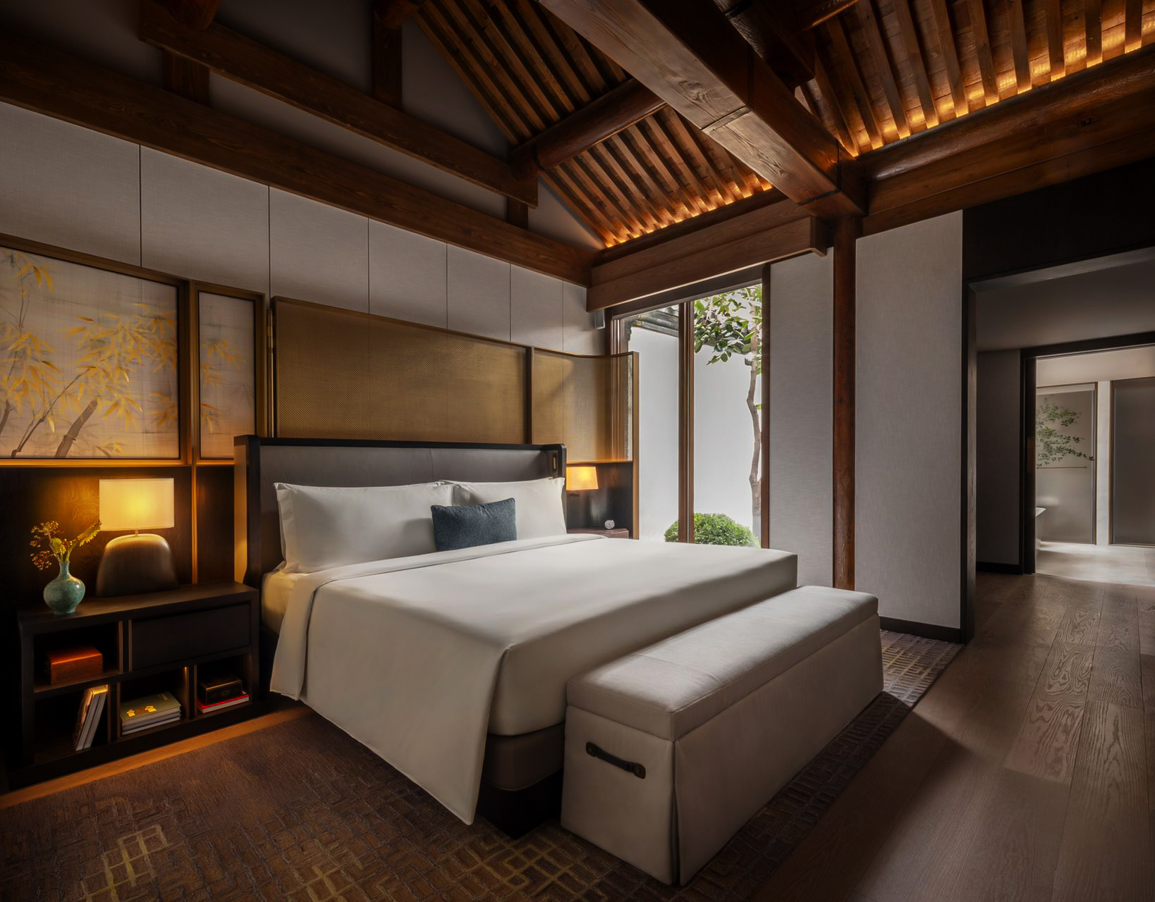 客房 • 42座精美庭院客房采用原木框架的建筑风格,布局各异,空间宽敞,与当地胡同民居相邻。每个院落均自成一体,散落于草厂三条至十条这八条胡同中。自带庭院的客房每户都各具特色,每个院落都有各自不同的庭院景观,夜晚庭院灯光开启,室内灯光也设置了不同亮度的三个场景,供客人不同功能使用,营造不同层次灯光氛围,让客人在落地窗的院子里独享属于自己的一片宁静天空。