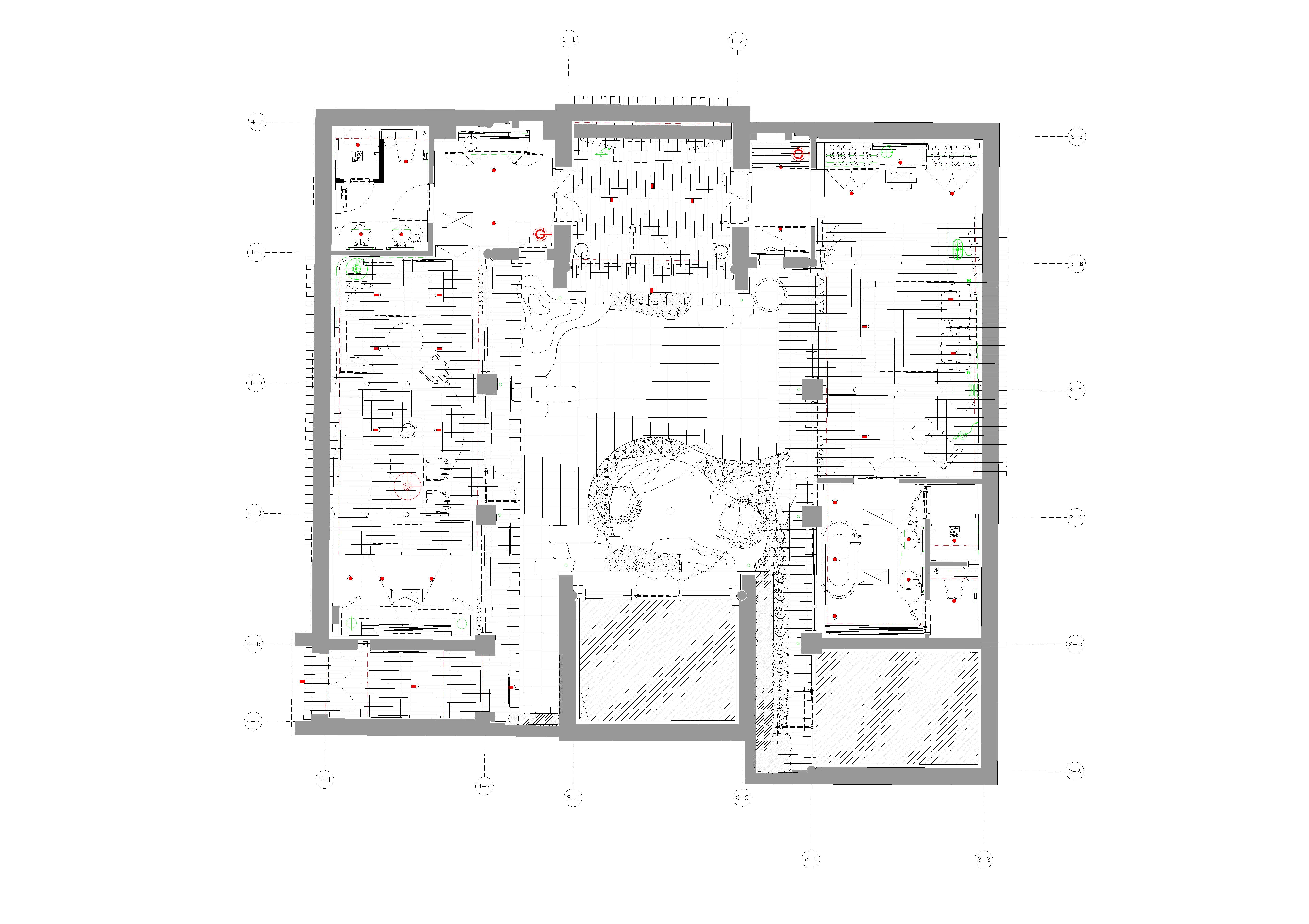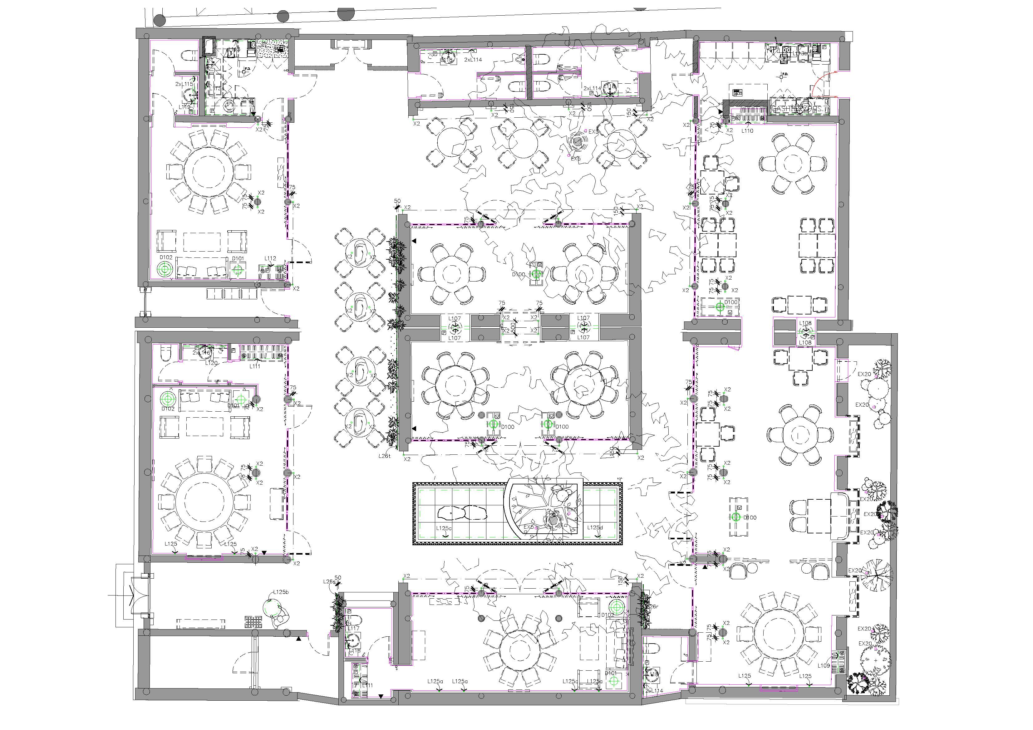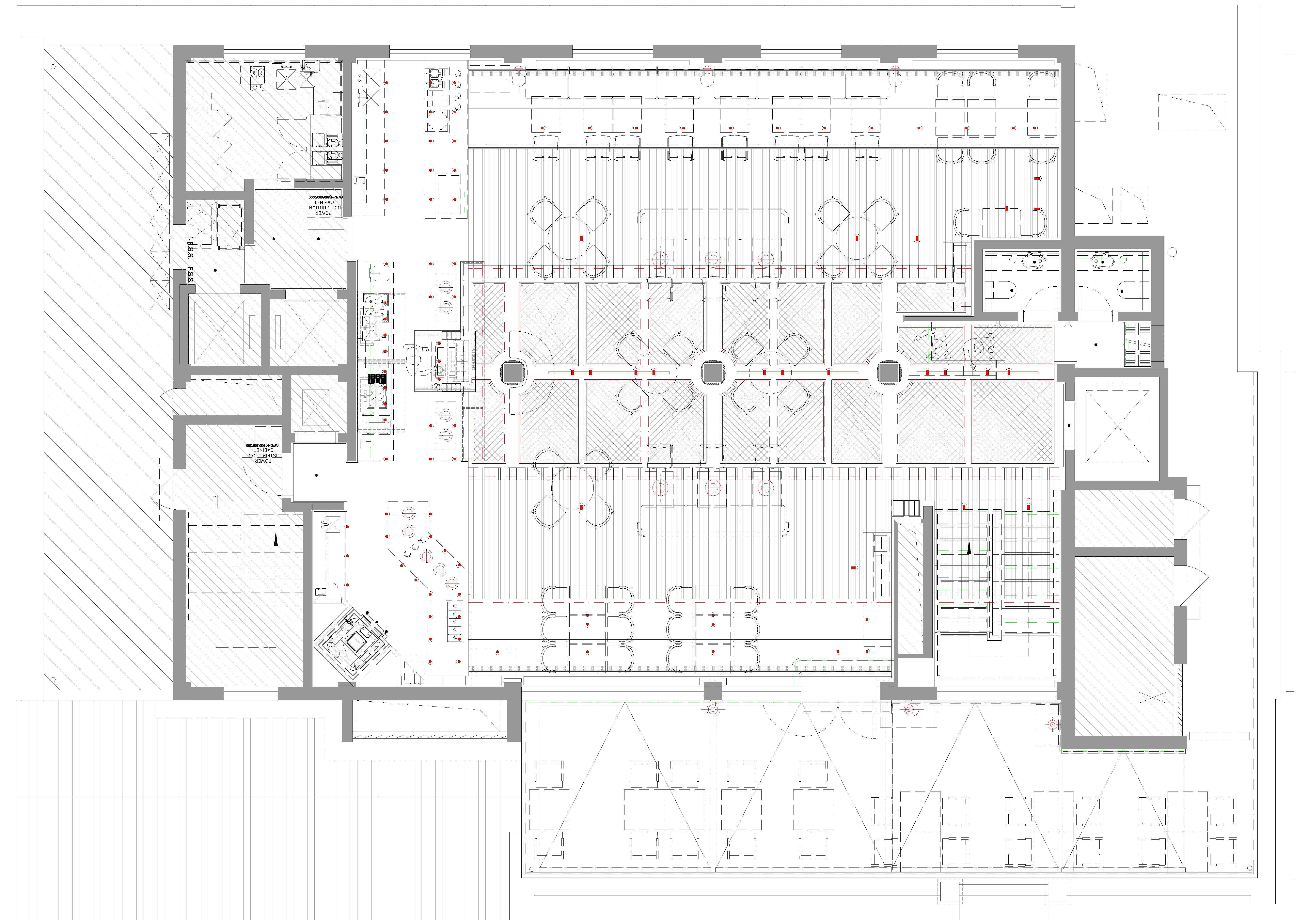 VICINI 意大利餐厅 • 别具格调与活力的意式餐厅VICINI设有露天用餐空间,可以享受意餐的同时感受京城胡同屋顶的奇妙景色。餐厅天花保留原有结构框架,暗藏灯带衬托出结构层次,中式窗格设计元素借鉴于天花吊顶,背光照明方式呈现装饰造型轮廓。桌面补充重点照明,高显值呈现菜品色泽,夜晚灯光模式相对降暗,呈现更加柔和光效的意餐氛围。