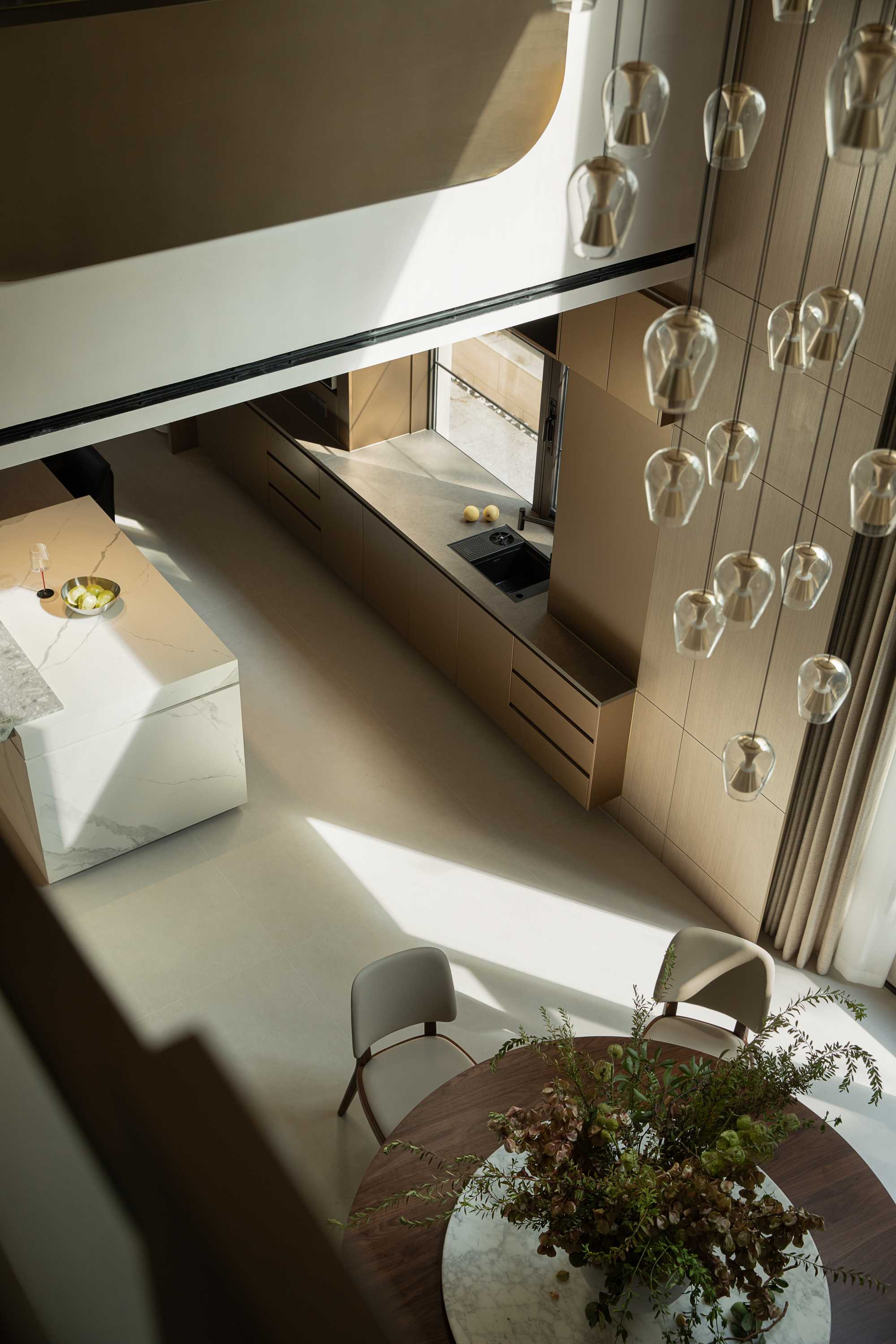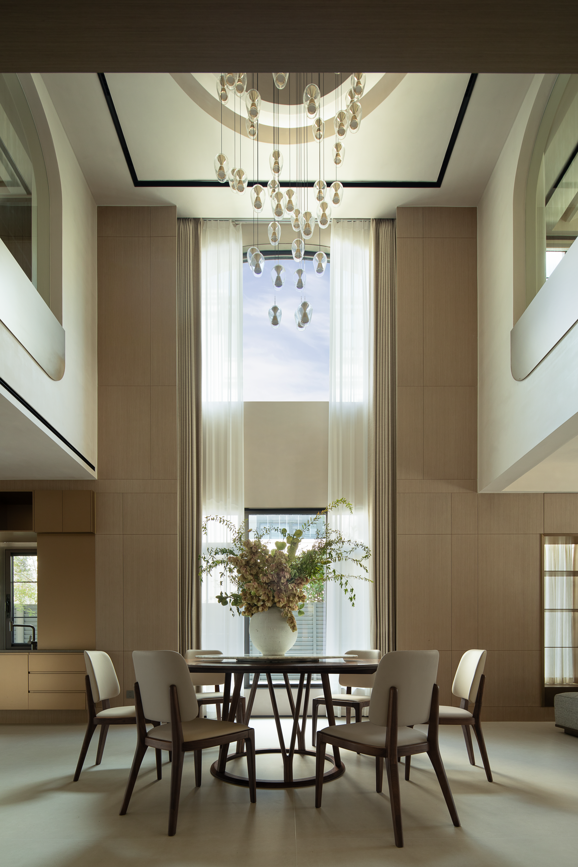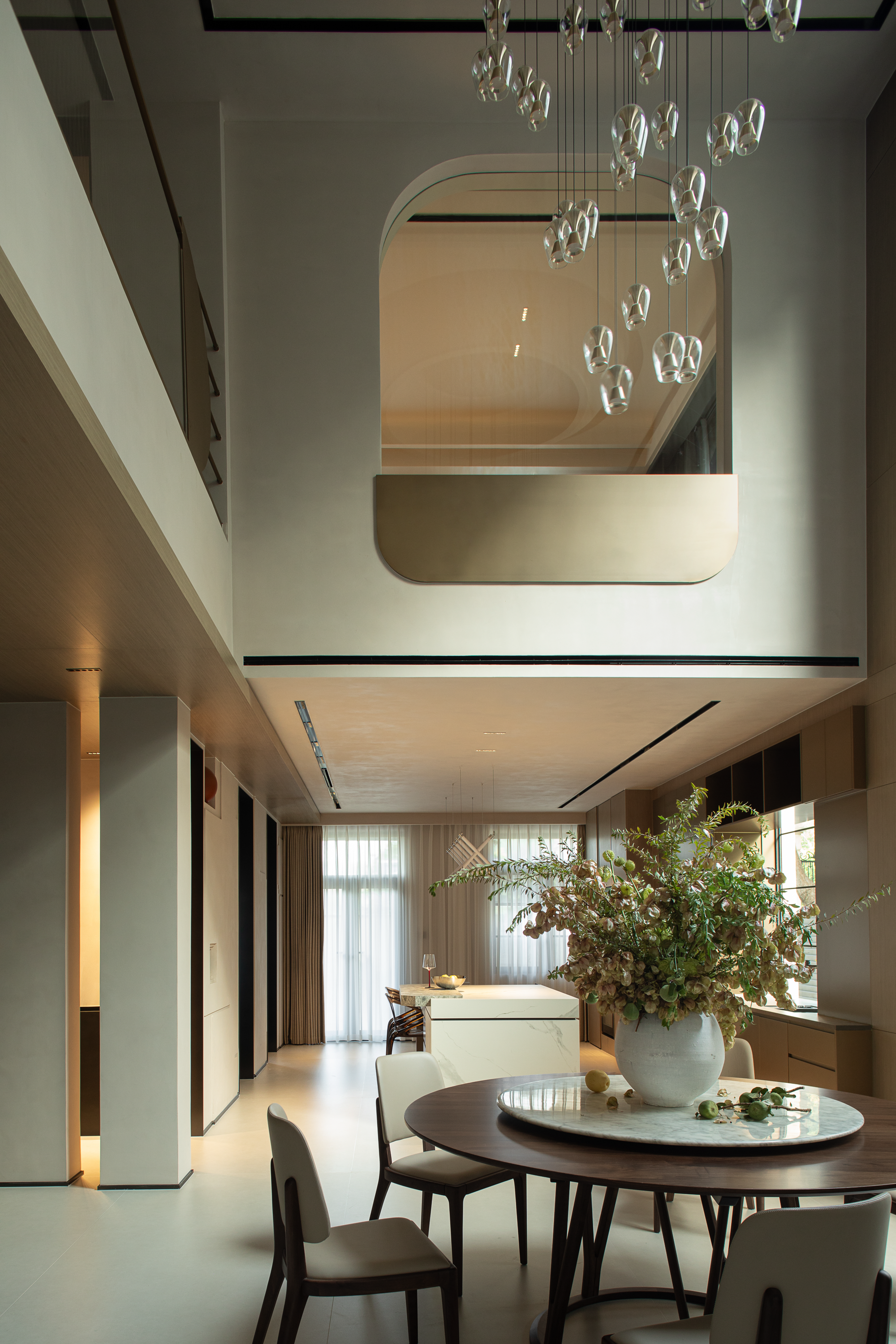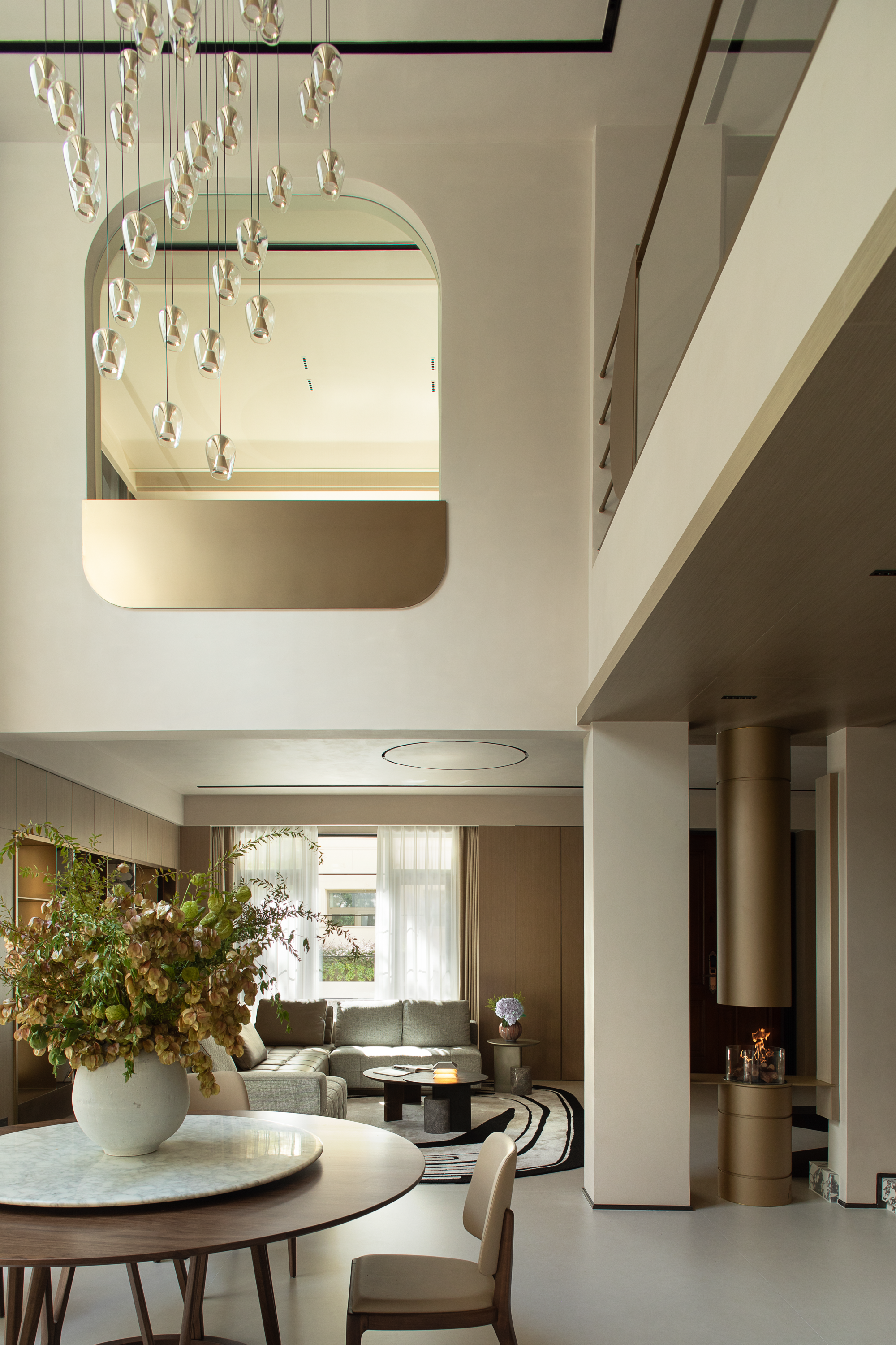 空间布局:轴心放射式动线 :以门厅为轴心横向延展客餐厨区,纵向通过雕塑楼梯连接三层级,形成立体交通网络