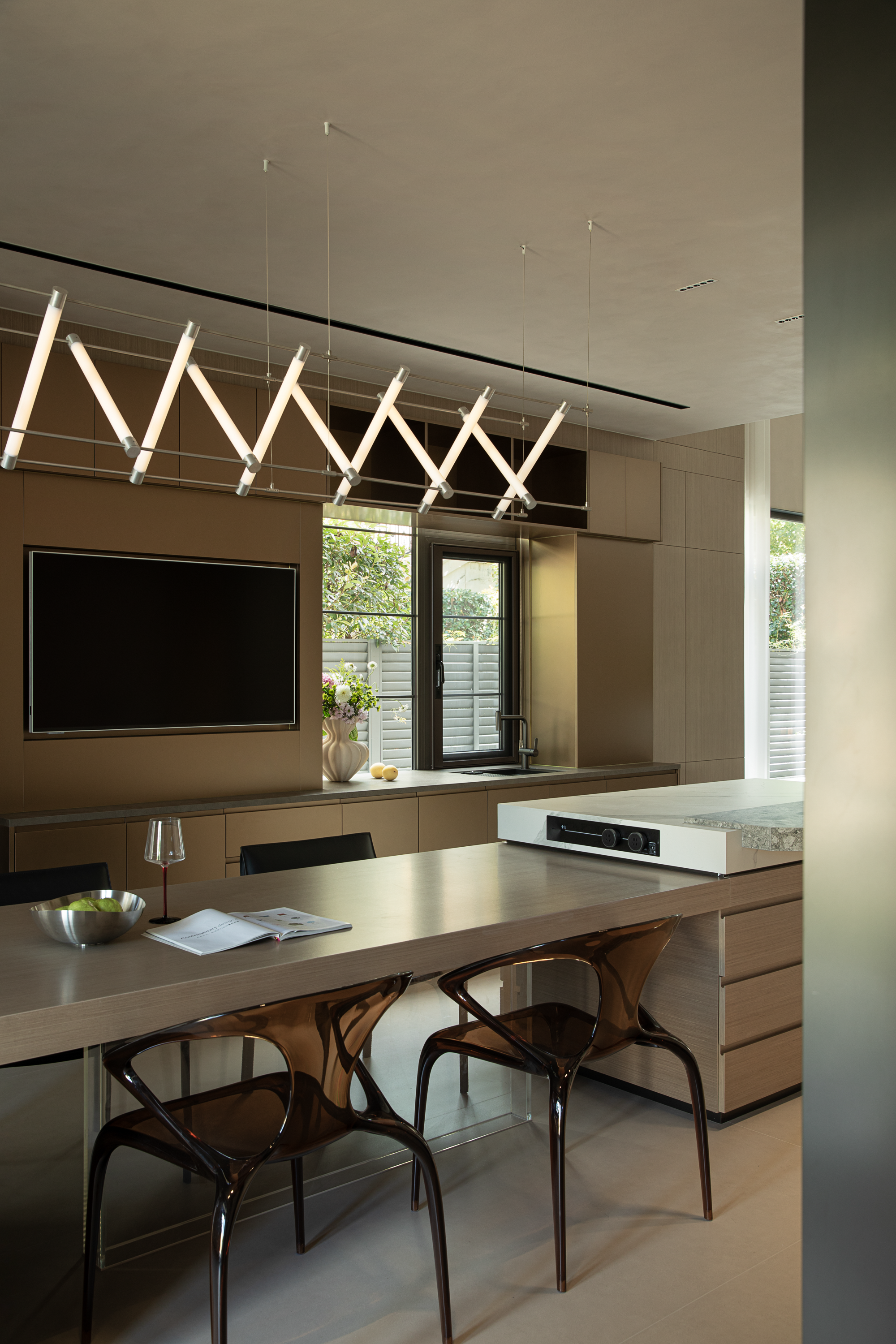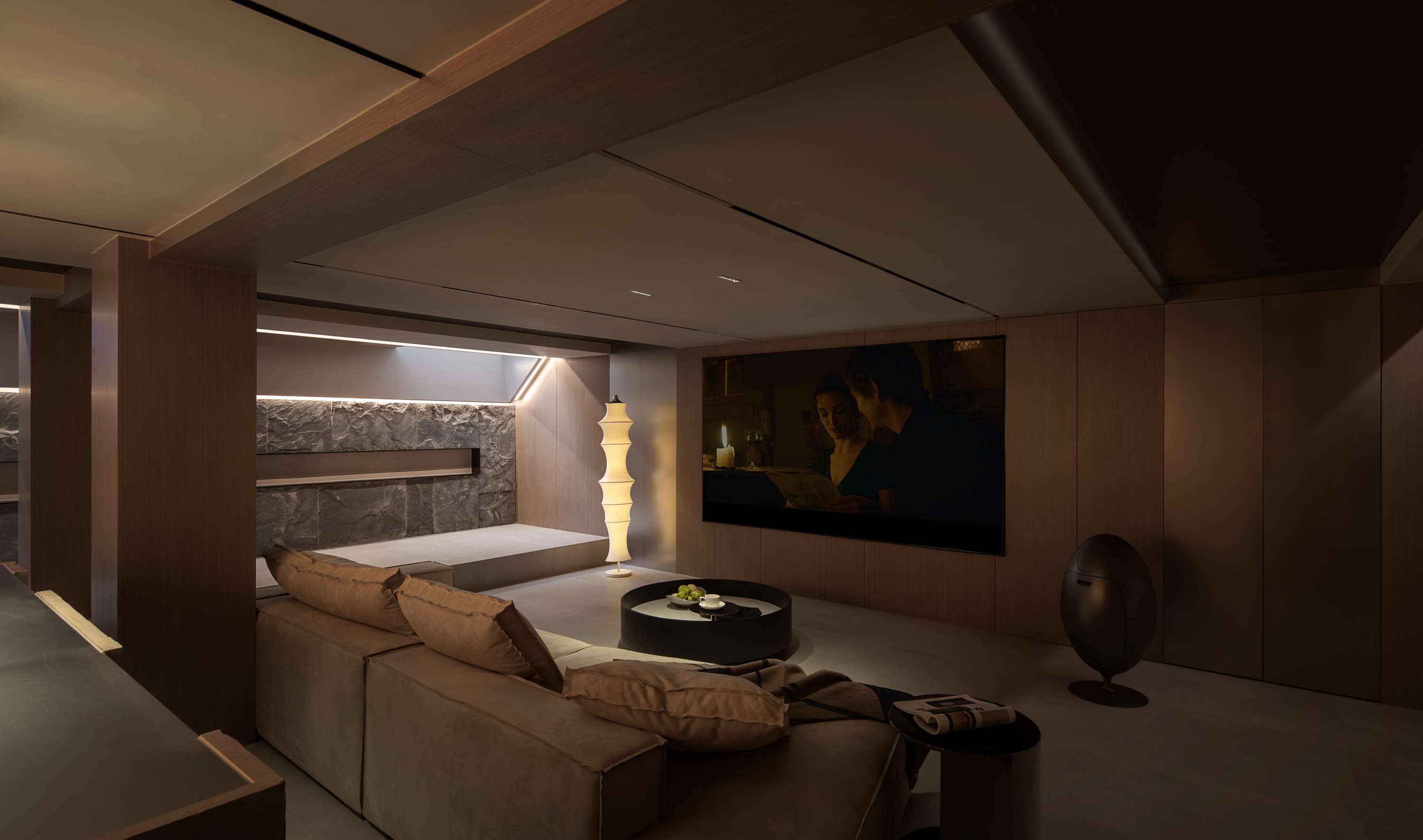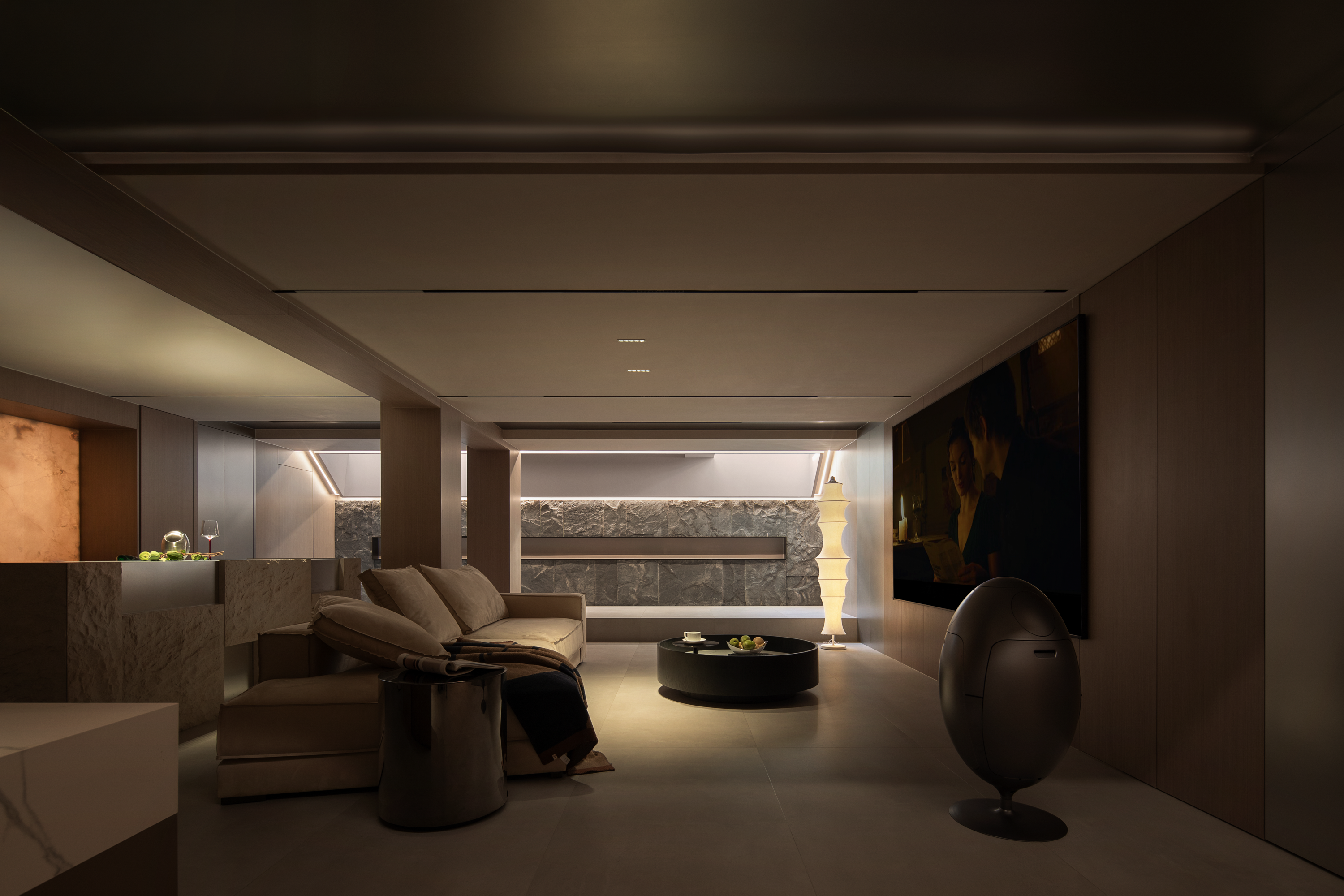 科技隐形式融合 :100寸巨幕电视与内置影音系统、全空气系统,皆通过精密结构间隙实现功能与美学的统一