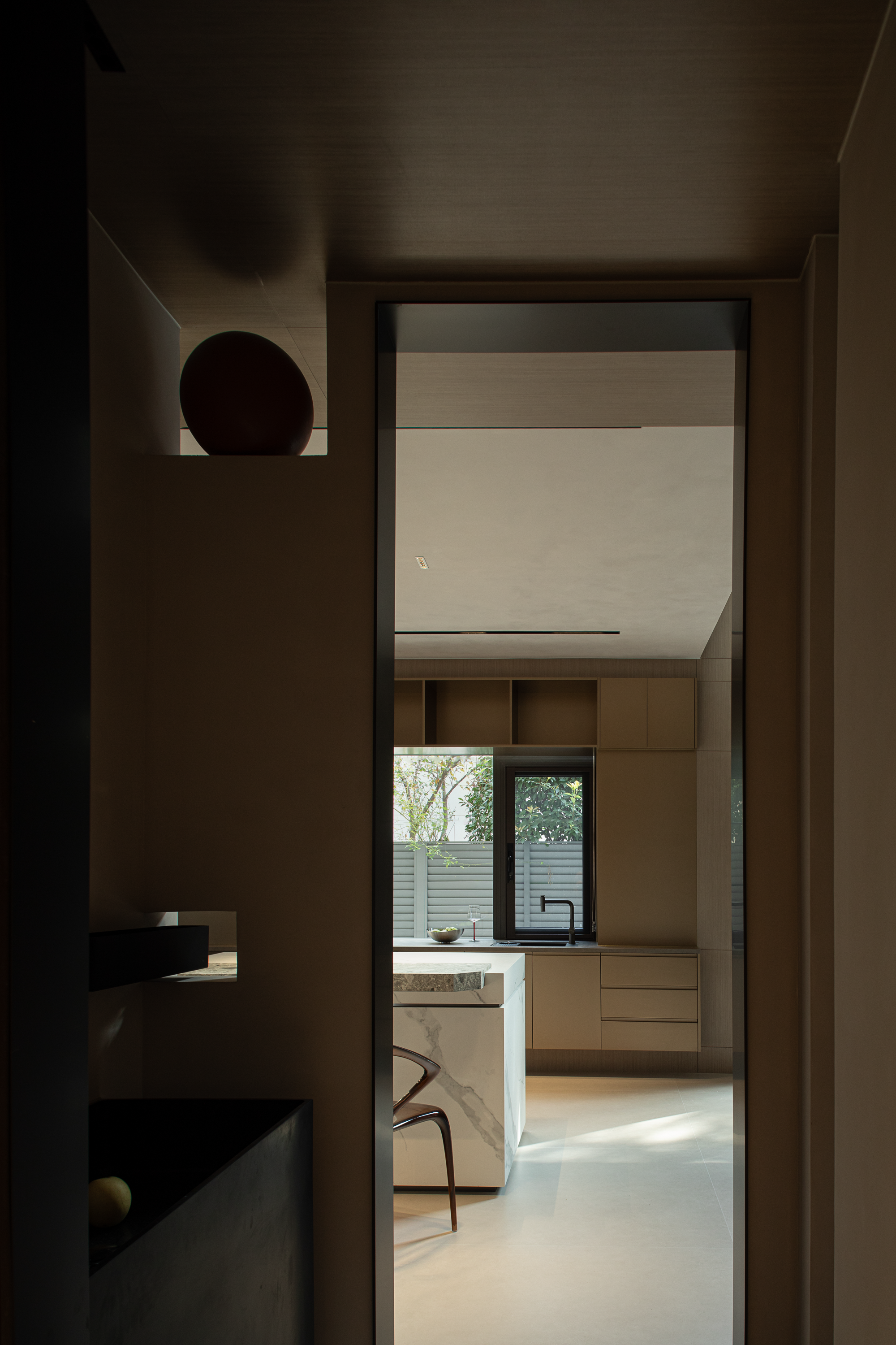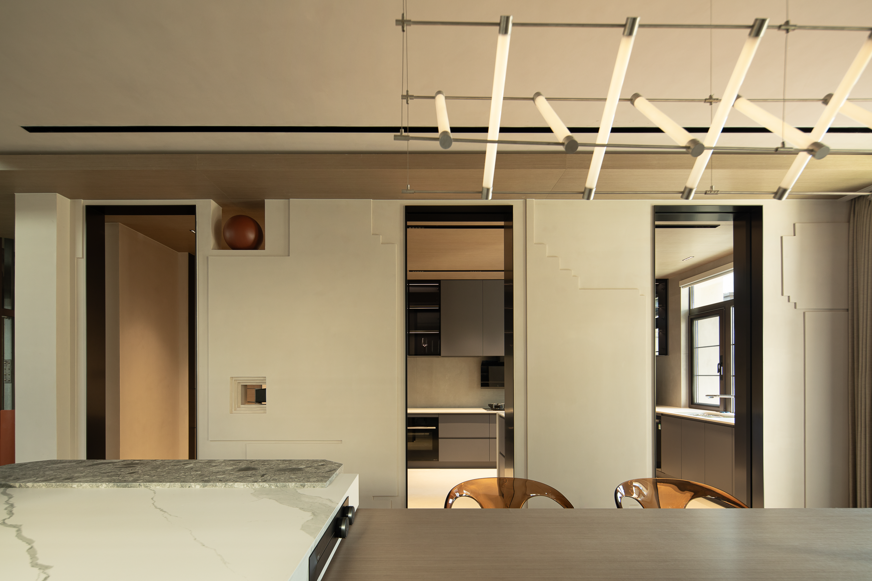 高效运转的料理剧场 中厨区位于明亮角落,洗菜池引入自然光,搭配高效三眼灶、大容量冰箱与垂直收纳系统,构成强大的功能矩阵。中厨岛台延伸了操作区,兼作家庭互动枢纽。厨房与卫生间通过三个造型门洞形成艺术化的穿插结构。