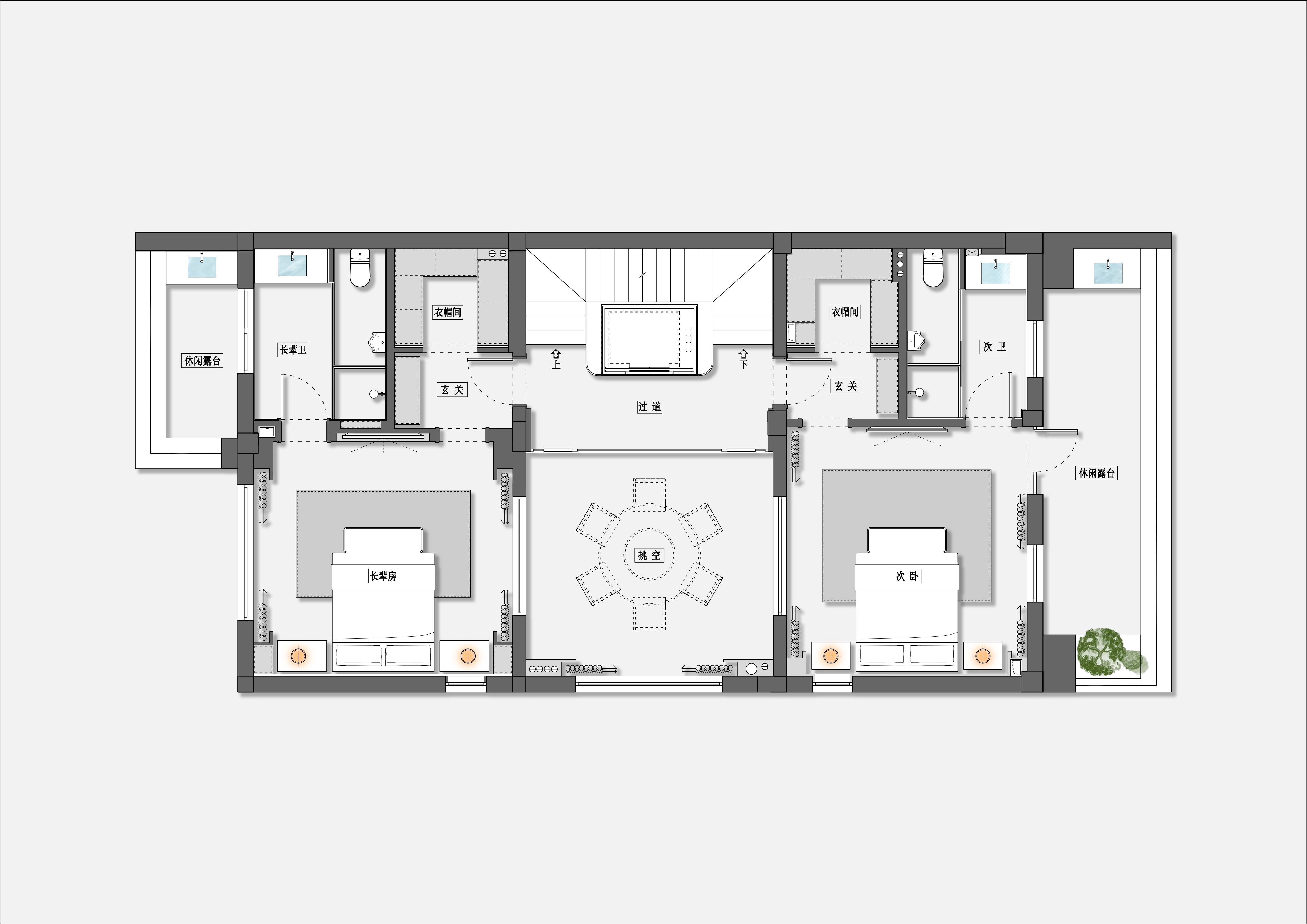 自然元素重构 :双天井引光入地下室,屋顶花园形成垂直生态链,突破传统住宅自然界面 -