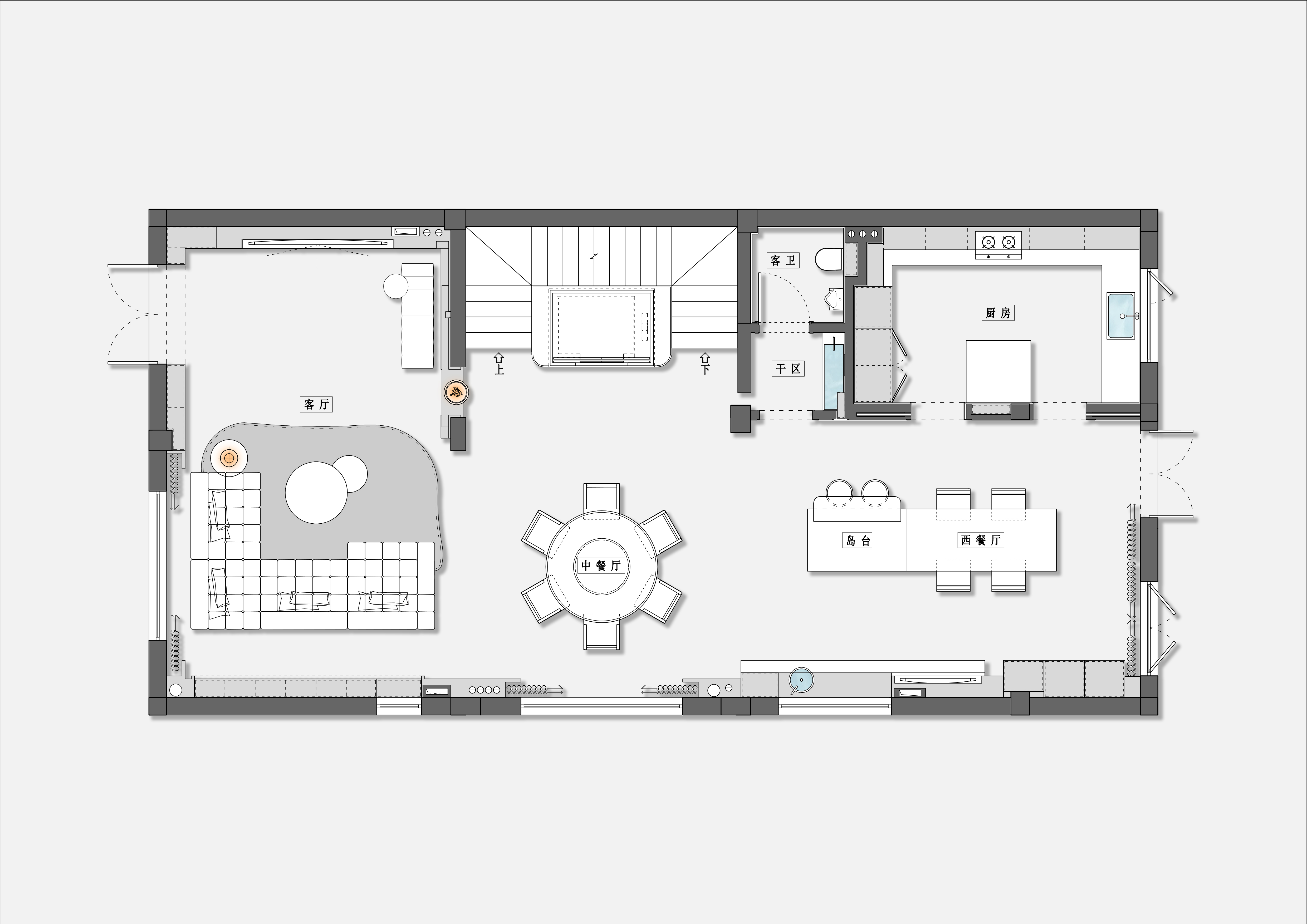 功能复合枢纽 :1.8米圆桌宴客厅与中岛西厨形成“烟火双核”,地下室整合影音、品酒、桑拿的垂直社交体系