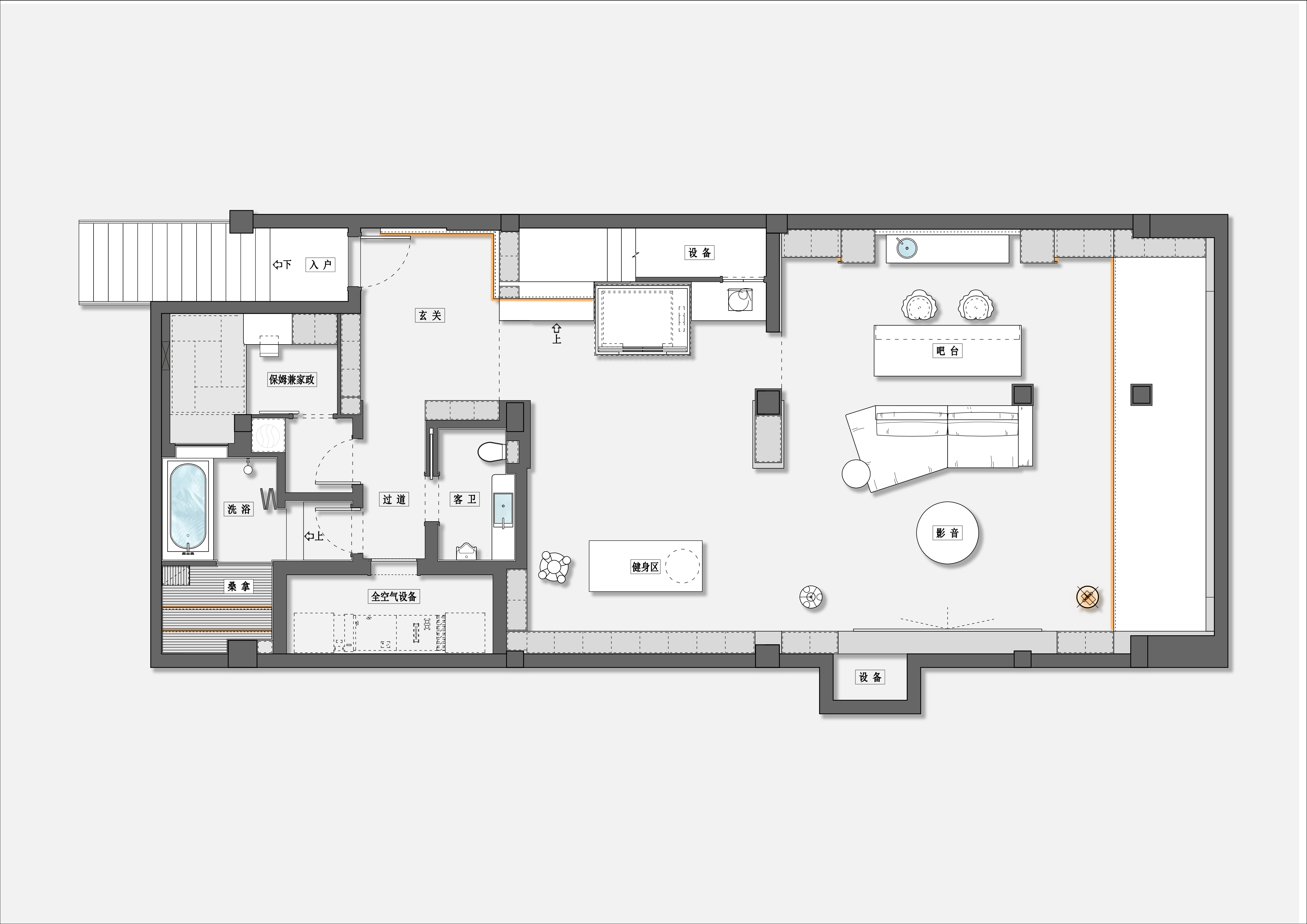 影音律动的健身观影主场 地下室作为归家首站,设有便捷收纳系统。楼梯踏步采用穿插结构,营造层次感。核心休闲区借由双天窗引入自然光,形成开放的通透的影音娱乐与社交场域。内置的强大影音系统搭配超大投影幕布,打造沉浸式观影体验。