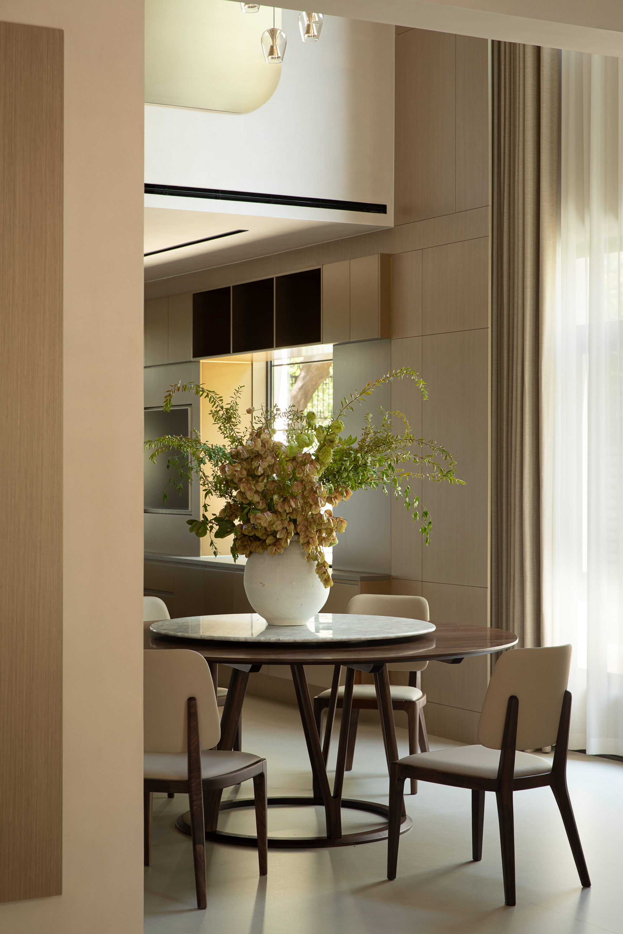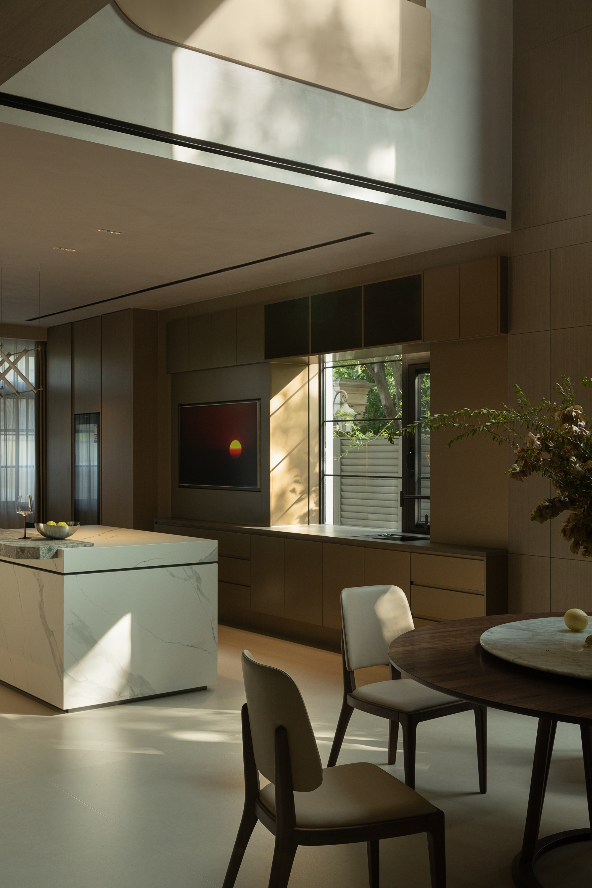 阖家团聚的烟火诗篇 1.8米圆形餐桌配以转盘,专为家宴与团聚设计,其形制暗合团圆之意,成为凝聚情感的核心。岛台与西餐桌无缝衔接,满足烹饪、简餐、休闲与轻办公等多元场景。嵌入式冰箱与恒温酒柜维系了空间的视觉纯净,55寸画壁电视机则将生活点滴融入艺术化的日常。