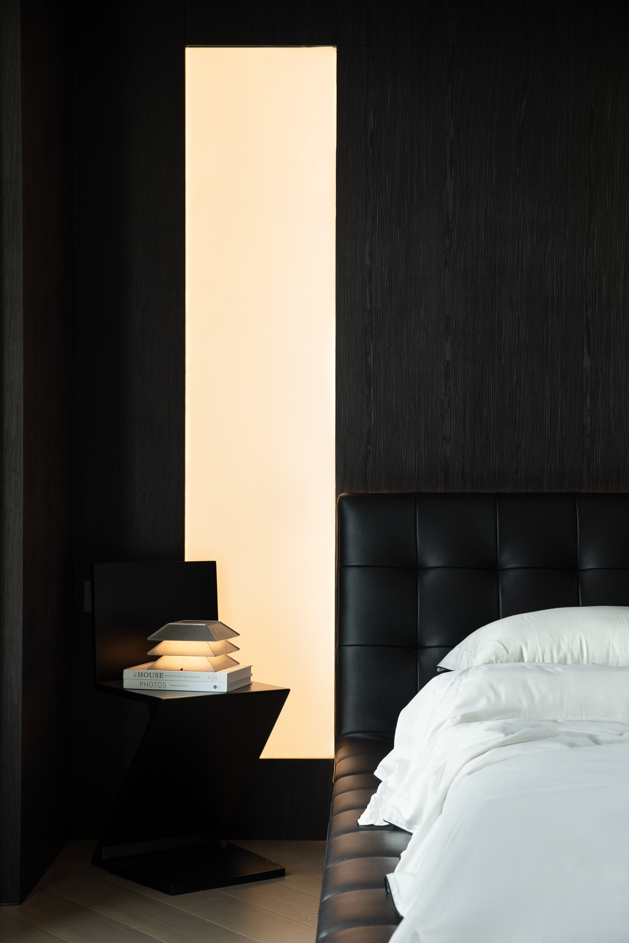 空间意境:光影戏剧化表达 :通过线型灯带纵向拉伸空间,悬浮光幕背景墙实现昼夜光韵转换,壁炉火焰与金属木饰面形成冷暖材质对撞,构建动态的光影叙事场域
