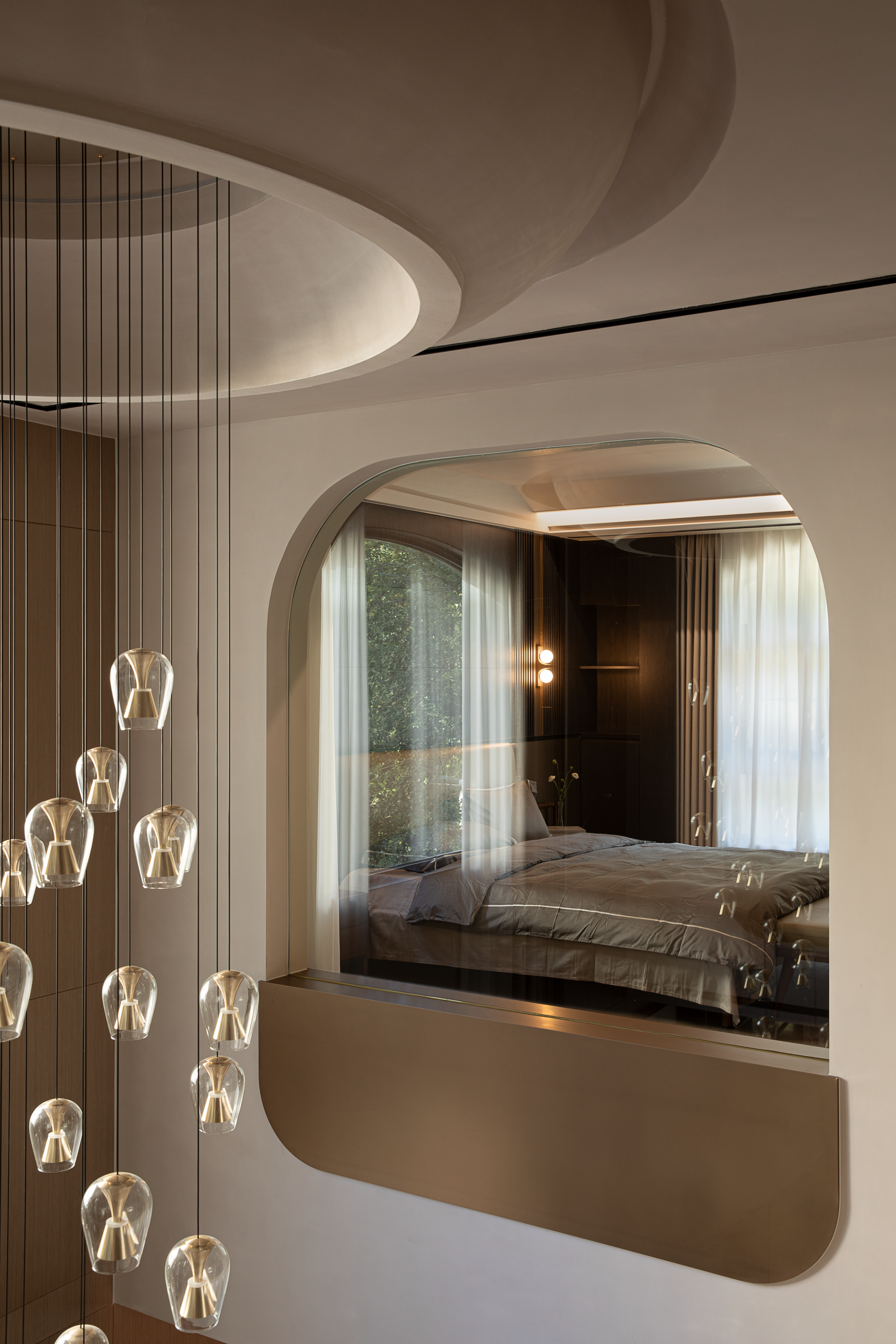 项目定位:本项目以勒·柯布西耶“住宅是居住的机器”为哲学内核,提出“艺术化运转的生活容器”定位。设计通过“金烟织杼·光影着痕”的叙事主线,将功能效率与情感体验深度融合。一层以动态生活场景为核心,打造贯通式动区;二层专注静谧起居,预留家庭结构演变弹性;地下室则成为归家首站的复合功能厅。整体策划强调空间随时间推移与居住者共同成长的“生命体”属性。