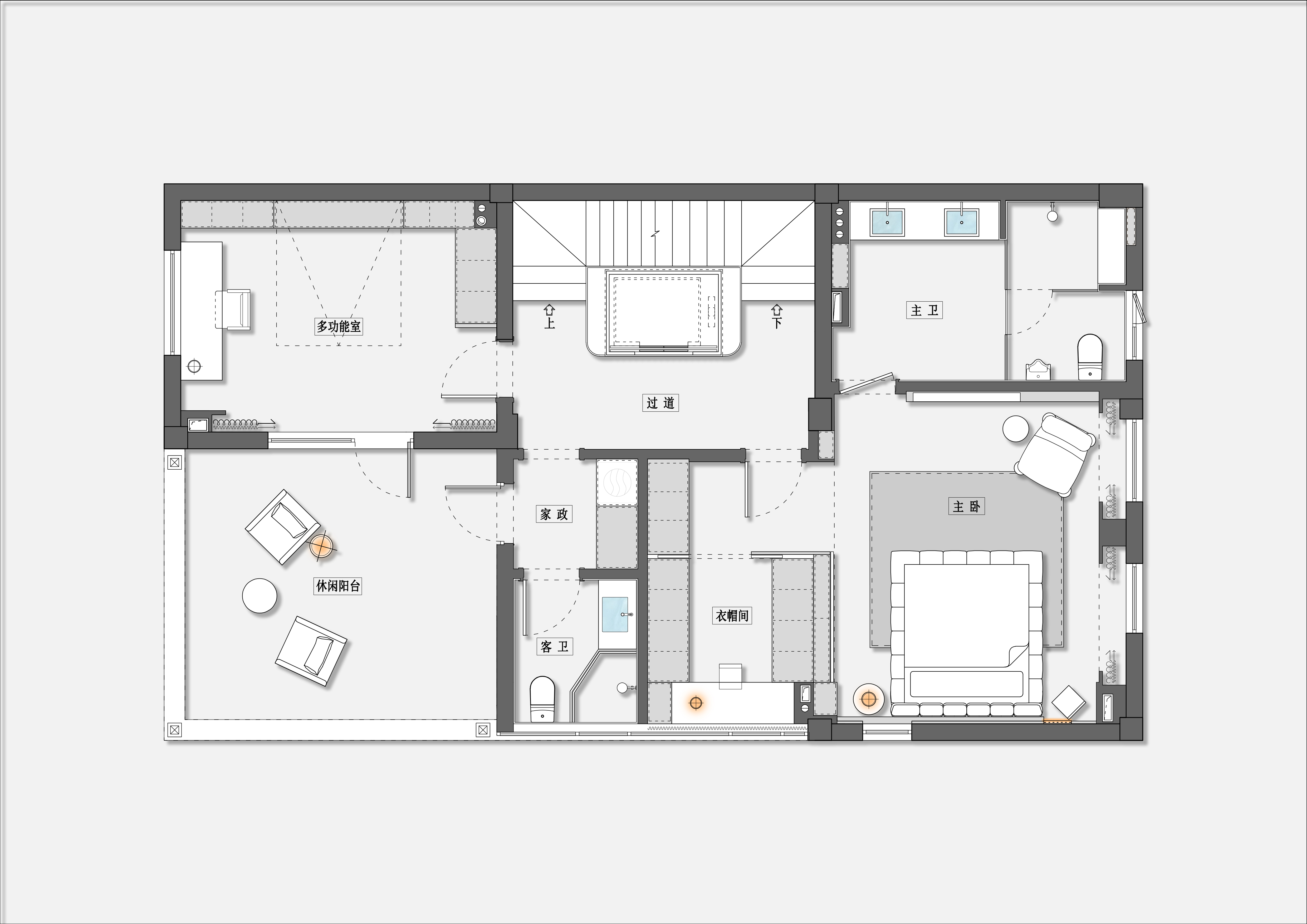 弹性边界系统 :采用隐形移门、翻板床设计,实现书房/客房、主卧/卫浴等多重场景转换 -