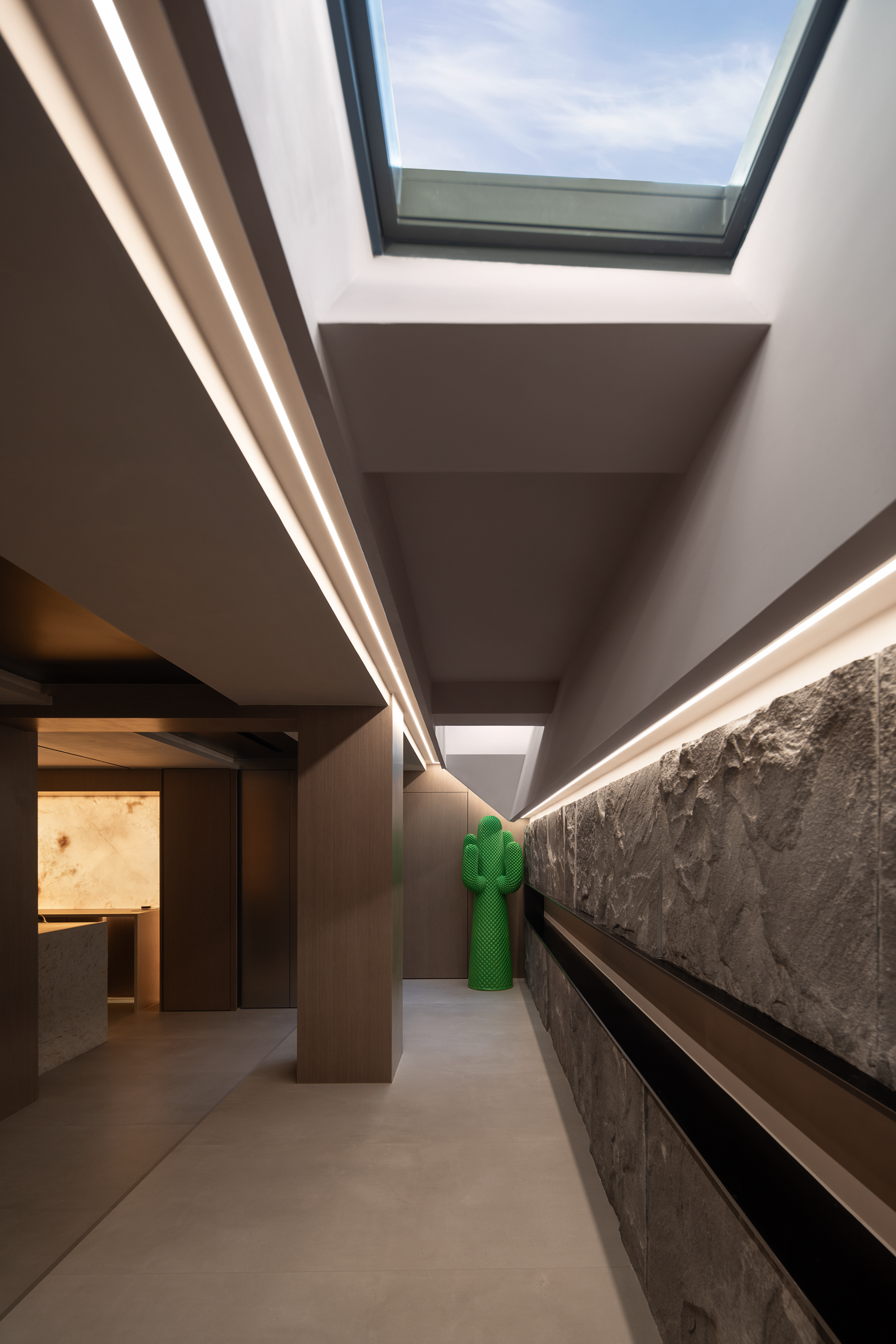 绿色建材应用 :发光石背景墙、木饰面等材料预计选用低VOC版本,天窗设计减少白日照明依赖 -