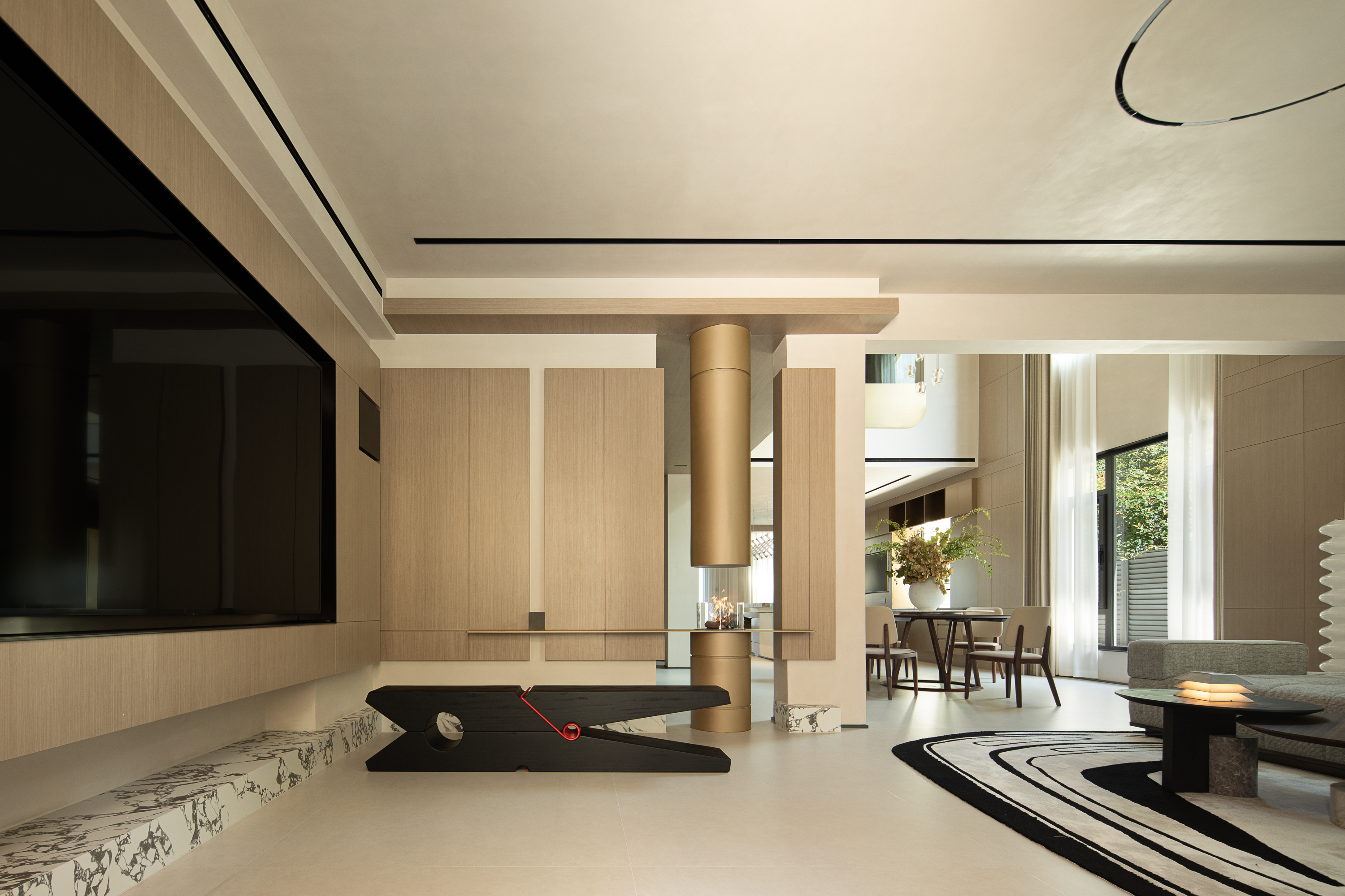 光影交织的序曲与焦点 双扇入户大门开启归家仪式感。玄关摒弃传统隔断,布局通透。100寸电视屏幕如现代画框,奠定空间的科技与娱乐基调。天花嵌入的线型灯带纵向延伸了空间感,其利落线条与壁炉、圆形茶几构成方圆的视觉对仗。金属的冷冽与木饰面的温润巧妙碰撞,跃动的火焰在光影雕琢下,成为空间的精神图腾,完美诠释了艺术锋芒与生活暖意的共生。