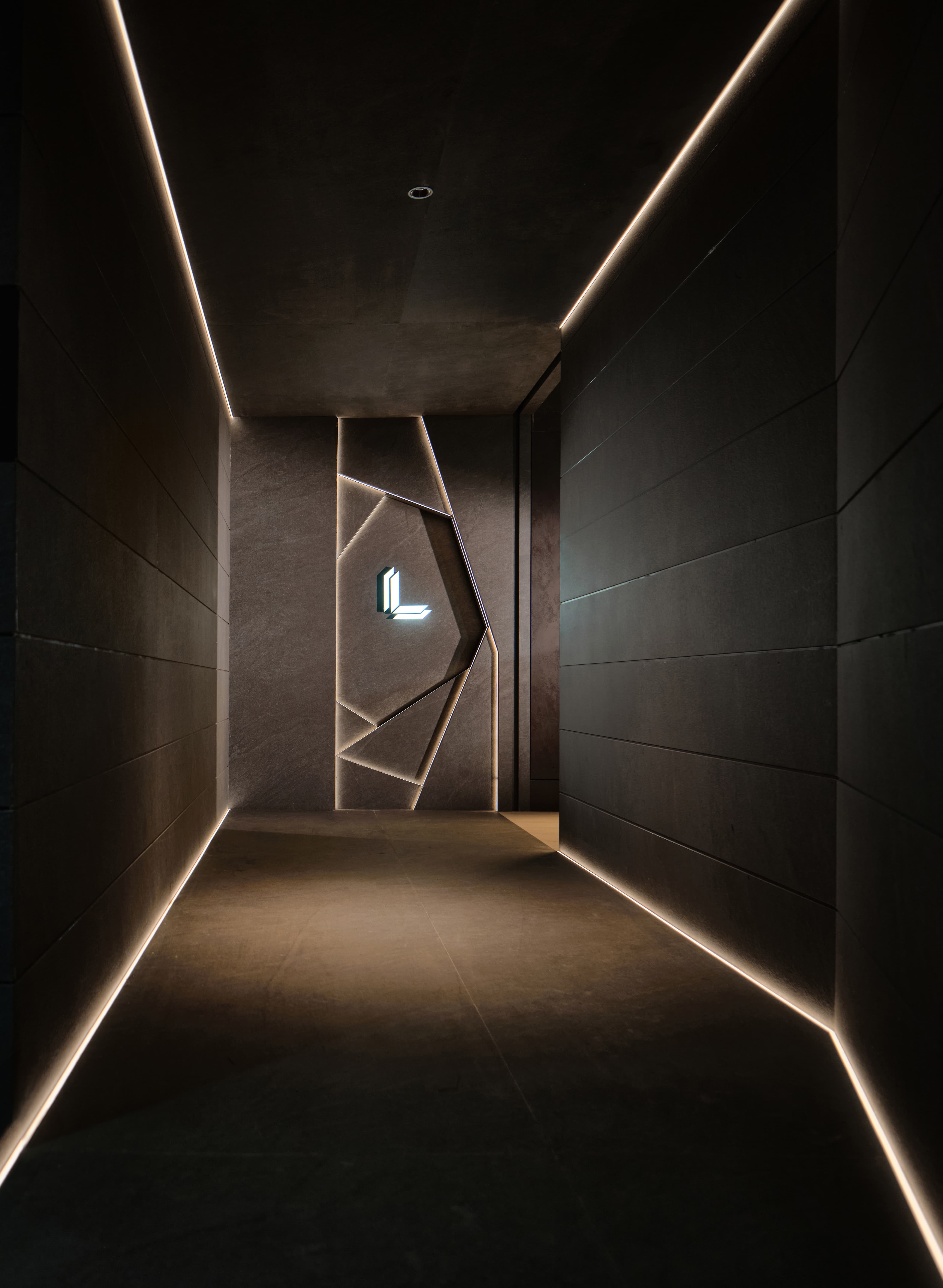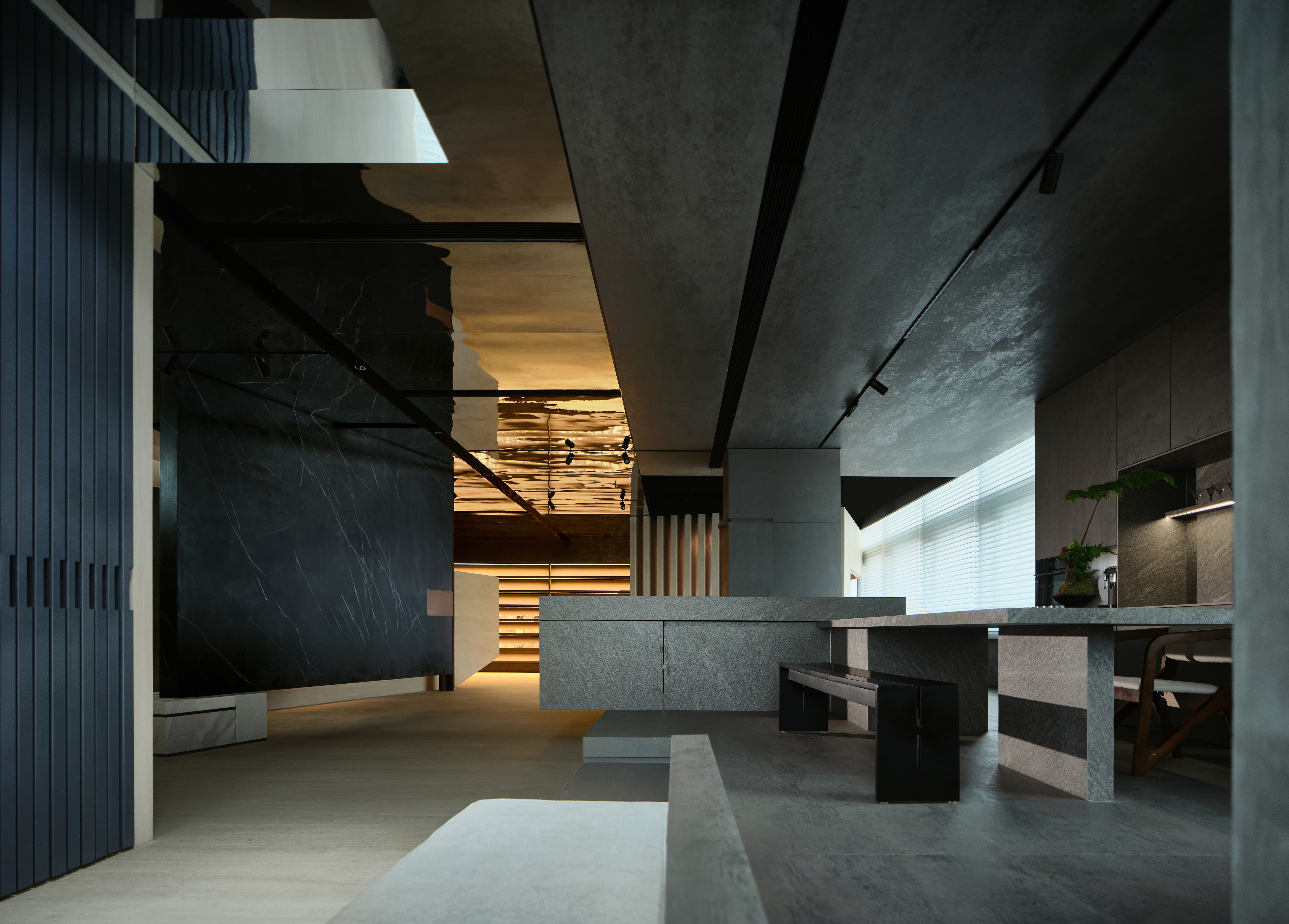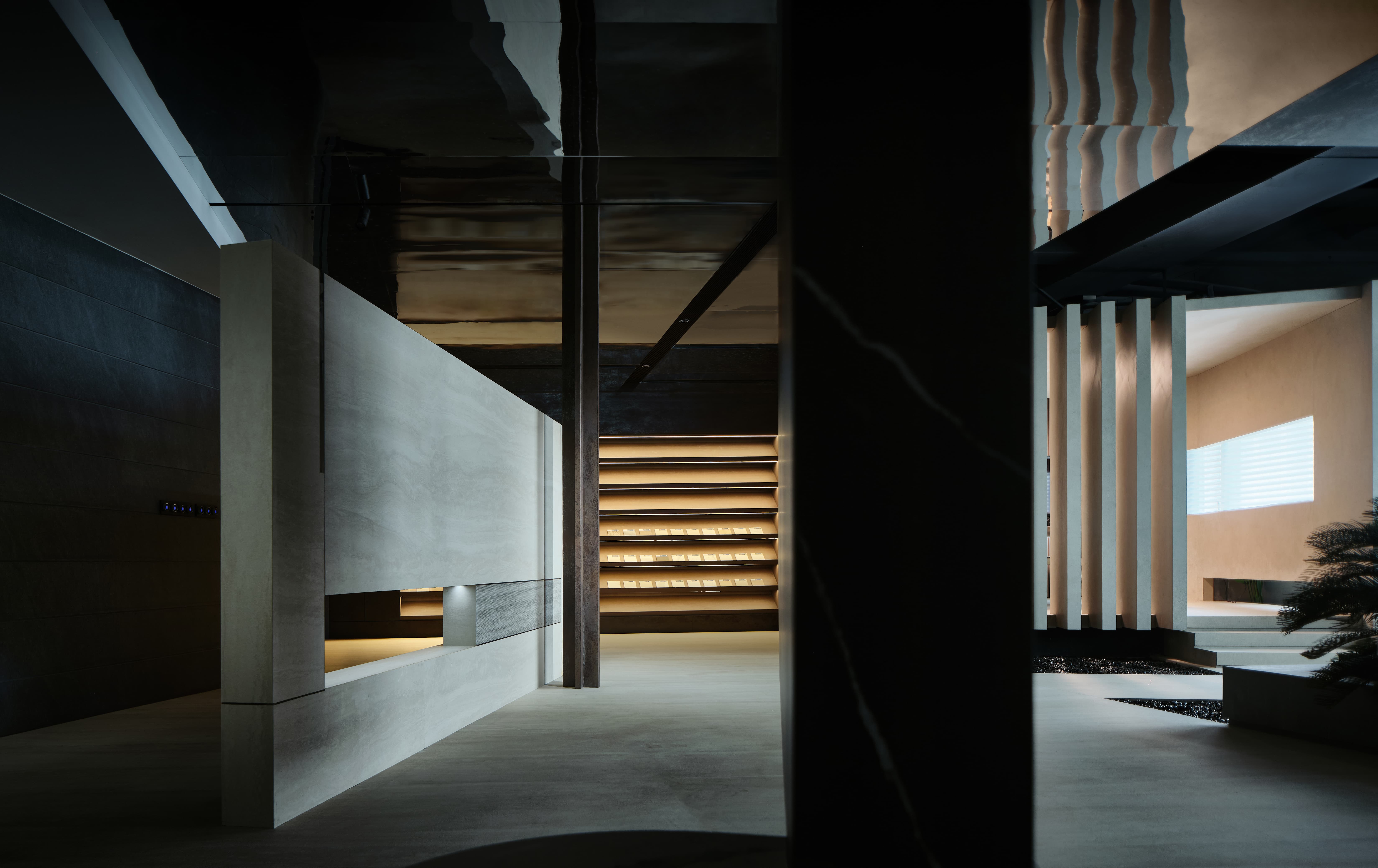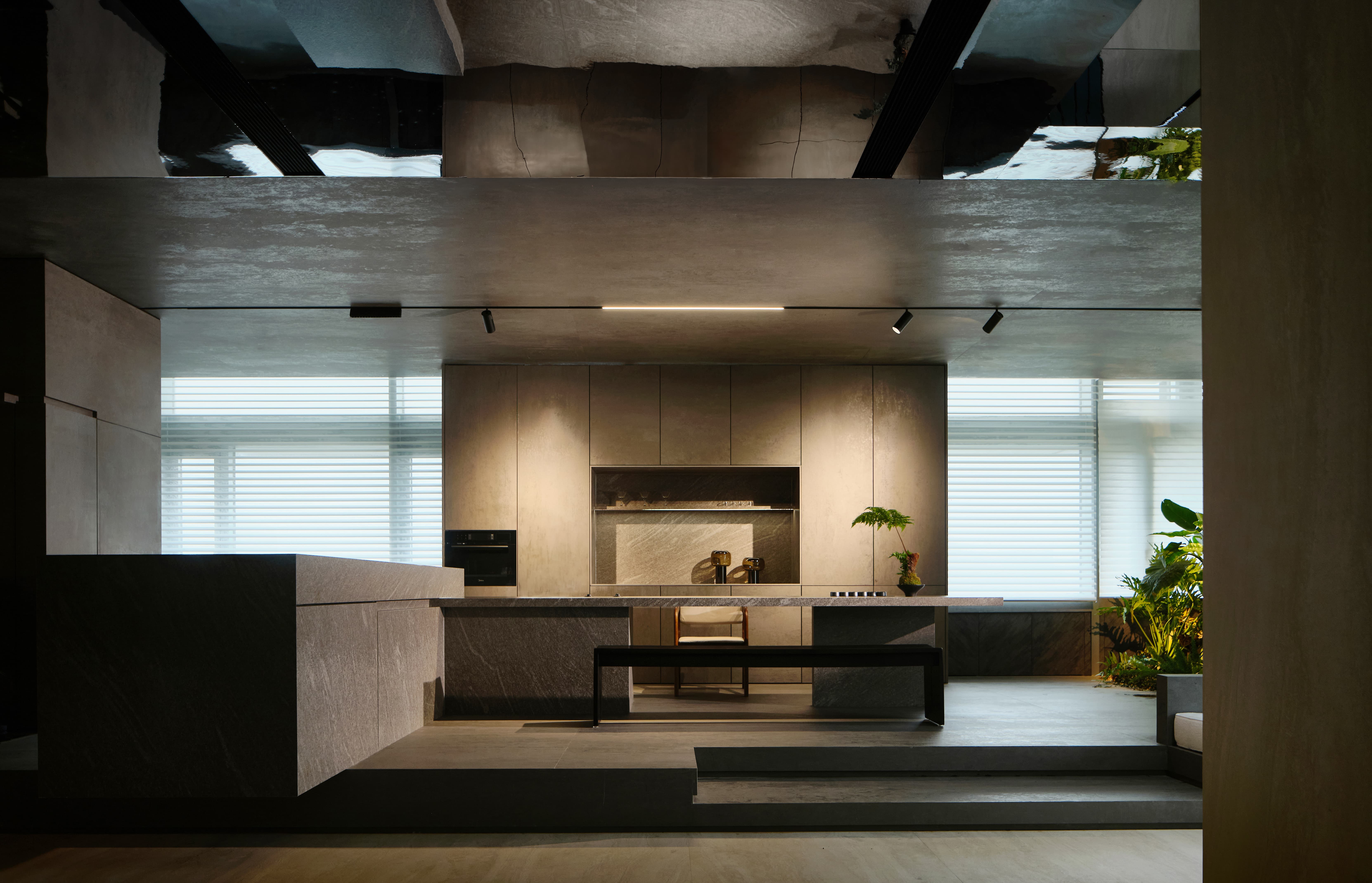 设计选材:在灯光设计上,使用线性灯带,凸显岩板细腻的材质,拉伸空间,体现空间质感。让展厅入口的氛围感更加神秘深邃,使人们在进入展厅时产生一种仪式感,和渐入神秘空间的期待与体验。顶面采用镜面不锈钢材质做吊顶,从视觉上加强了纵深关系,使空间更加有层次感。岛台会客区的顶、地、墙面以及主体岛台都使用了仿混凝土的岩板材质,再以绿植加以中和点缀,为空间增加了许多粗犷又不失清新柔美的自然美学。利用光线强化细节质感,吸引用户探索隐藏的设计功能,着力打造一个纯净、自然、放松的洽谈体验空间。