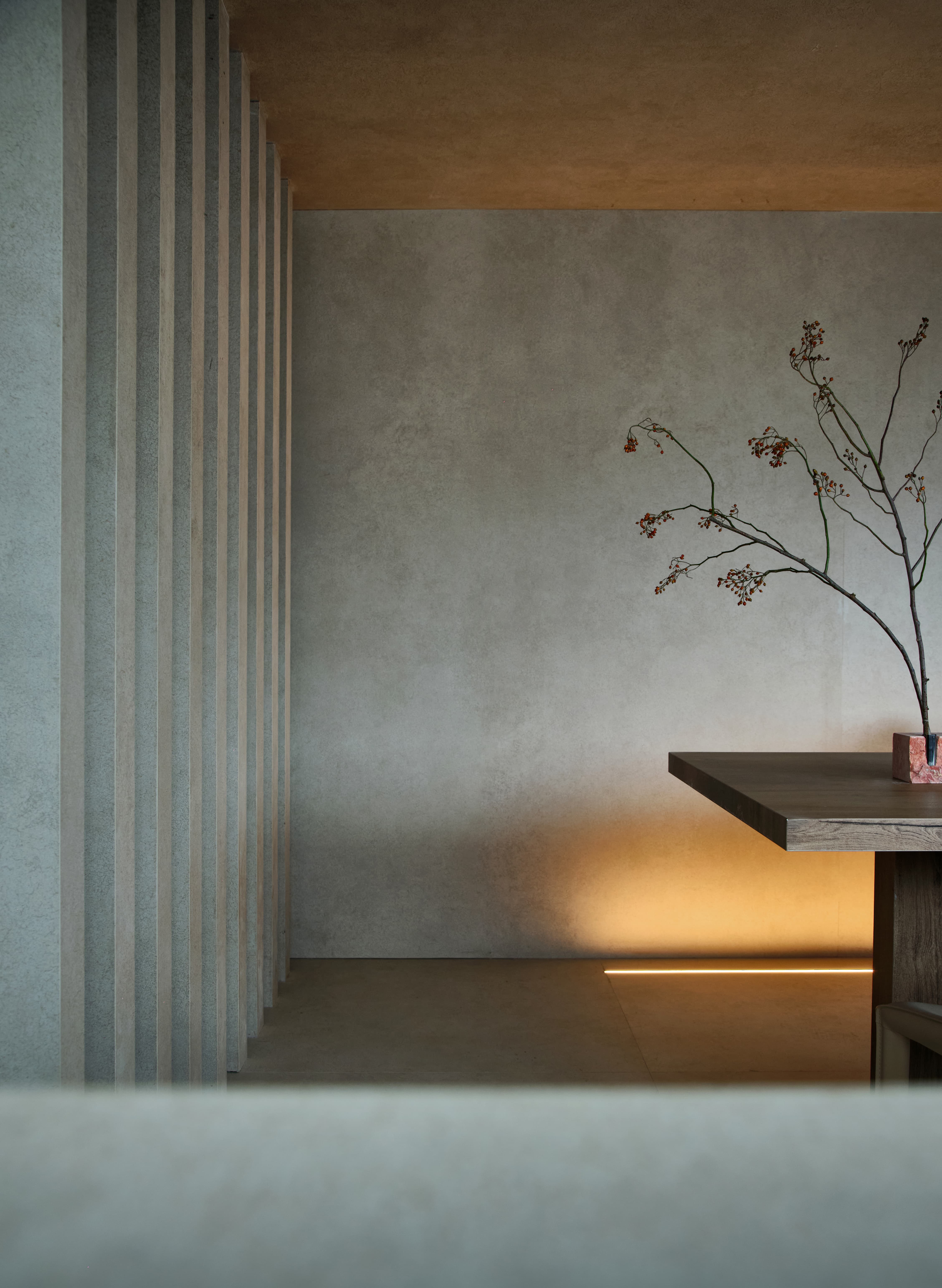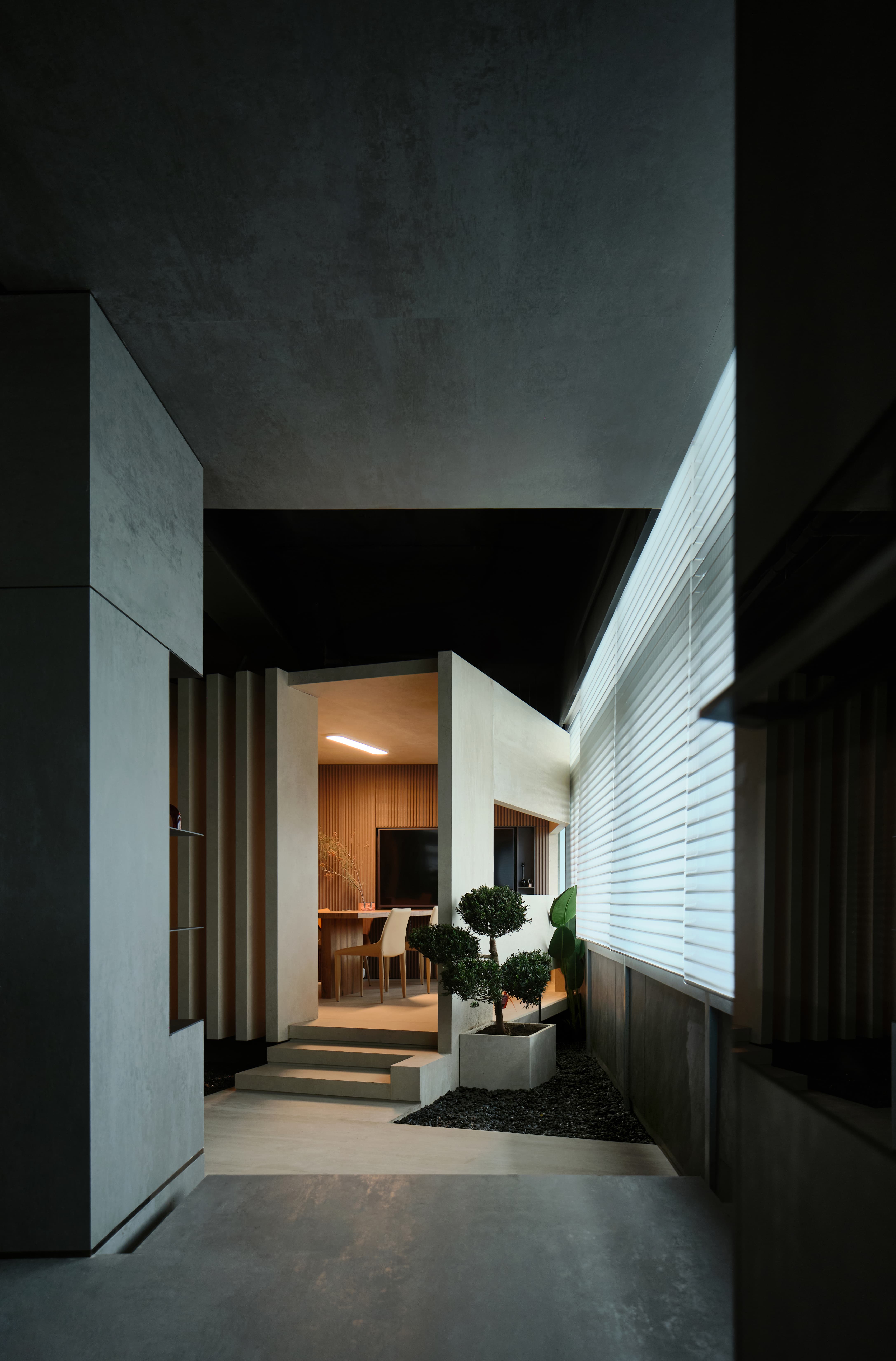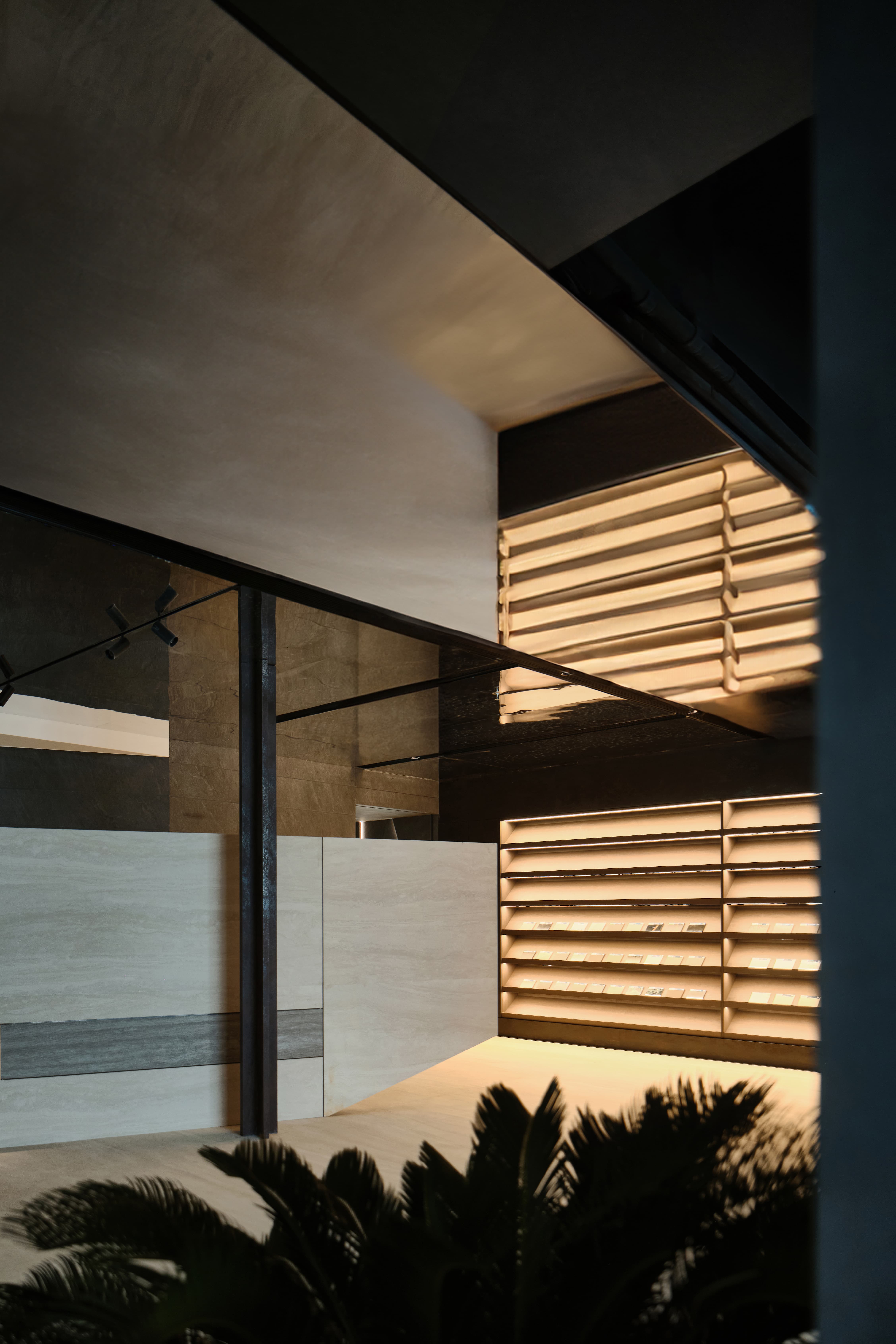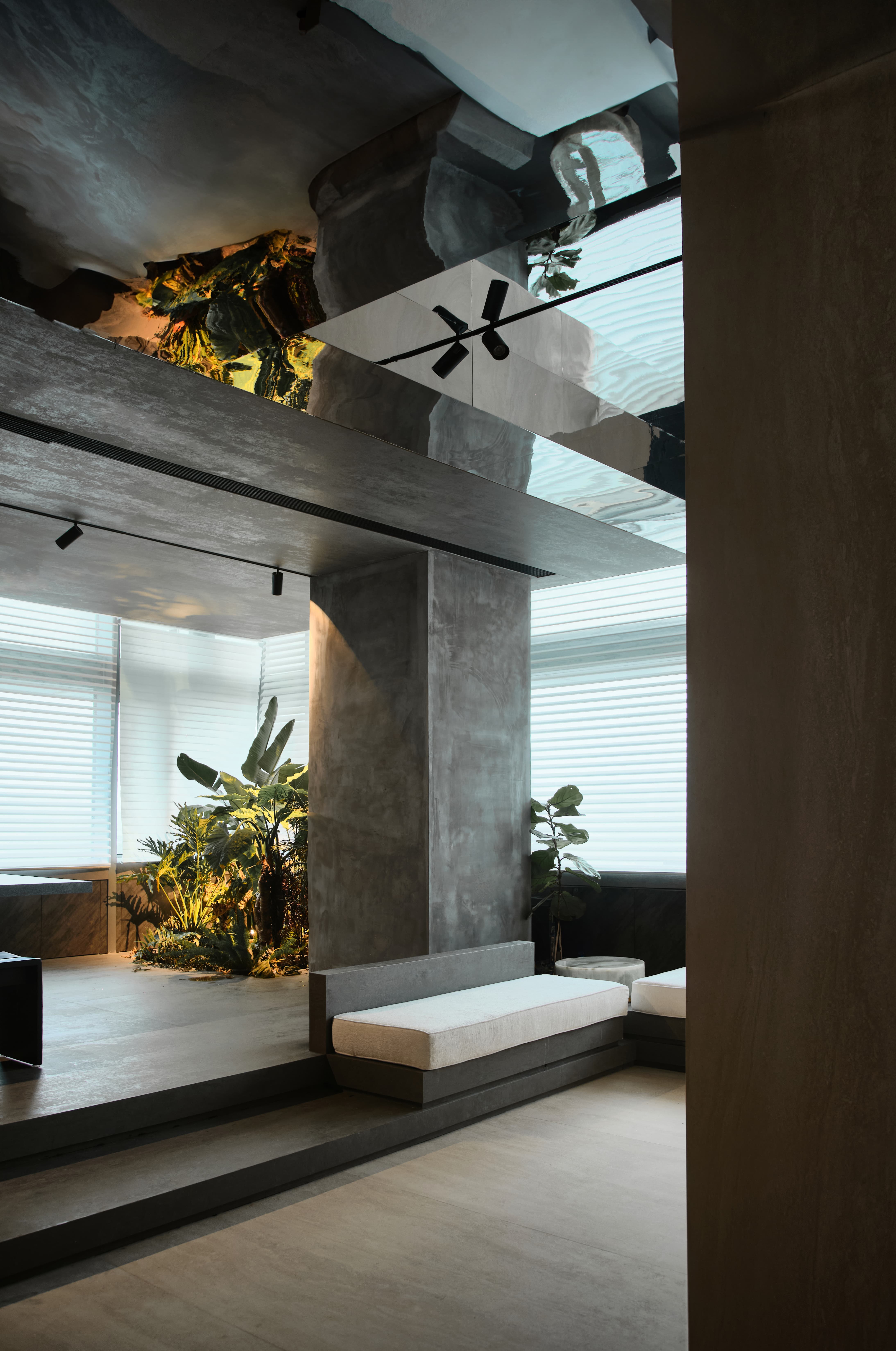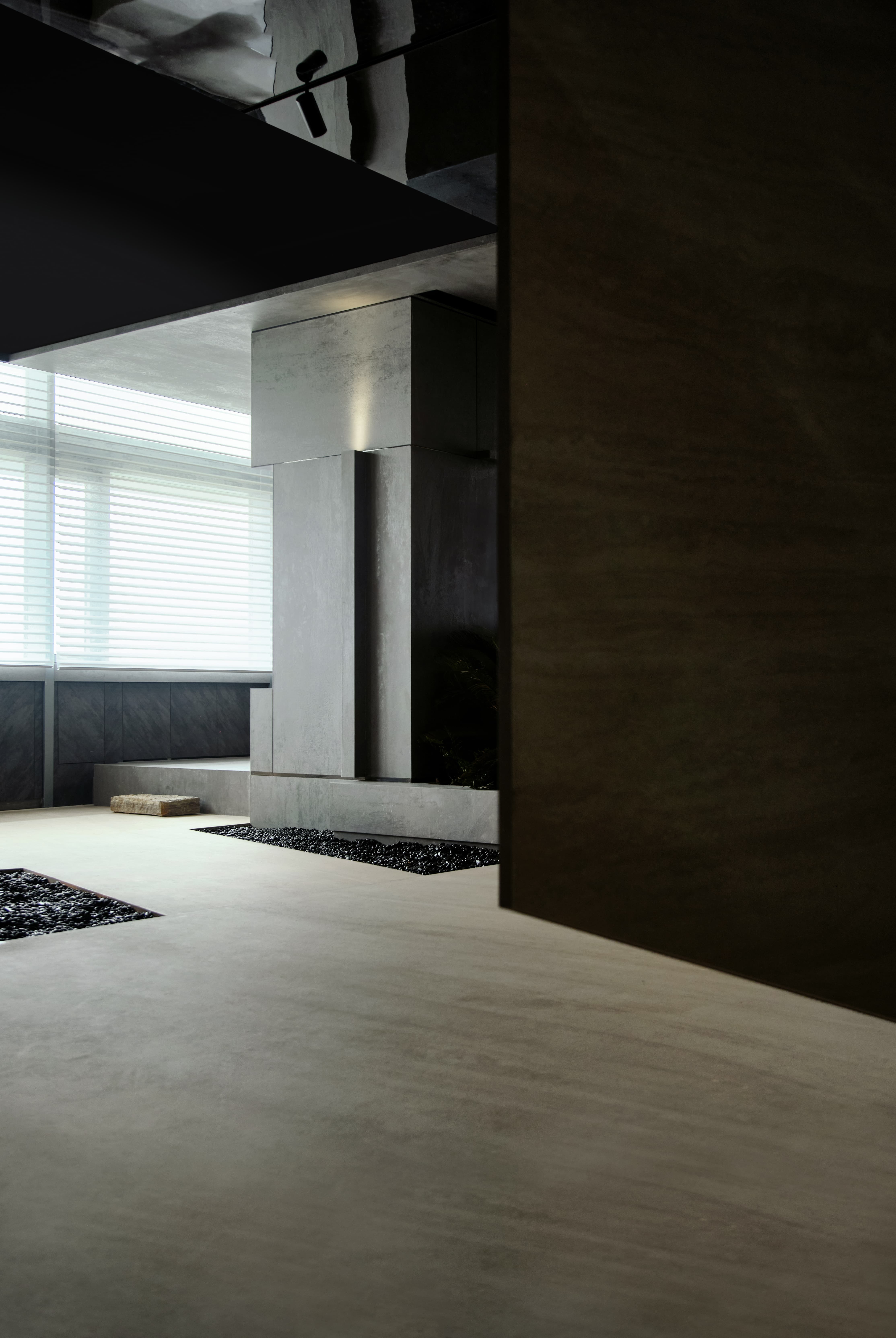 设计选材:在灯光设计上,使用线性灯带,凸显岩板细腻的材质,拉伸空间,体现空间质感。让展厅入口的氛围感更加神秘深邃,使人们在进入展厅时产生一种仪式感,和渐入神秘空间的期待与体验。顶面采用镜面不锈钢材质做吊顶,从视觉上加强了纵深关系,使空间更加有层次感。岛台会客区的顶、地、墙面以及主体岛台都使用了仿混凝土的岩板材质,再以绿植加以中和点缀,为空间增加了许多粗犷又不失清新柔美的自然美学。利用光线强化细节质感,吸引用户探索隐藏的设计功能,着力打造一个纯净、自然、放松的洽谈体验空间。