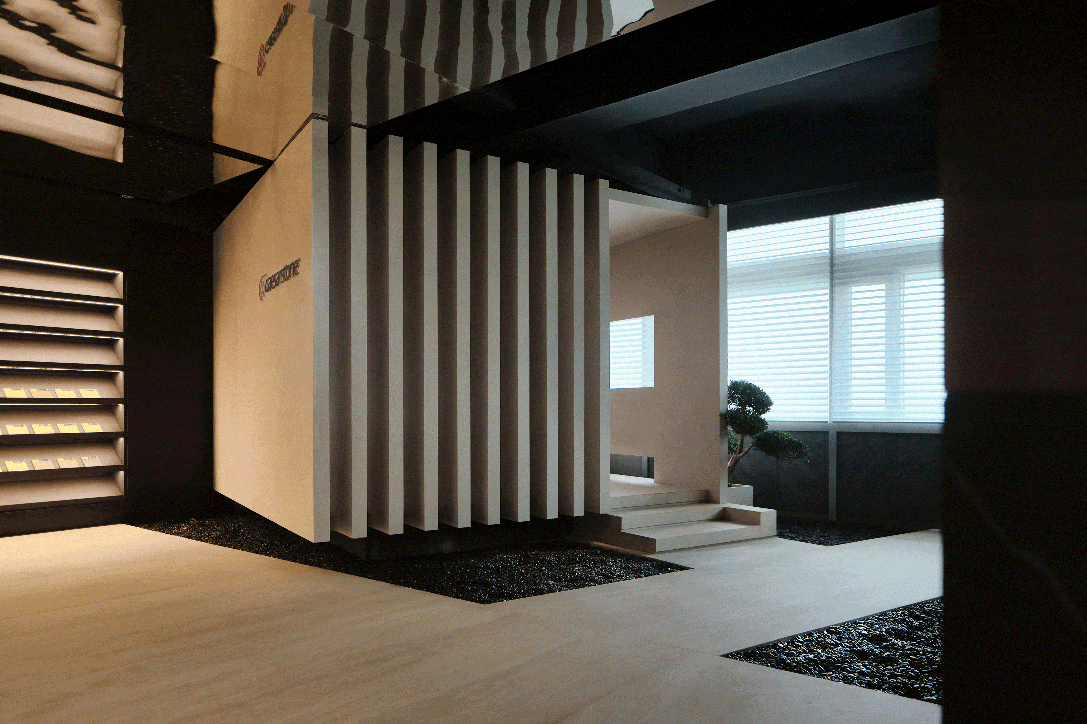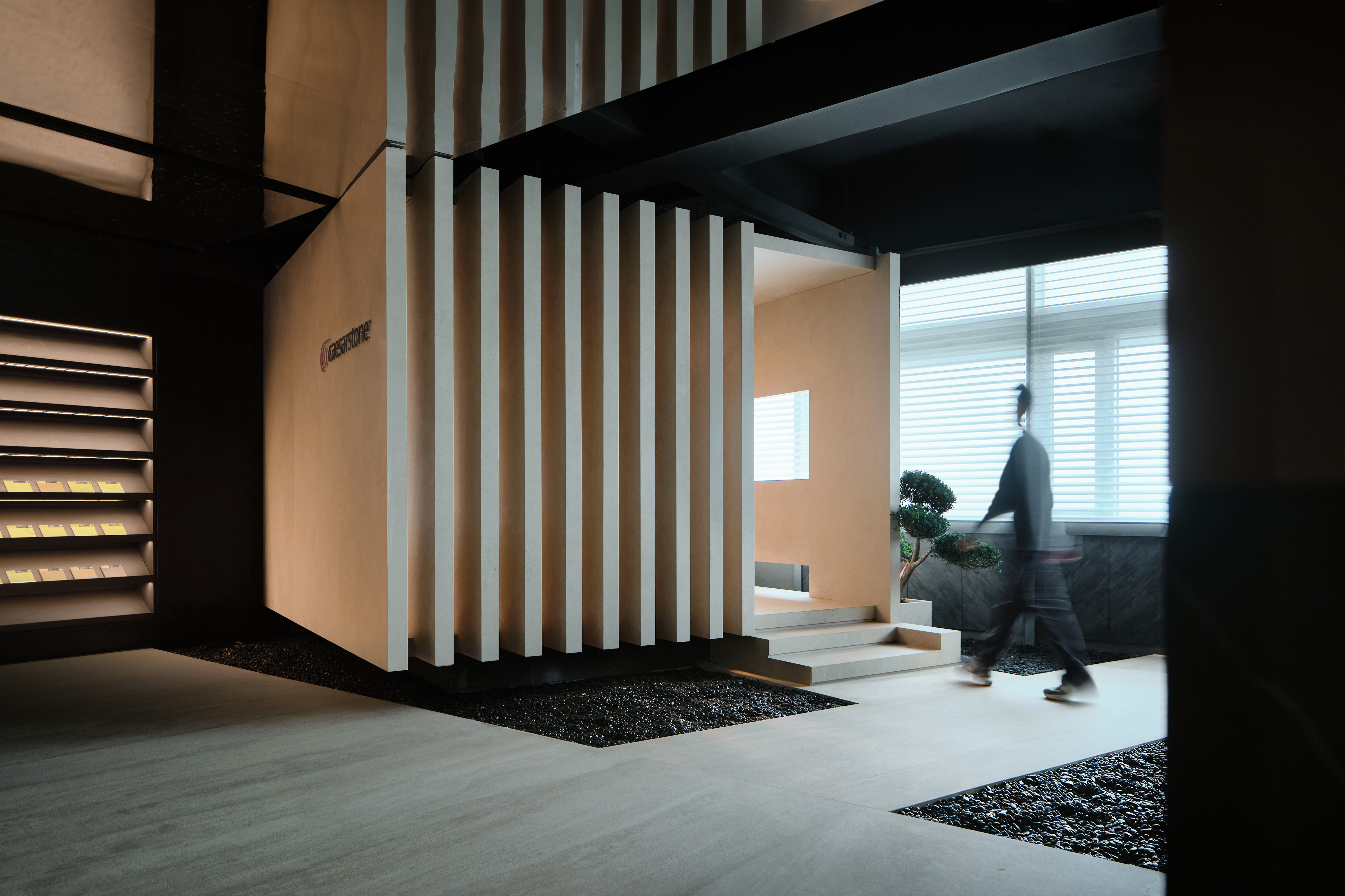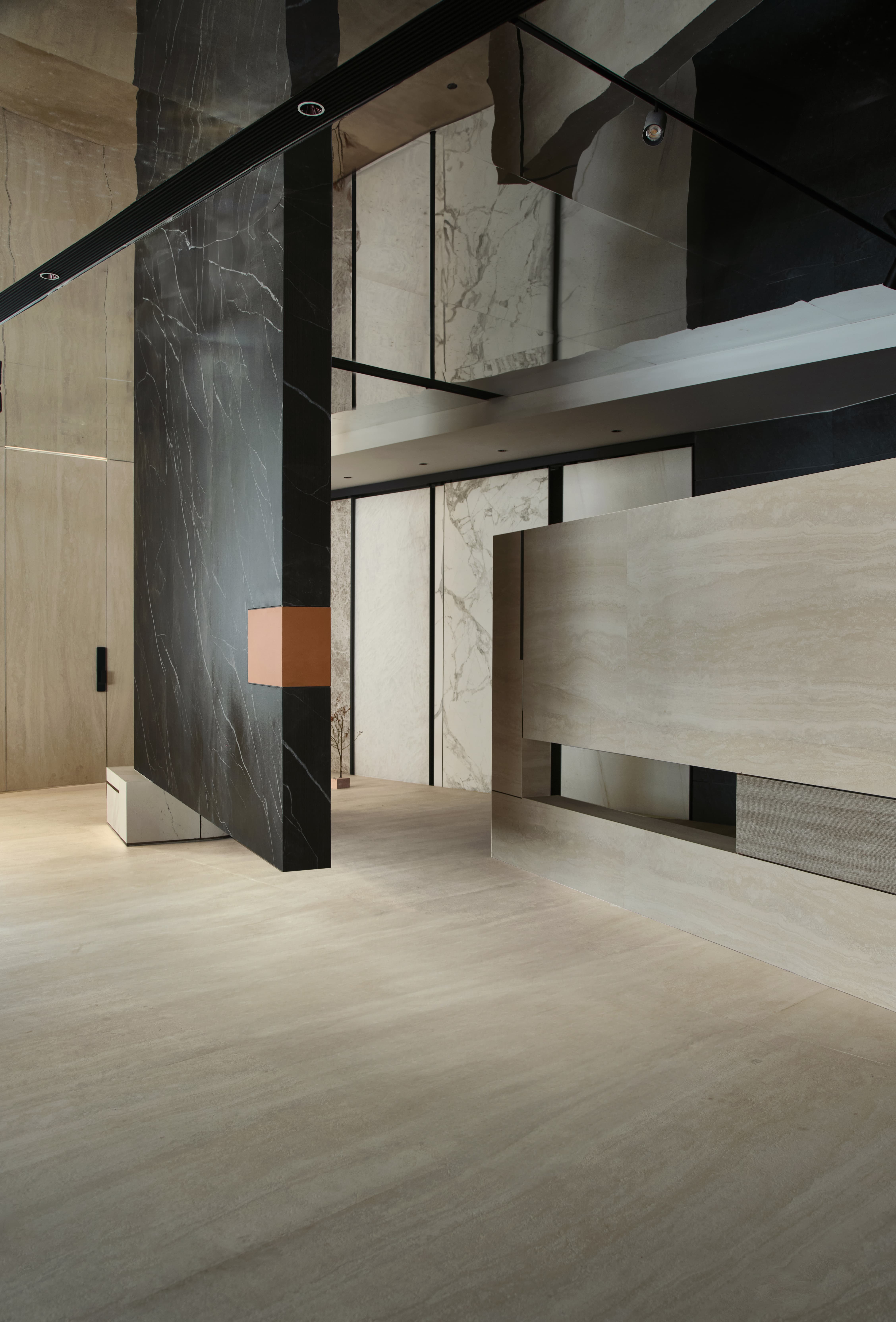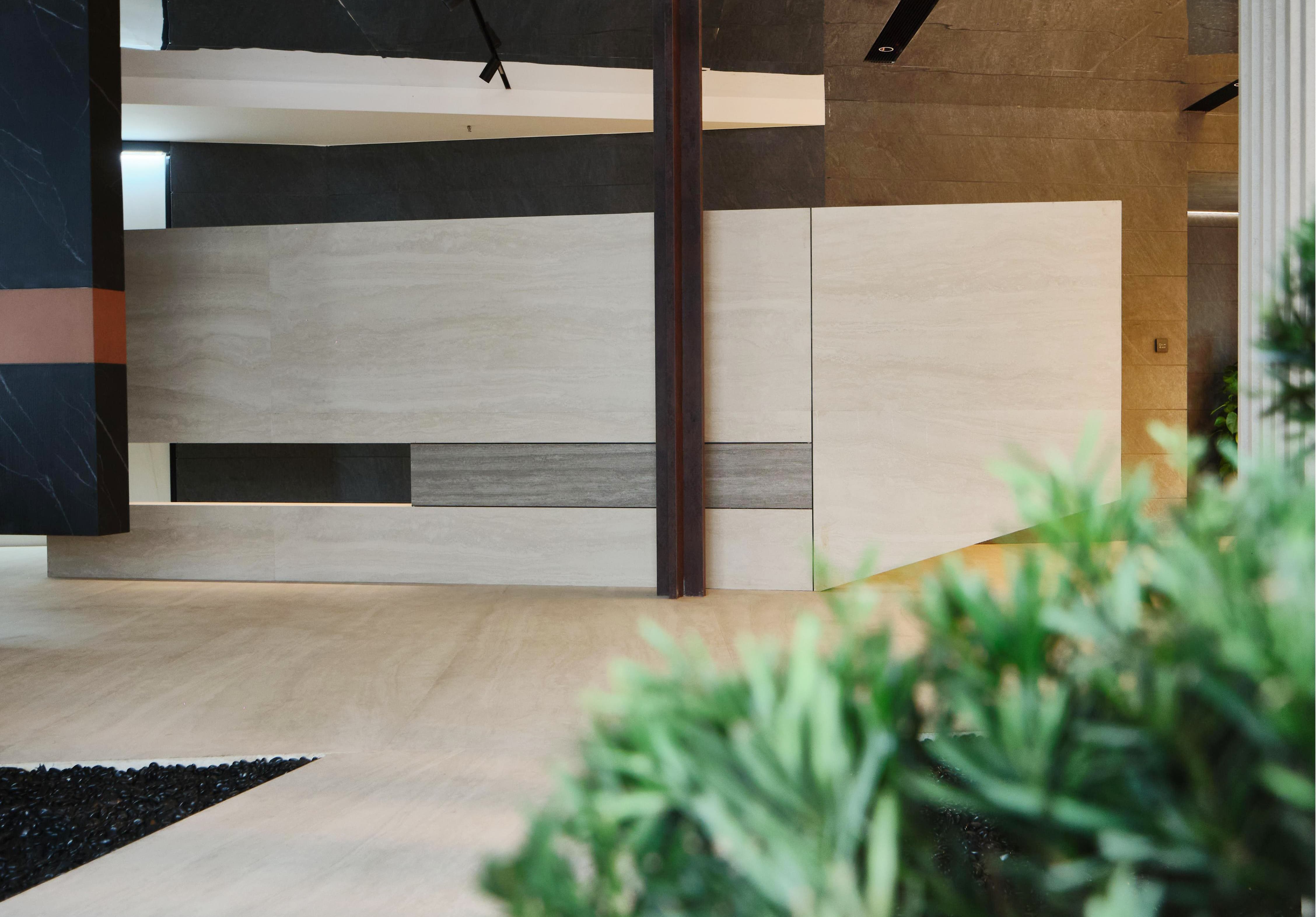项目定位:展厅地址位于写字楼里内,通过公共走廊步入。在这个200平的空间内,设计师通过特殊的材质、造景,让Laminam展厅脱颖而出、不拘一格。