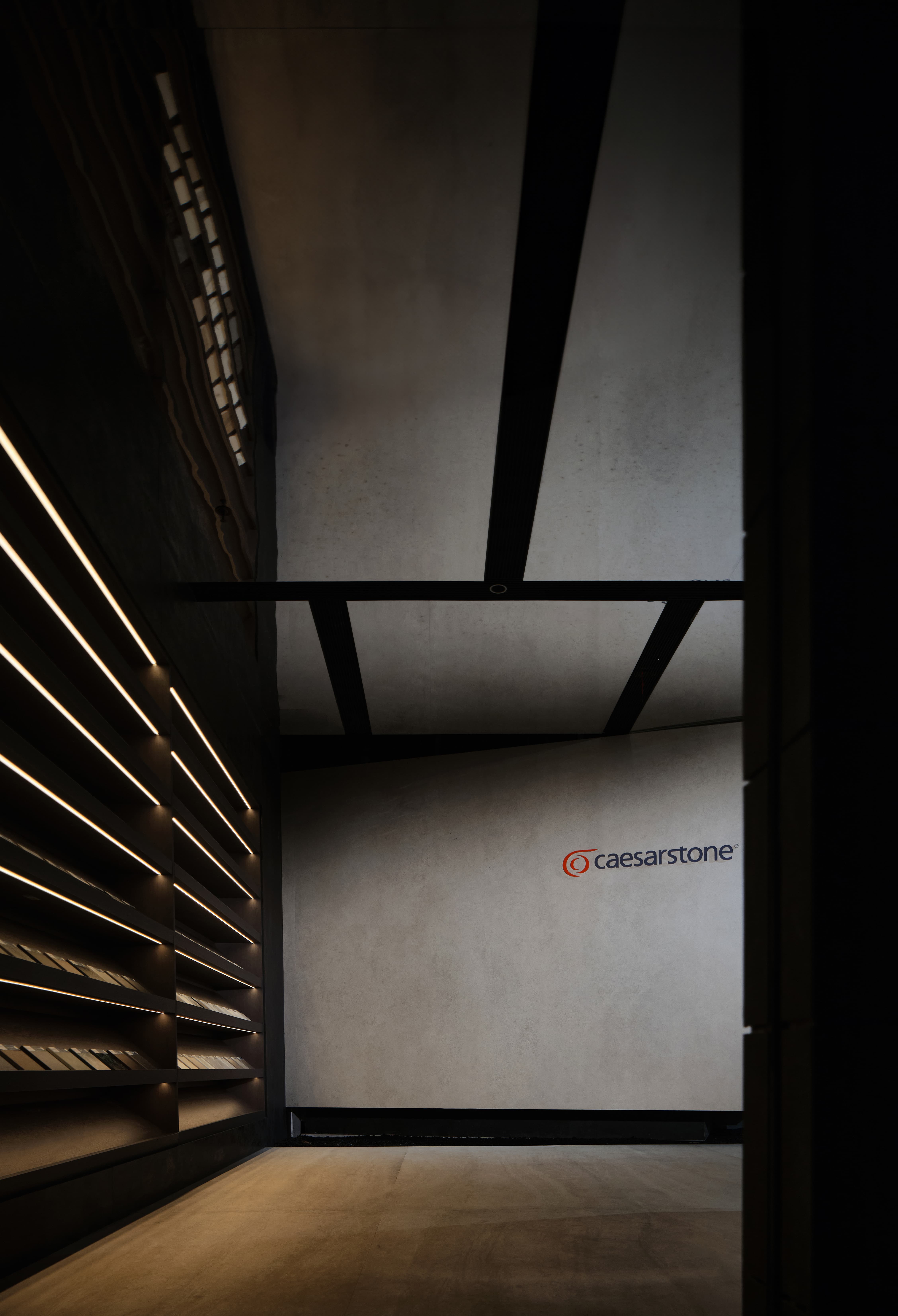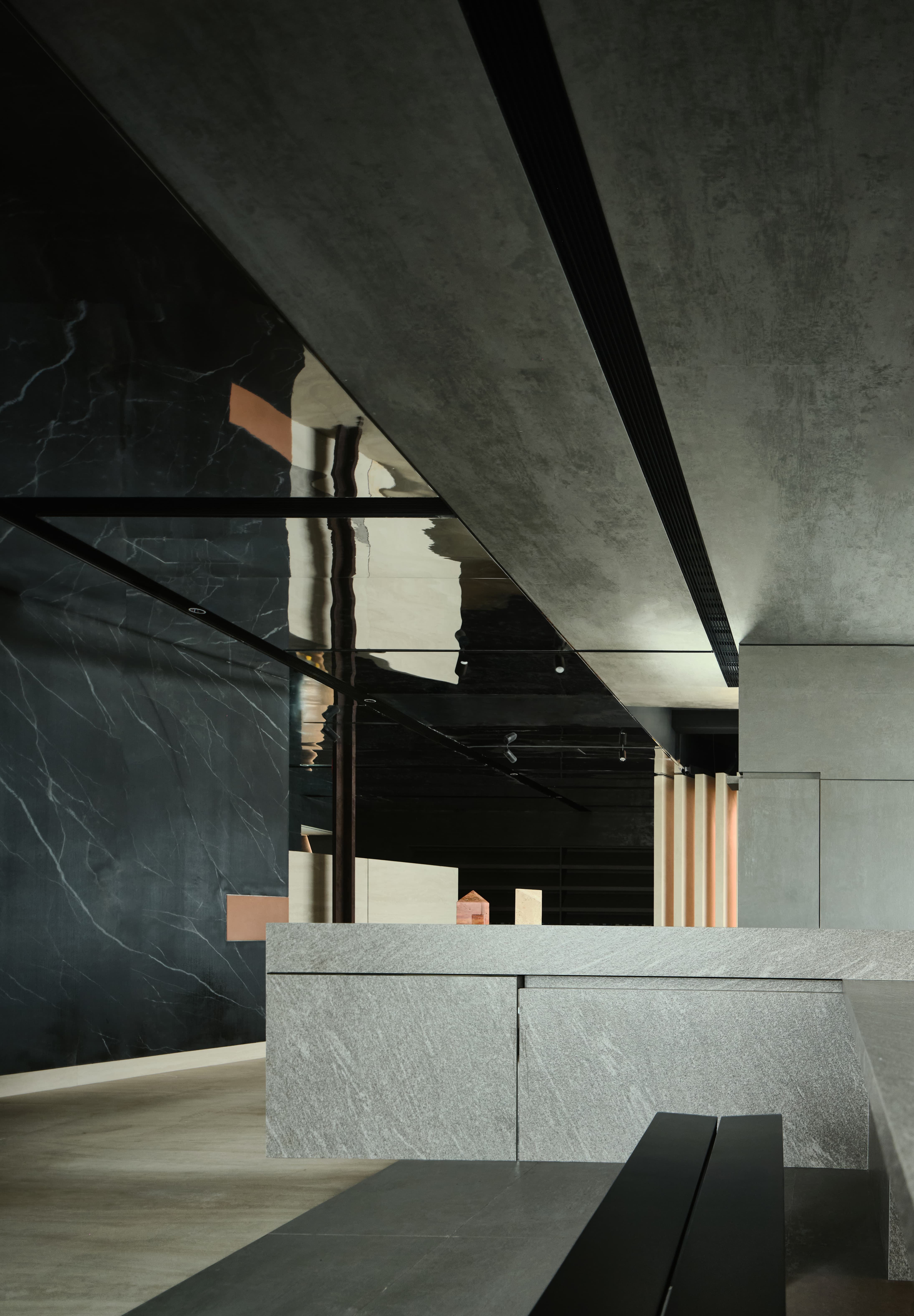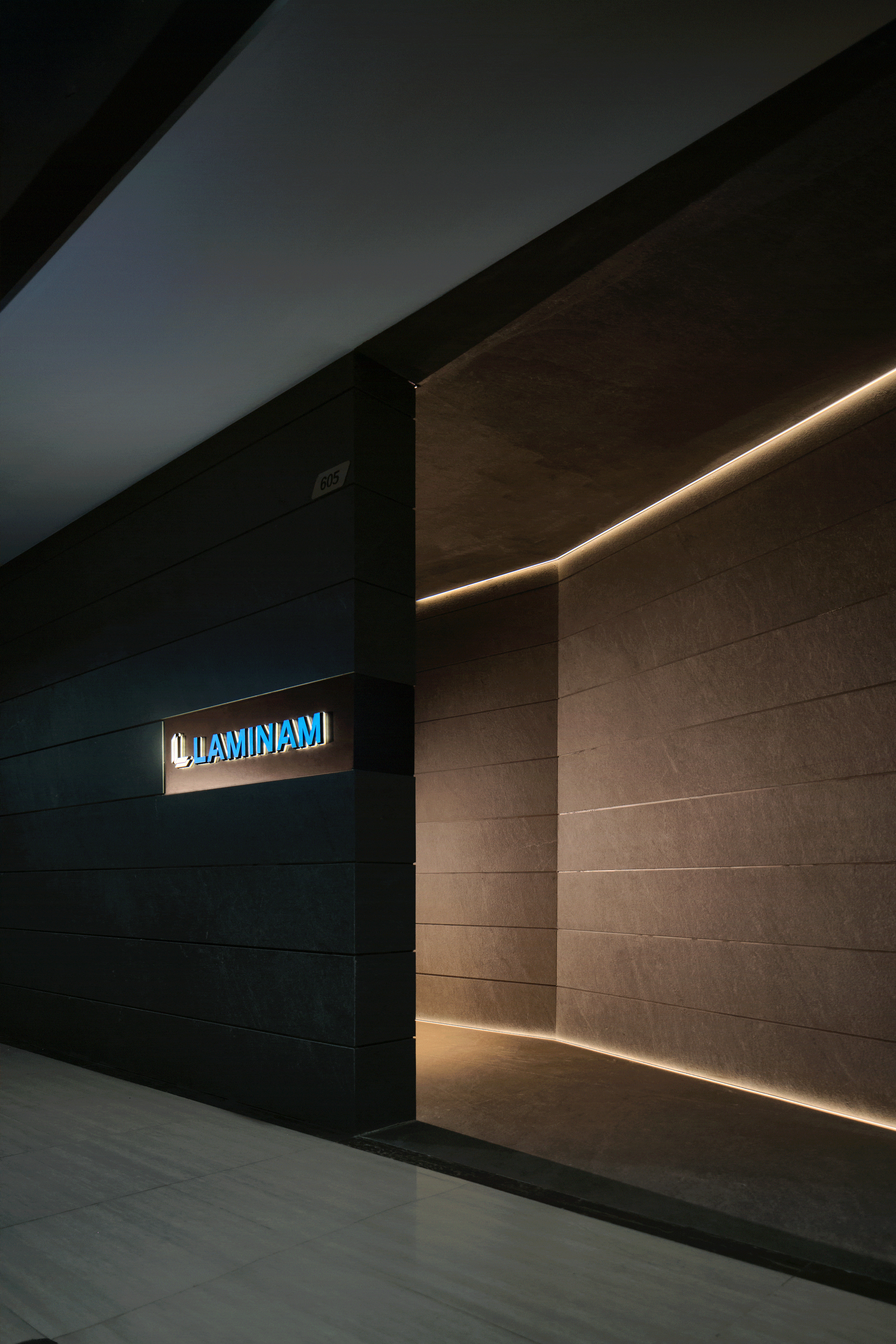 项目定位:展厅地址位于写字楼里内,通过公共走廊步入。在这个200平的空间内,设计师通过特殊的材质、造景,让Laminam展厅脱颖而出、不拘一格。