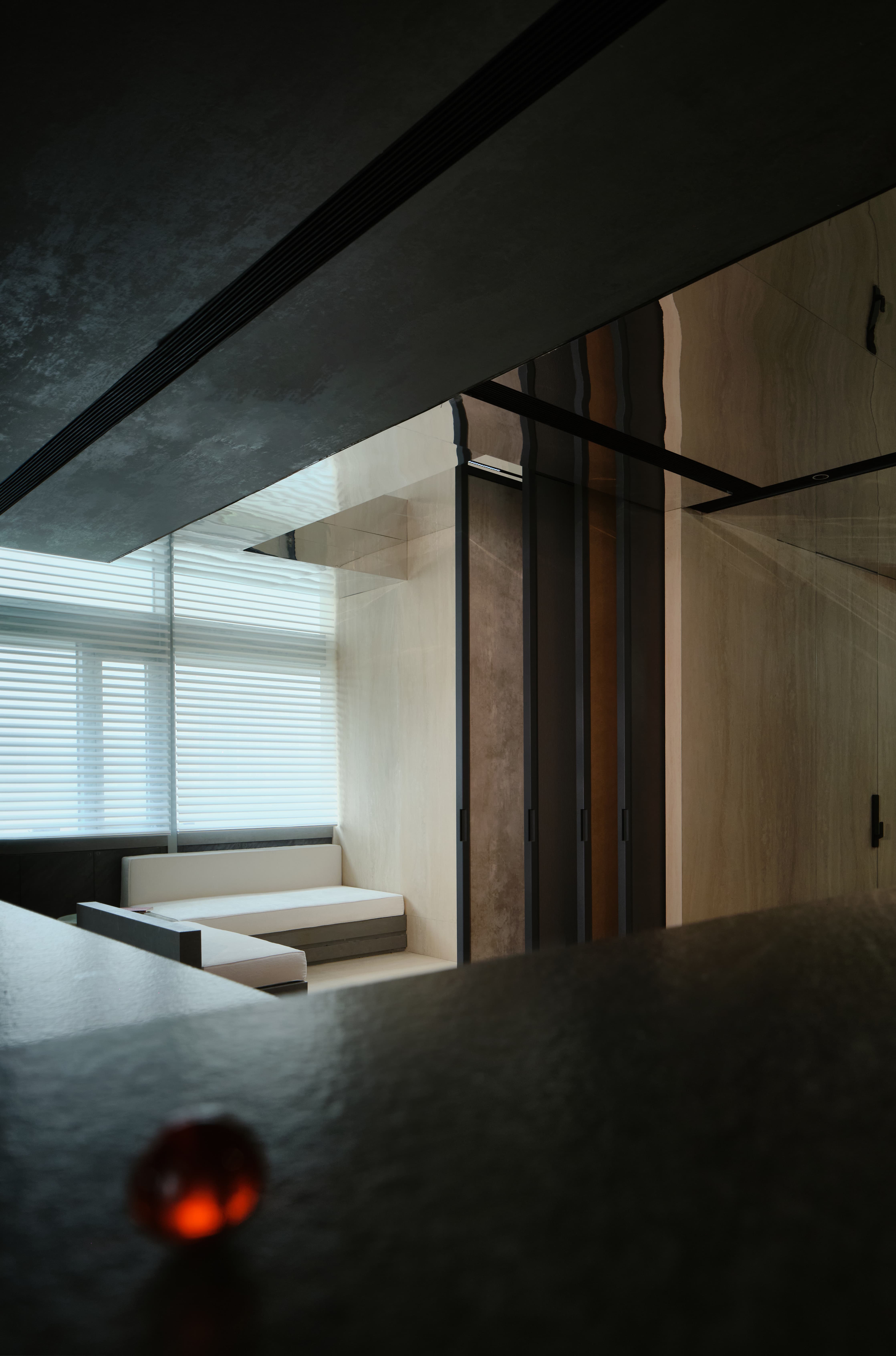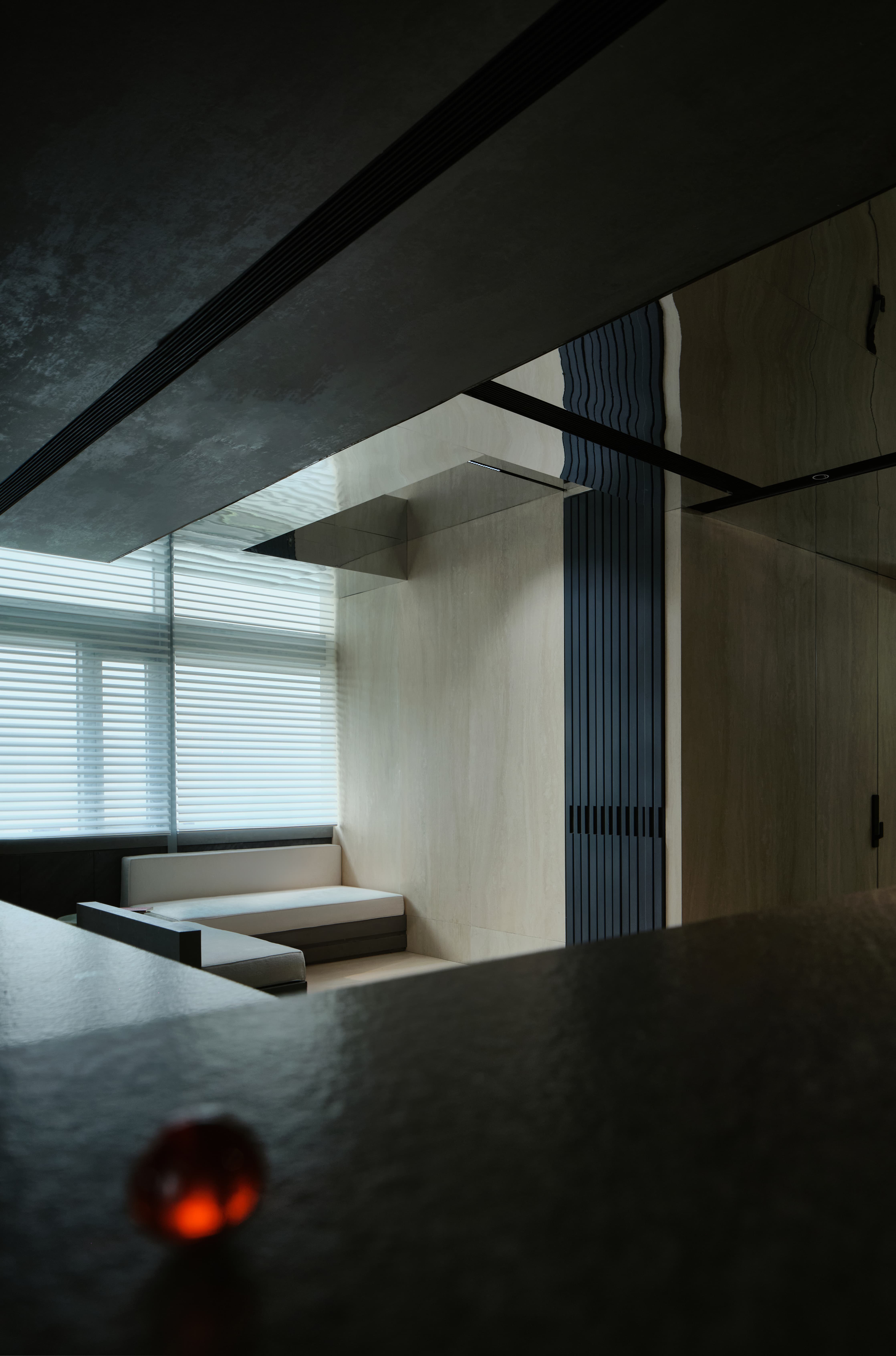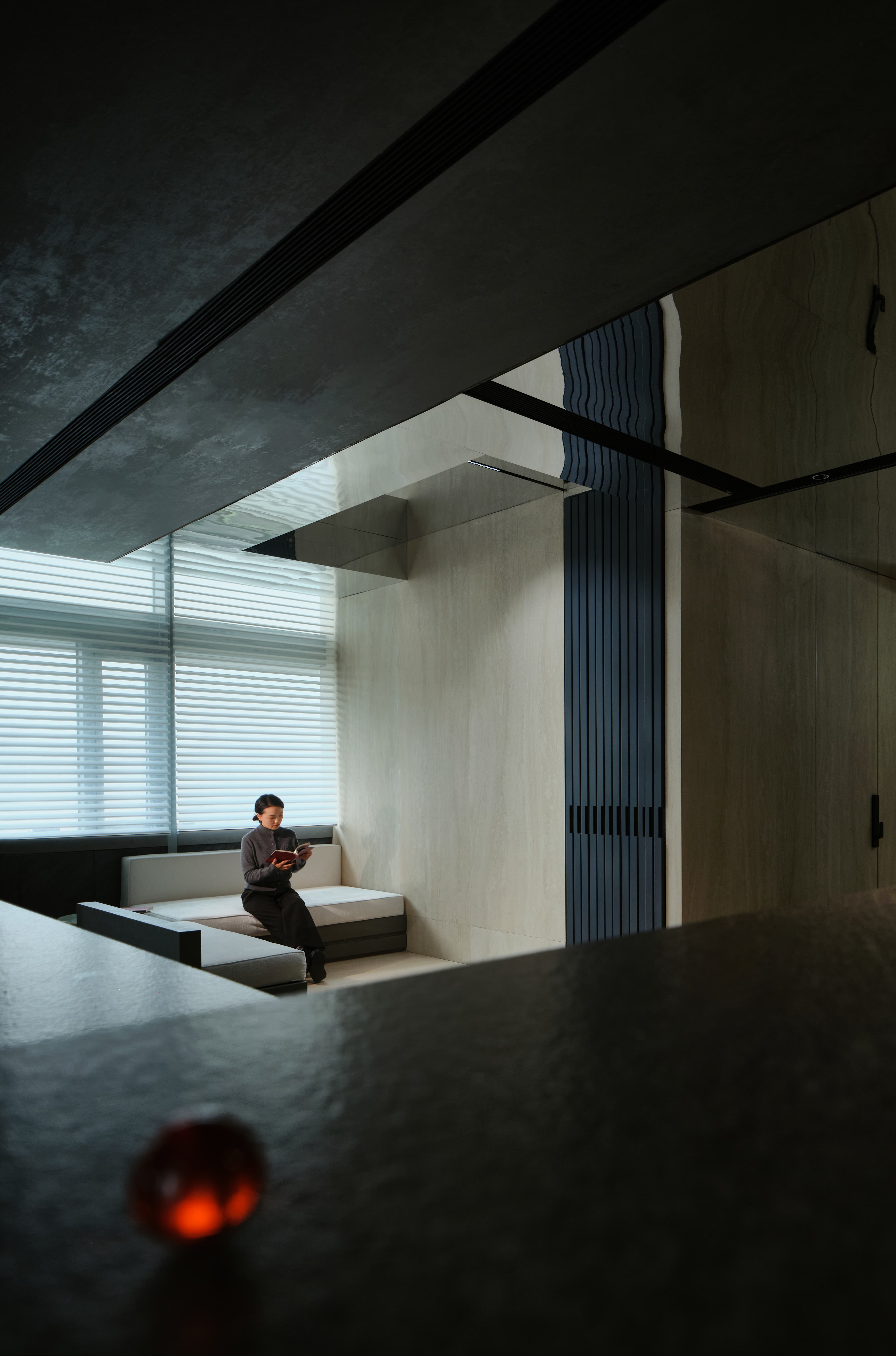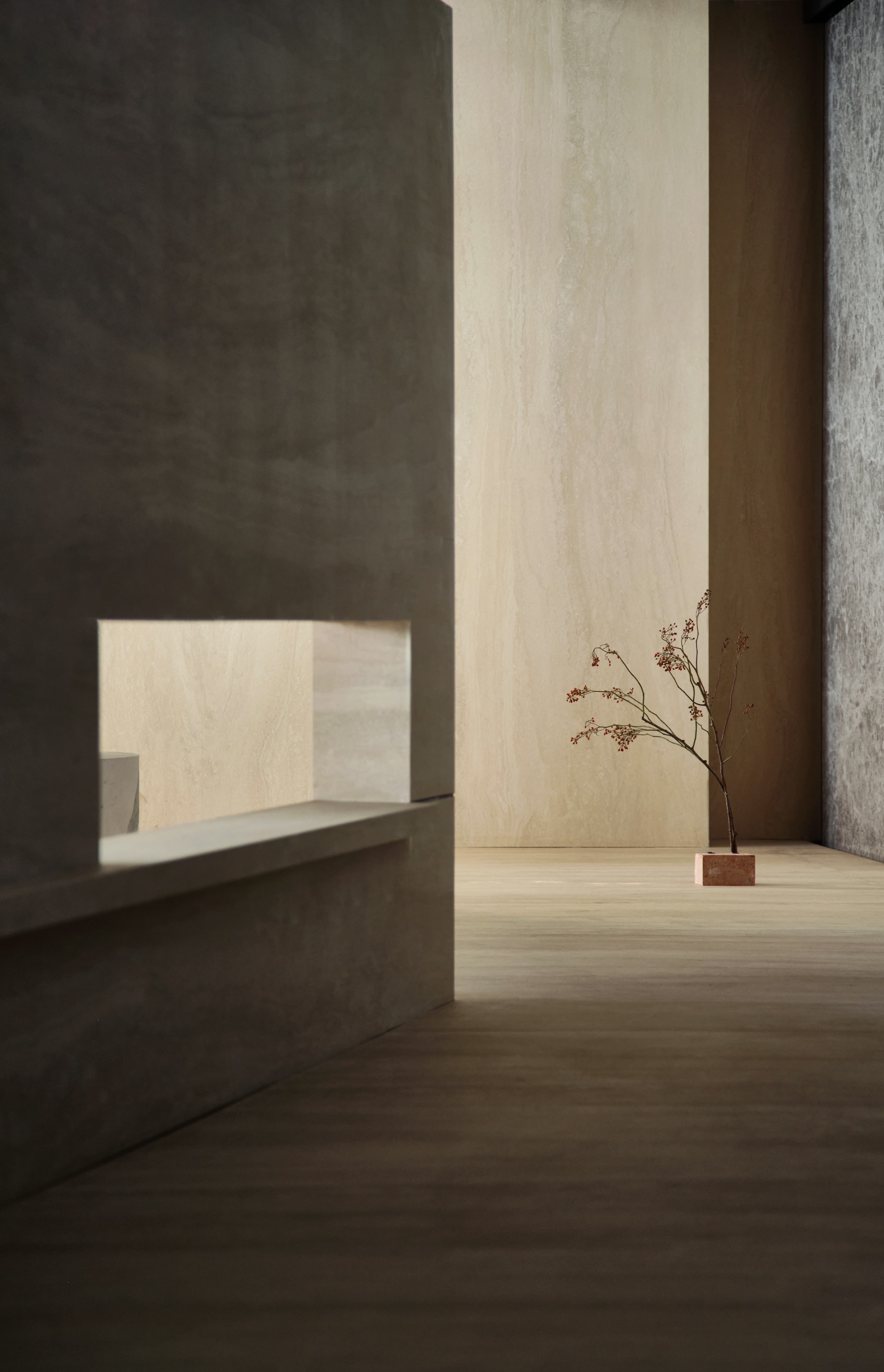 项目定位:展厅地址位于写字楼里内,通过公共走廊步入。在这个200平的空间内,设计师通过特殊的材质、造景,让Laminam展厅脱颖而出、不拘一格。