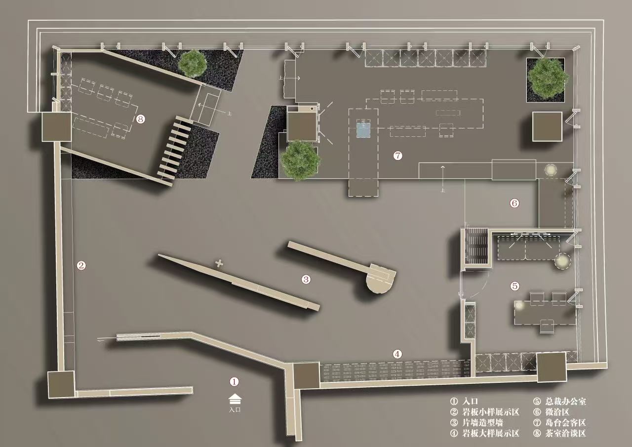 空间意境:初入展厅,面前的就是小样展示区。由于层高限制,除了特殊的岛台会客区和茶室洽谈区之外,其他区域顶面都采用镜面不锈钢材质做吊顶,从视觉上加强了纵深关系,使空间更加有层次感。两面片墙装饰墙结构错落有致,轻盈的划分了空间动线。前面立地式的浅色片墙下方留了个矩形的洞口,既让光线畅通无阻又吊着人们一探究竟的好奇心,悬挑的深色片墙神秘而深邃,结合顶面的不锈钢吊顶,创造了一种向上生长的力量感,岩板细腻的纹理巧妙地将人们的视线引导至岩板大样展示区。这里虽然形式上独立,却又与周围的空间保持着恰到好处的尺度与对话。空间内气裕流畅,让各个区域保持距离又彼此联系,整个空间既有艺术的高度又有生活的温度。