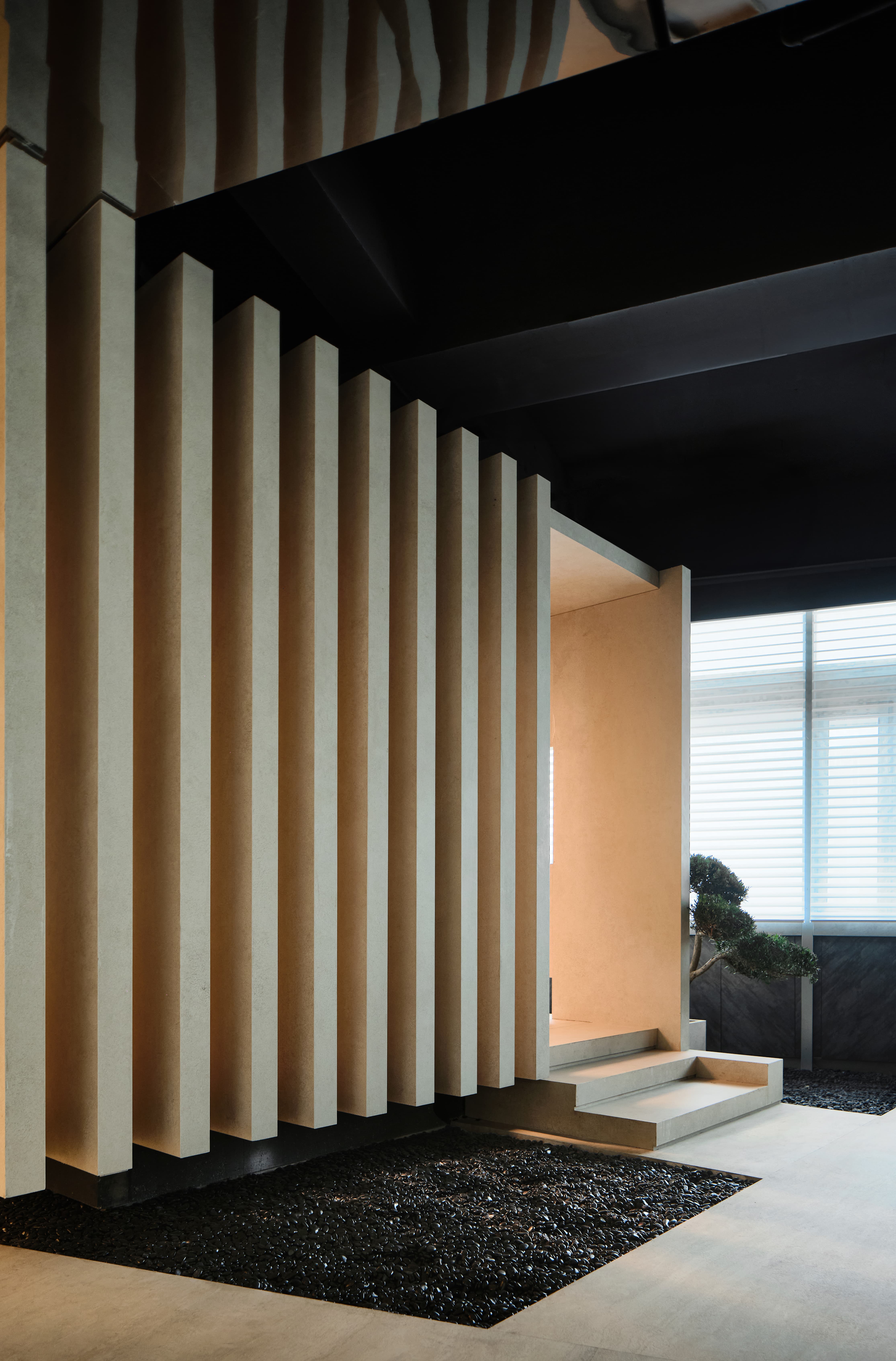 空间布局:在入口的设置上,设计师设置了一条斜向的廊道,构建了一个通向展厅的入口场域,区分了展厅的内与外。展厅内也借以这道倾斜了30度的墙面,构建了展示的片墙,以及洽谈的盒体区域。三个区域相互平行,好似与周围空间达成了某种默契,在整个空间中扮演着自己的角色,又互相联系,维持着一种巧妙的平衡,和谐的关系。空间关系趣味十足,整个展厅妙趣横生。茶室洽谈区与岛台会客区之间用墨色鹅卵石加以引导点缀,吸引着人们的视线来到这个悬挑的BOX。为了突出这个box的形态,直接用了建筑原顶。Box的顶、地、墙面均使用了清白麻岩板,色调温润柔和,营造了一个舒适放松的洽谈氛围。