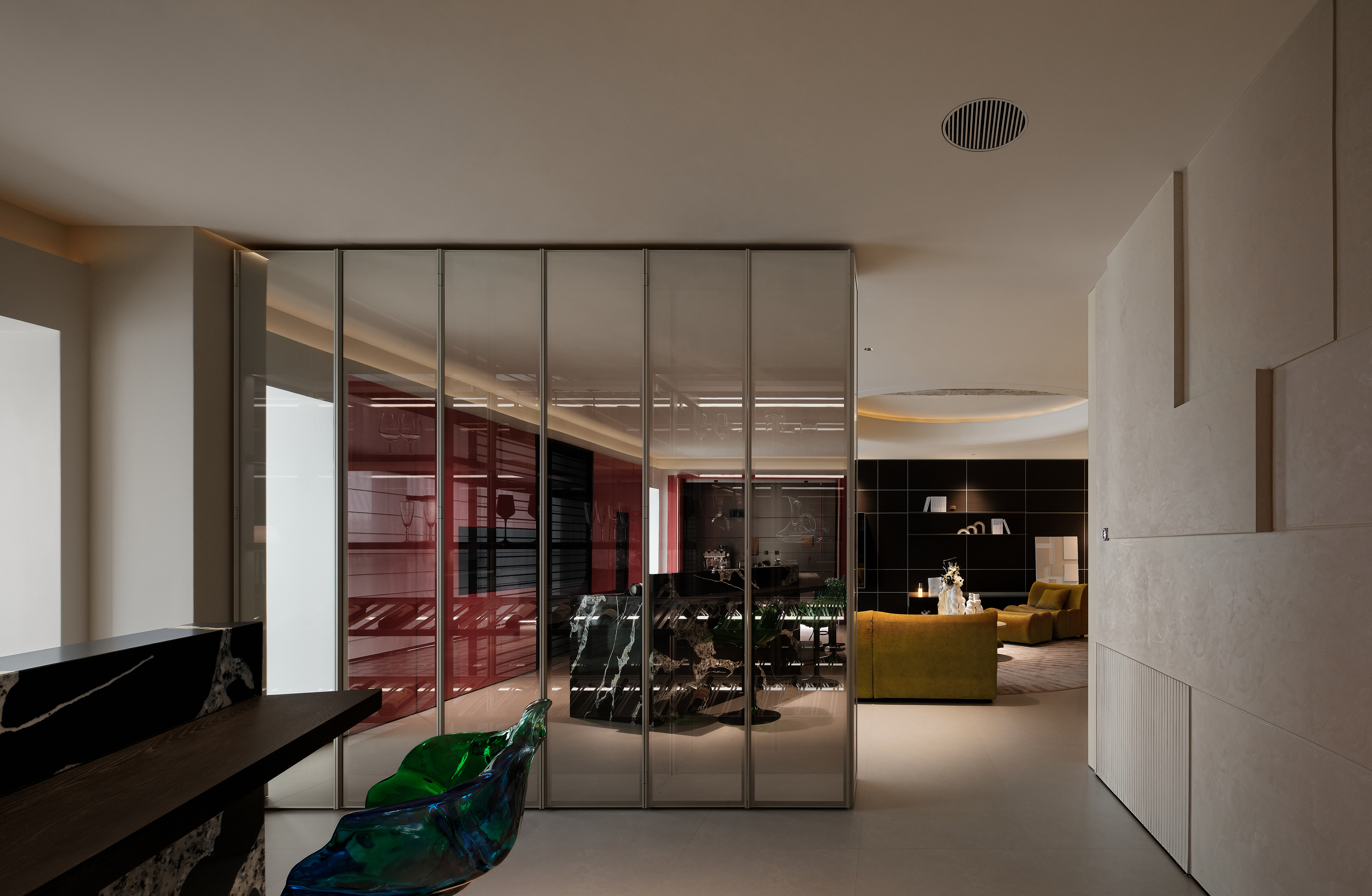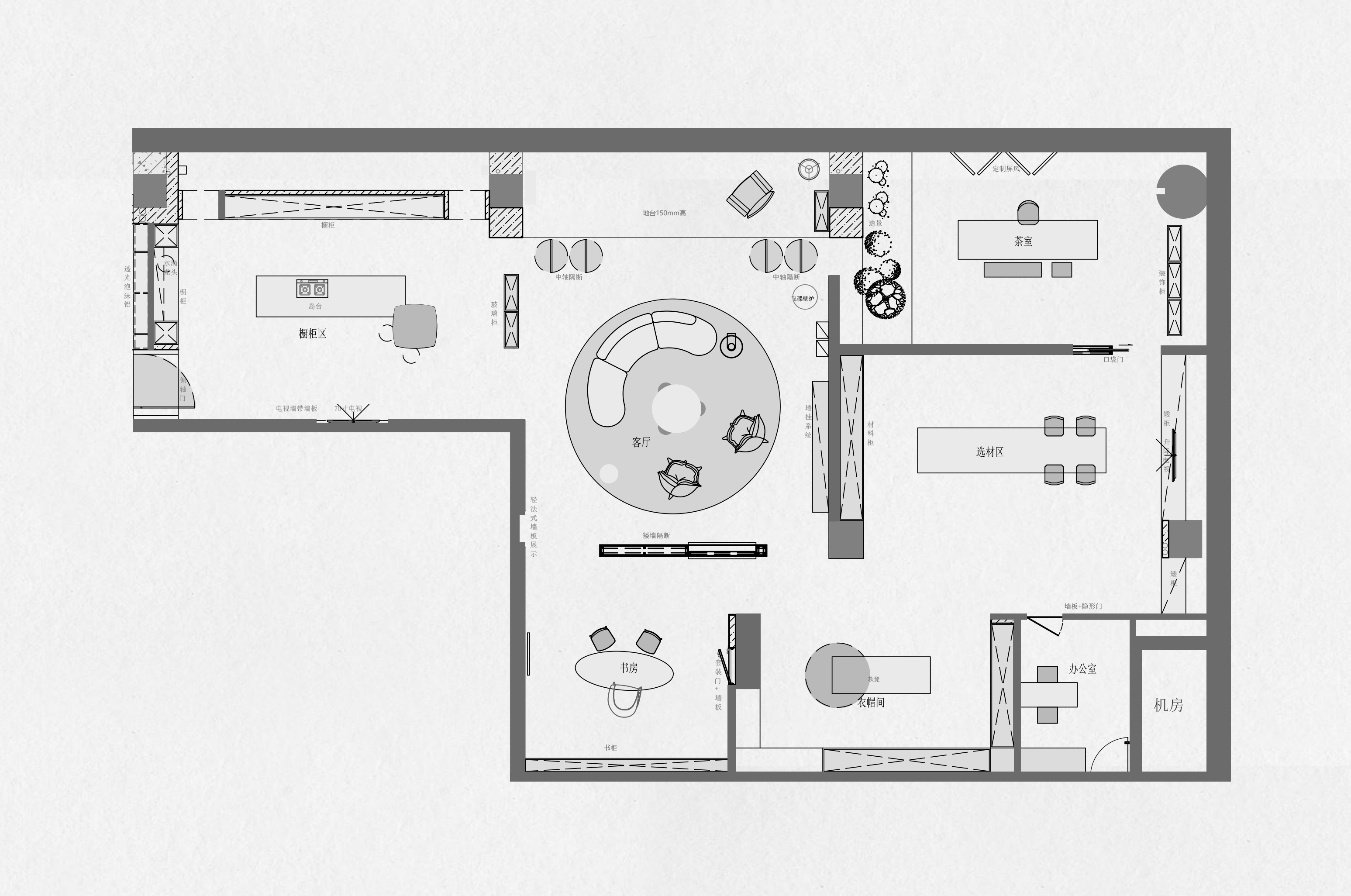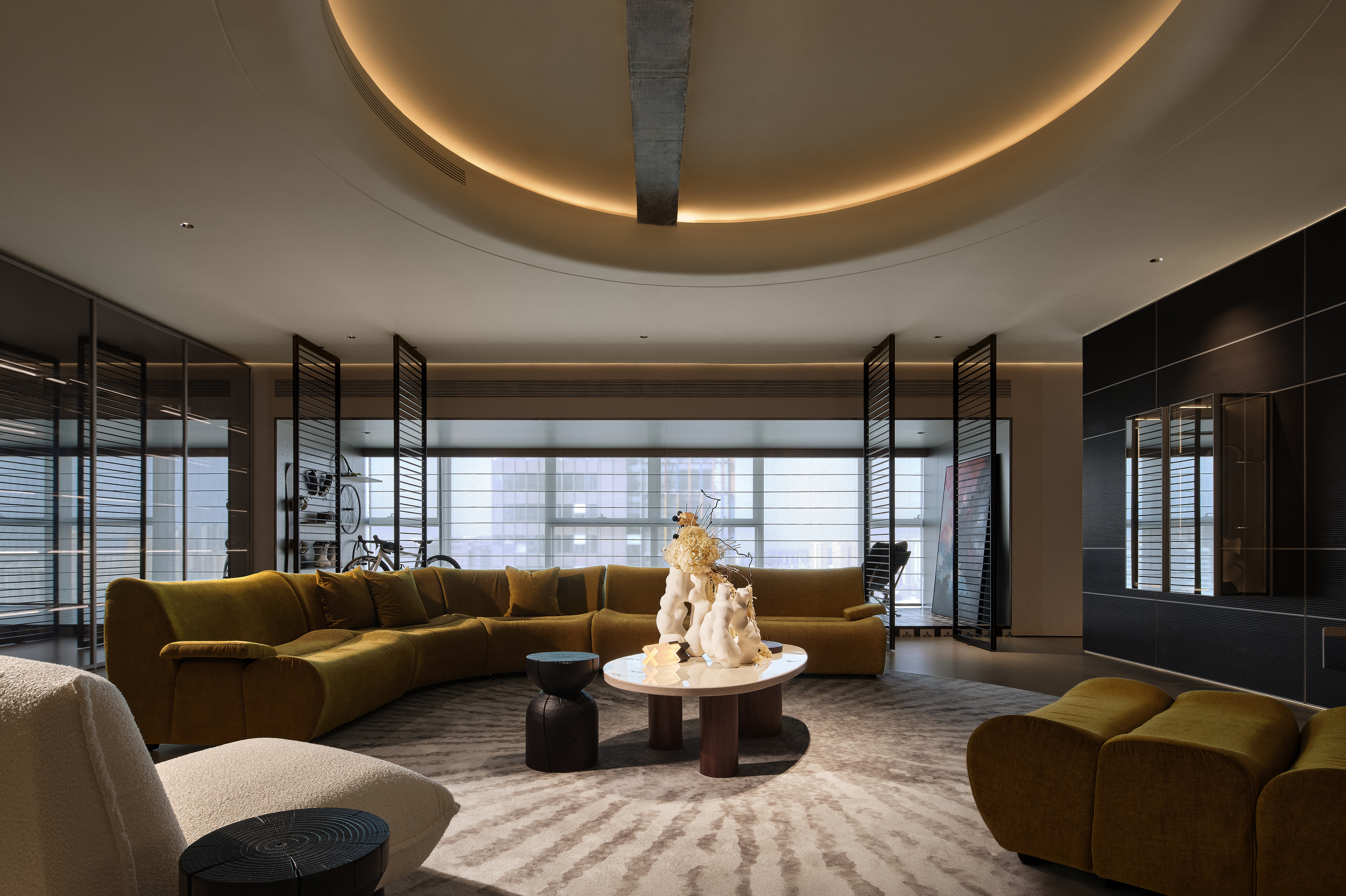 空间意境:当多数高定展厅仍执着于“陈列珍稀材质”“堆砌奢华符号”时,我们已以“息·隅”为魂,突破传统框架 -- 让设计不再是“填满空间”,而是“雕琢角落”,以“角落共情”为桥梁,让展厅化作承载家之温情的“栖息秘境”,既懂材质肌理的细腻触感,更懂人心深处“于小隅寻大自在、于细微得大放松”的本质需求。