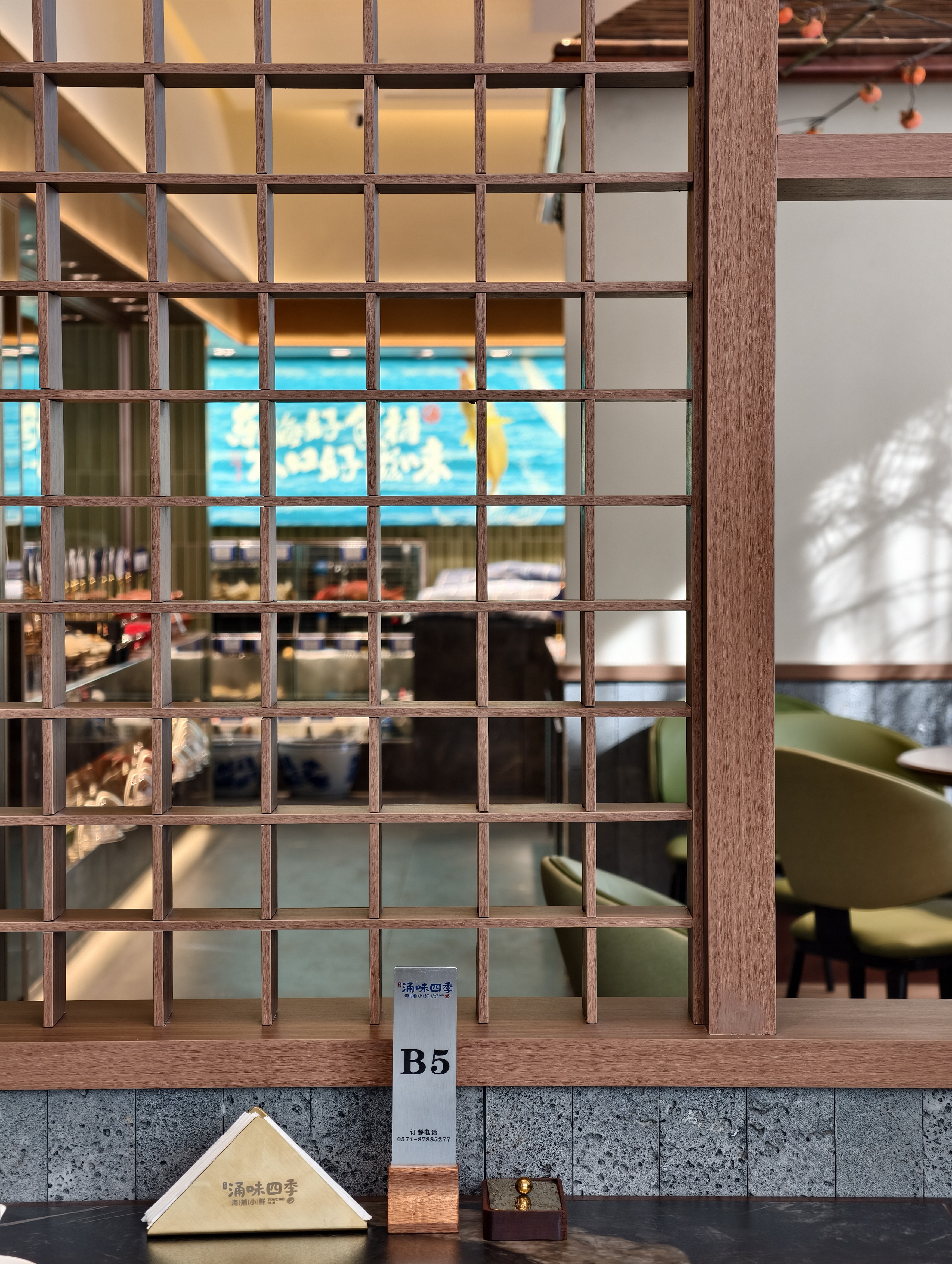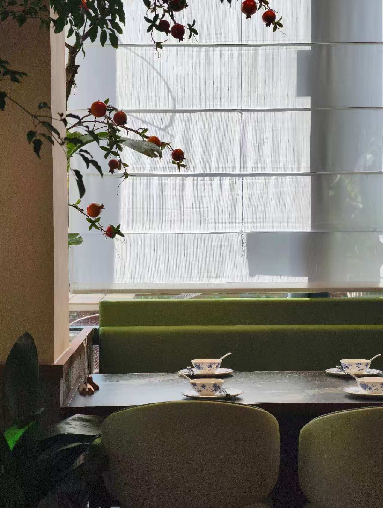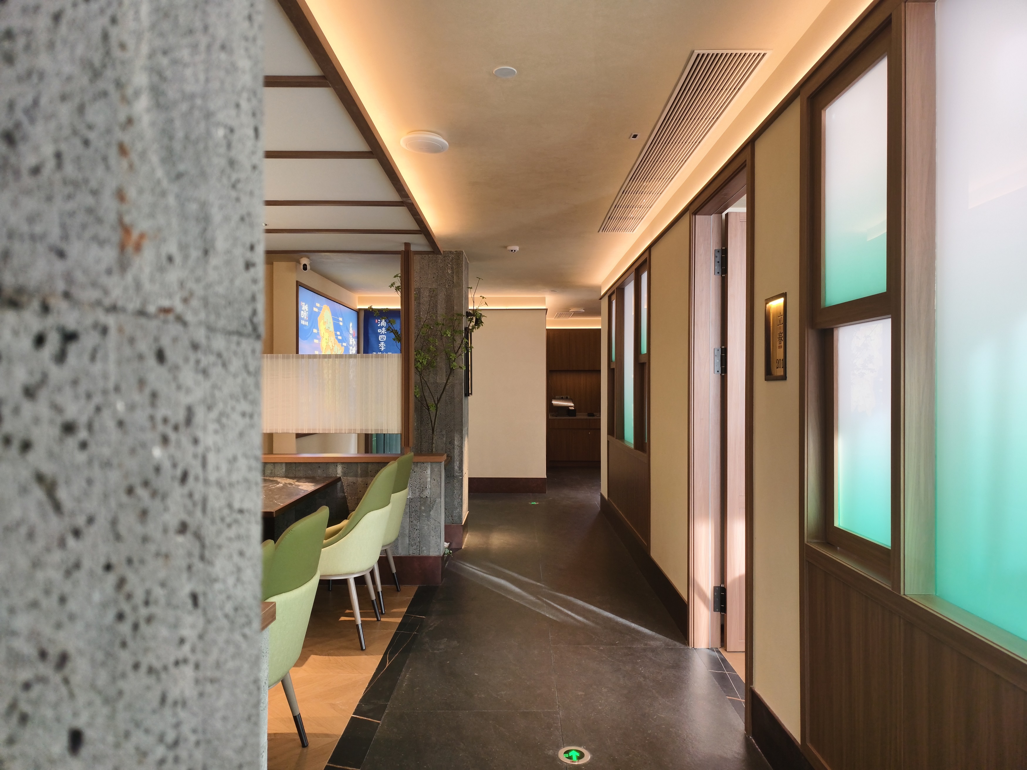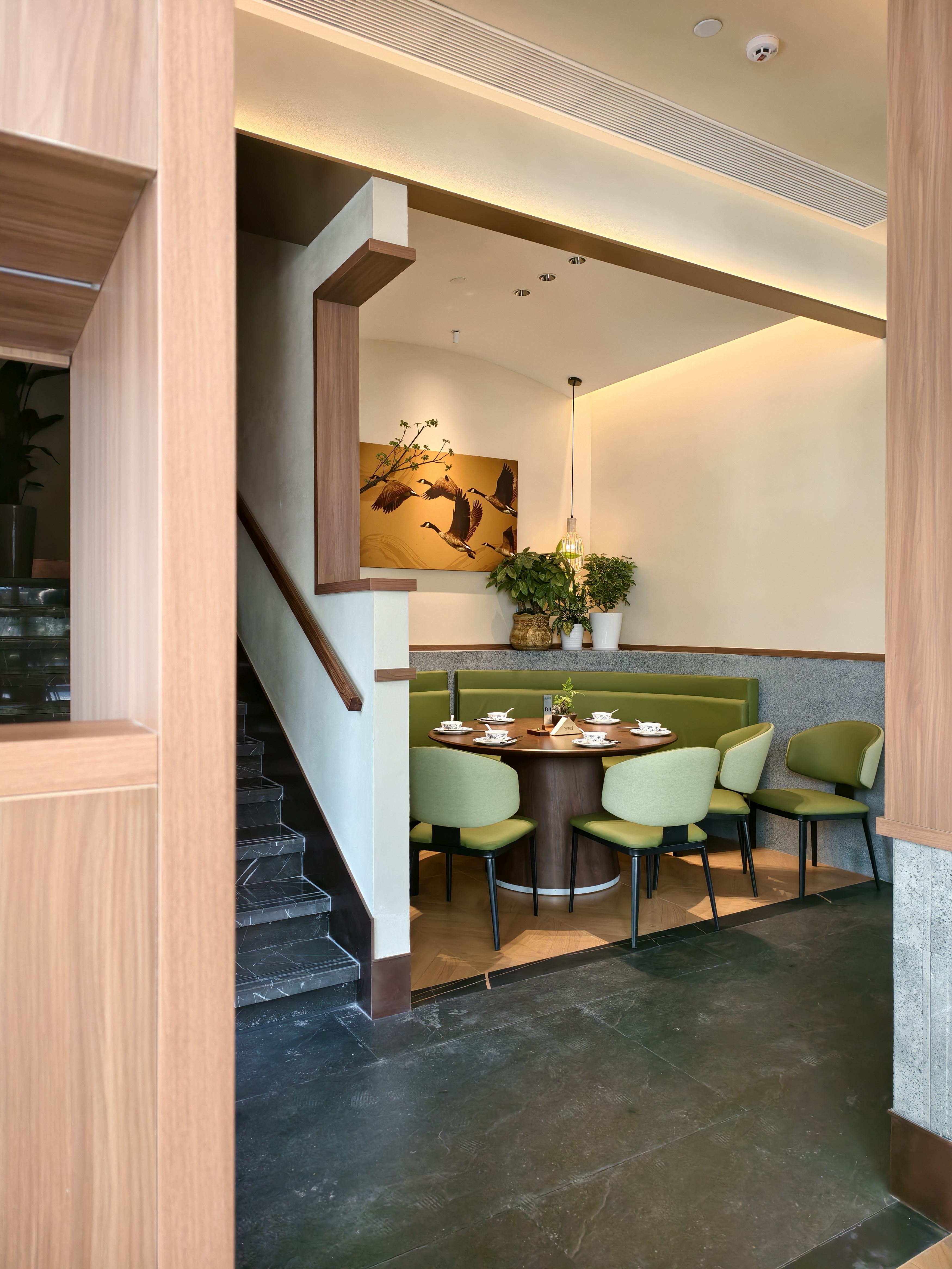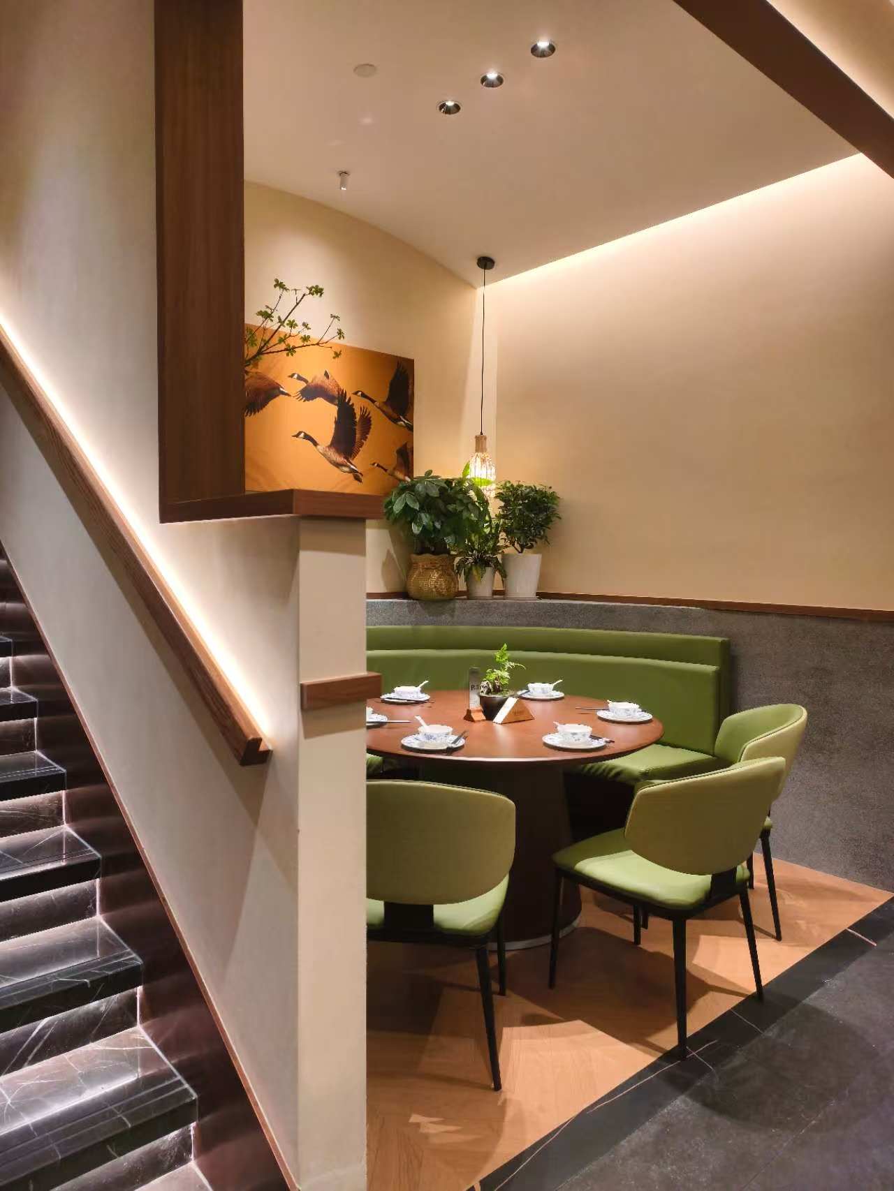 这间涌味四季的家,去那儿的路像一条蜿蜒的溪流,淙淙清亮,延伸向还不可知的远方和记忆的院子。室内张张围桌选用的胡桃木,温润且与木质肌理相映,一半是时光沉淀的拙朴,一半是都市生活的静雅。落坐窗边,整面落地玻璃也将天光云影邀入室内,树影婆娑时,空间便有了四季的呼吸。墙面覆以木块,像给建筑披了件透气布衣 —— 这是我们对自然的温柔注解 -
