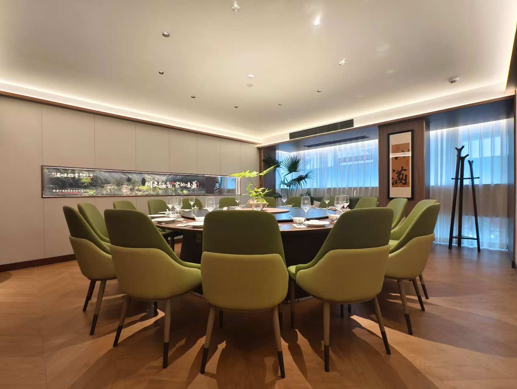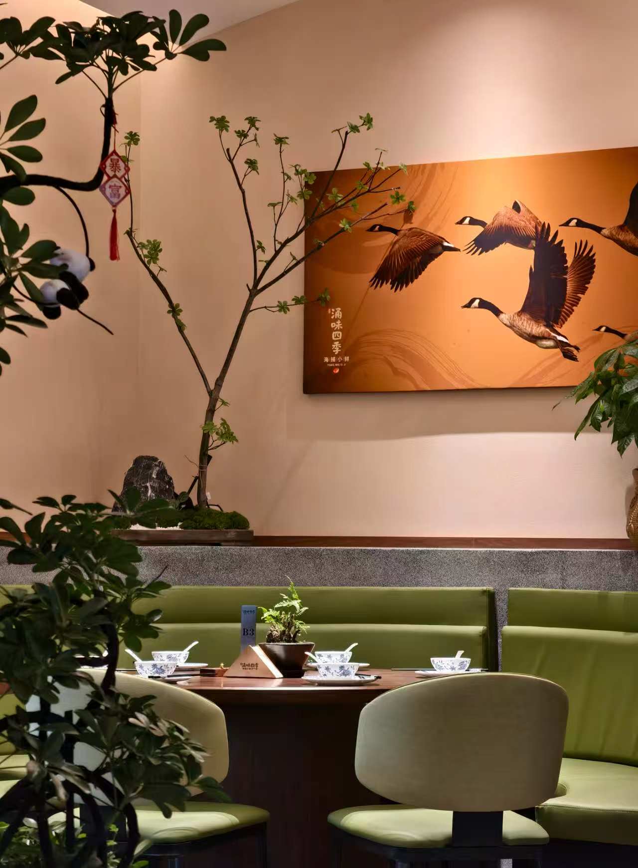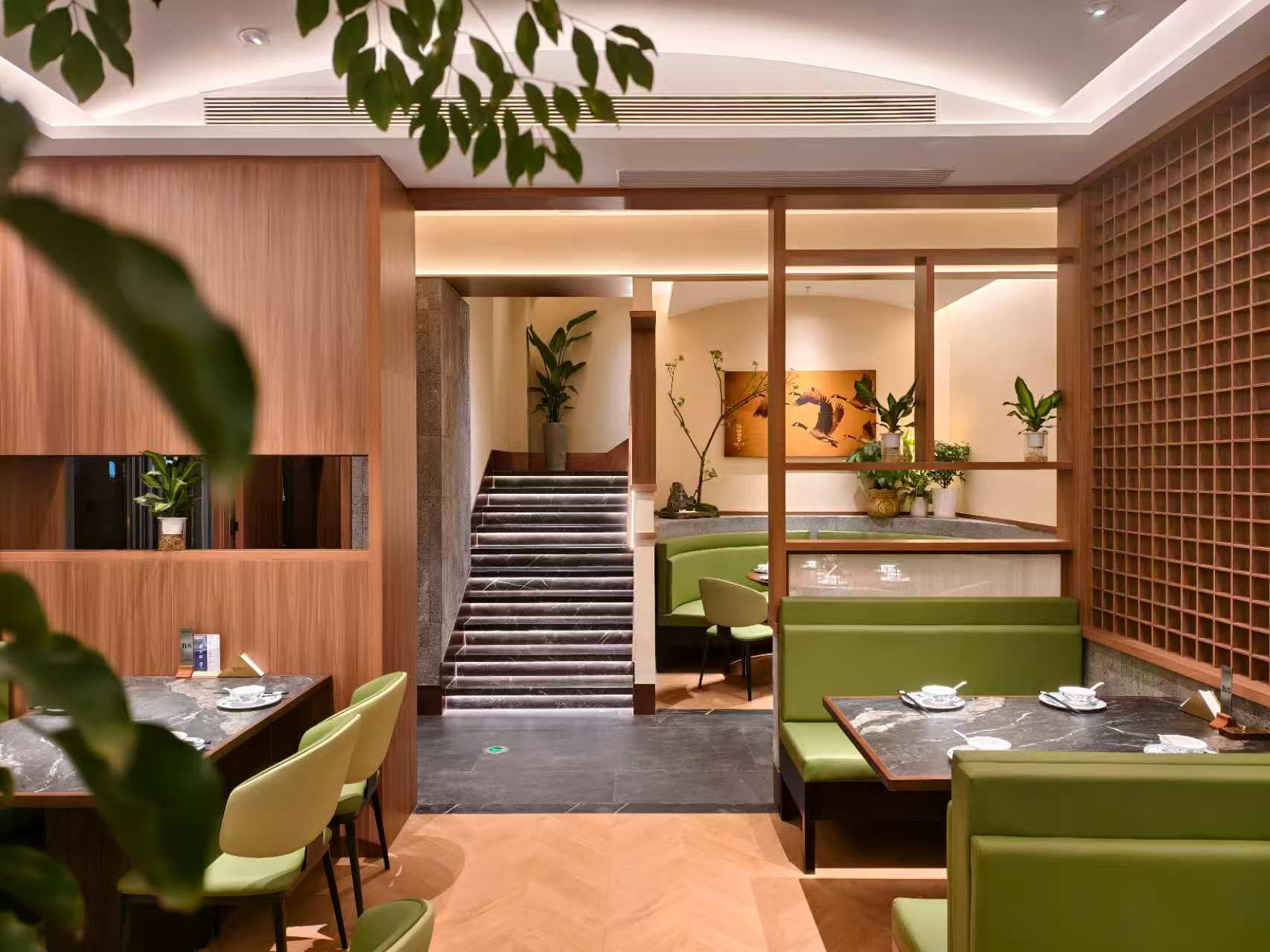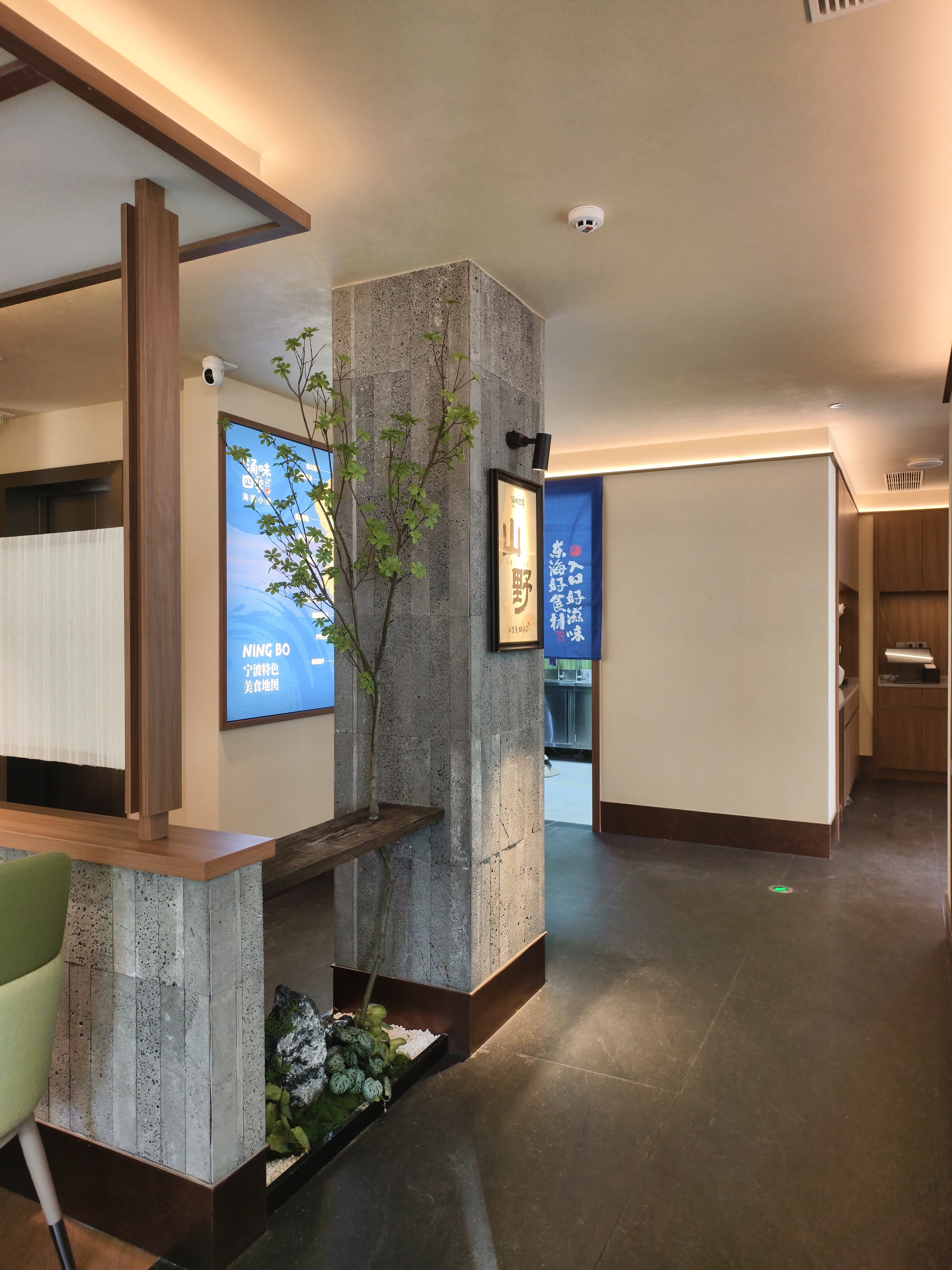 这间涌味四季的家,去那儿的路像一条蜿蜒的溪流,淙淙清亮,延伸向还不可知的远方和记忆的院子。室内张张围桌选用的胡桃木,温润且与木质肌理相映,一半是时光沉淀的拙朴,一半是都市生活的静雅。落坐窗边,整面落地玻璃也将天光云影邀入室内,树影婆娑时,空间便有了四季的呼吸。墙面覆以木块,像给建筑披了件透气布衣 —— 这是我们对自然的温柔注解 -