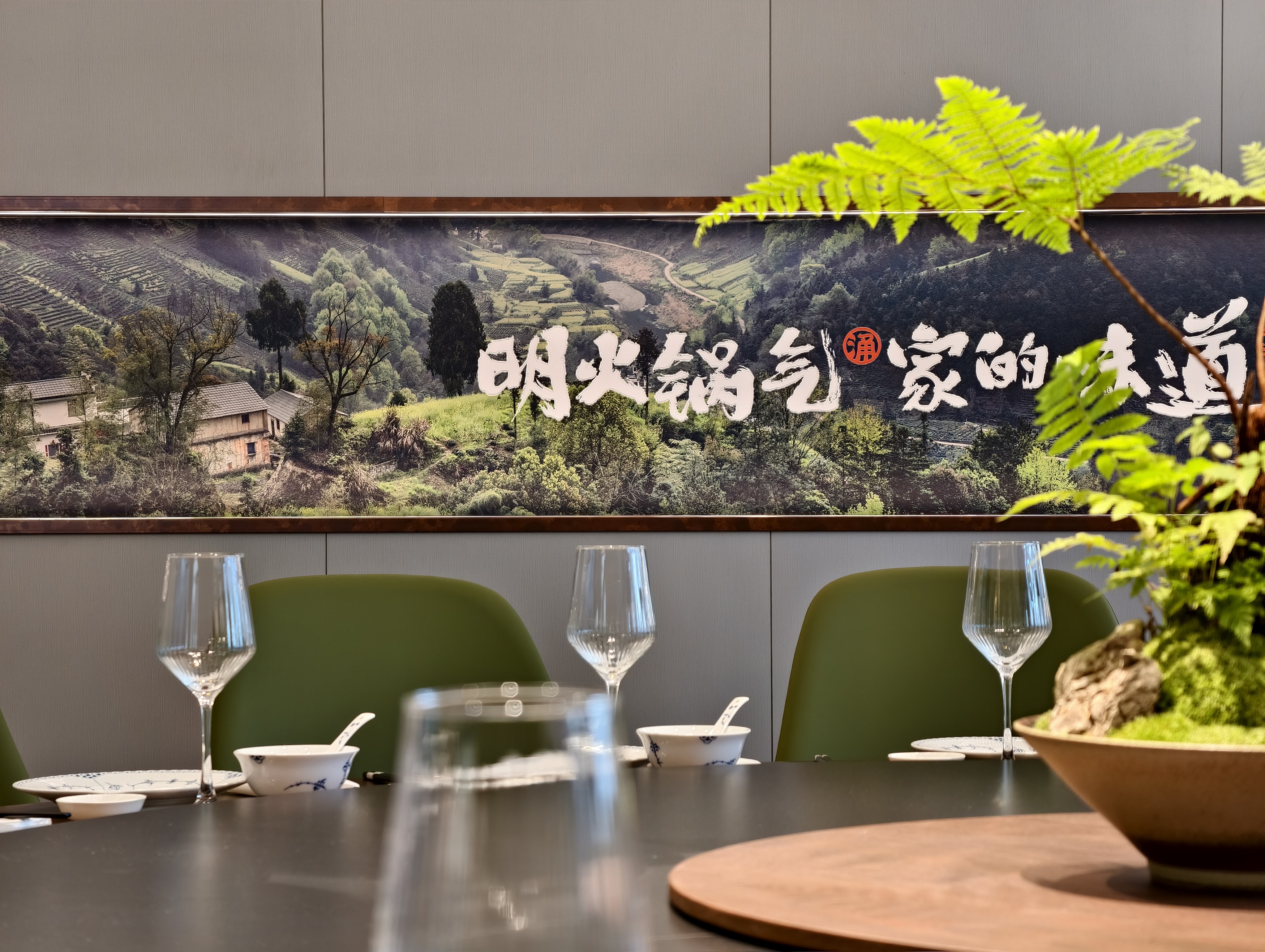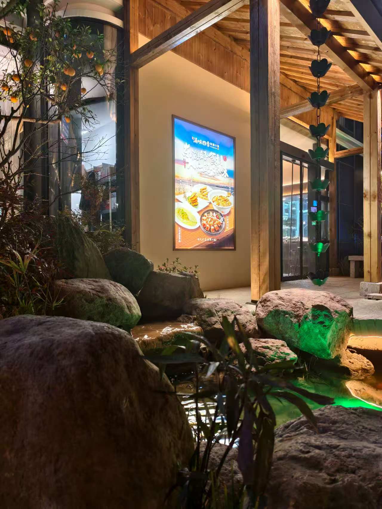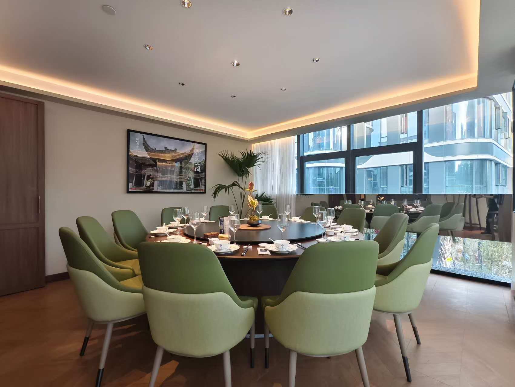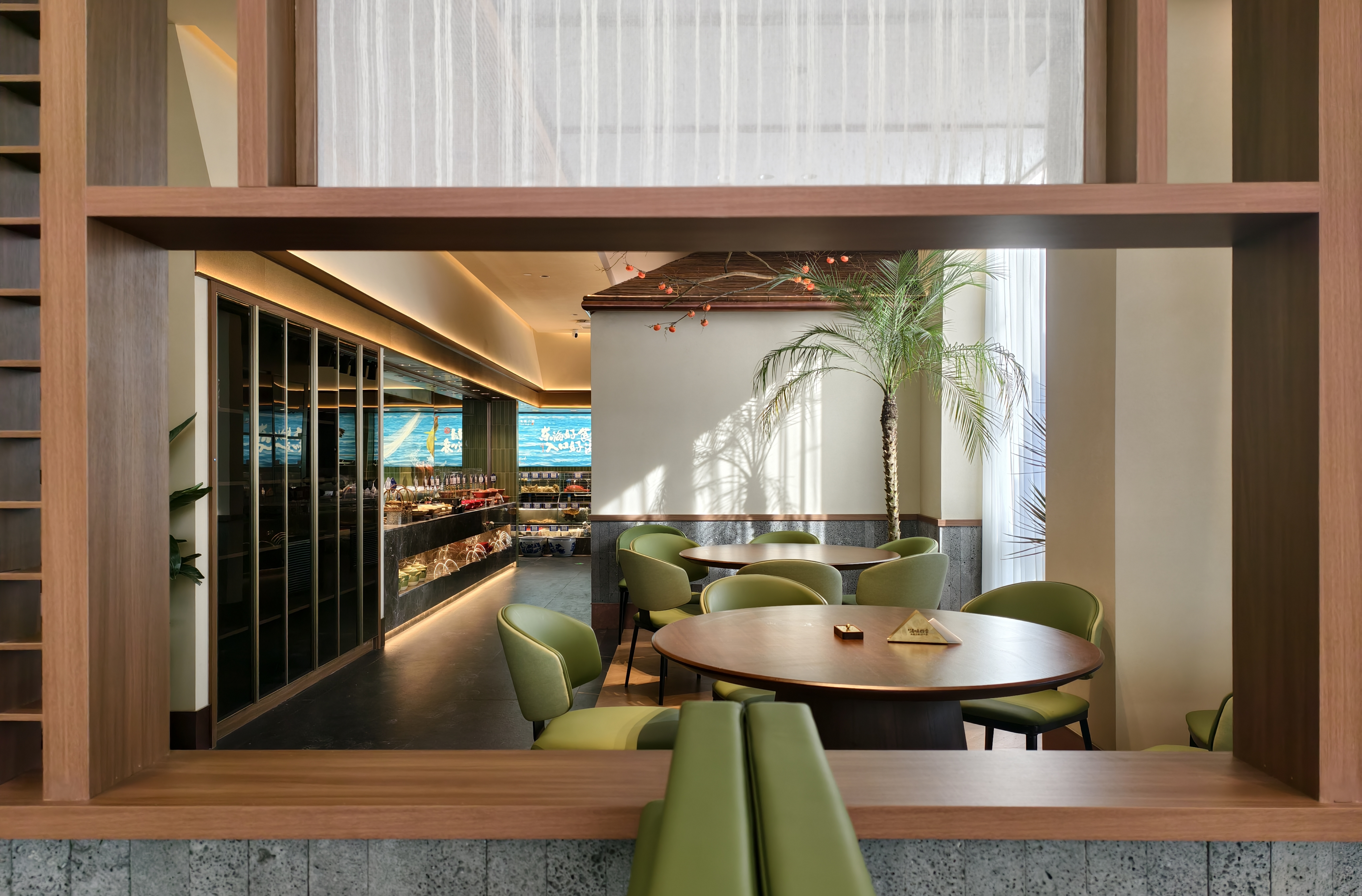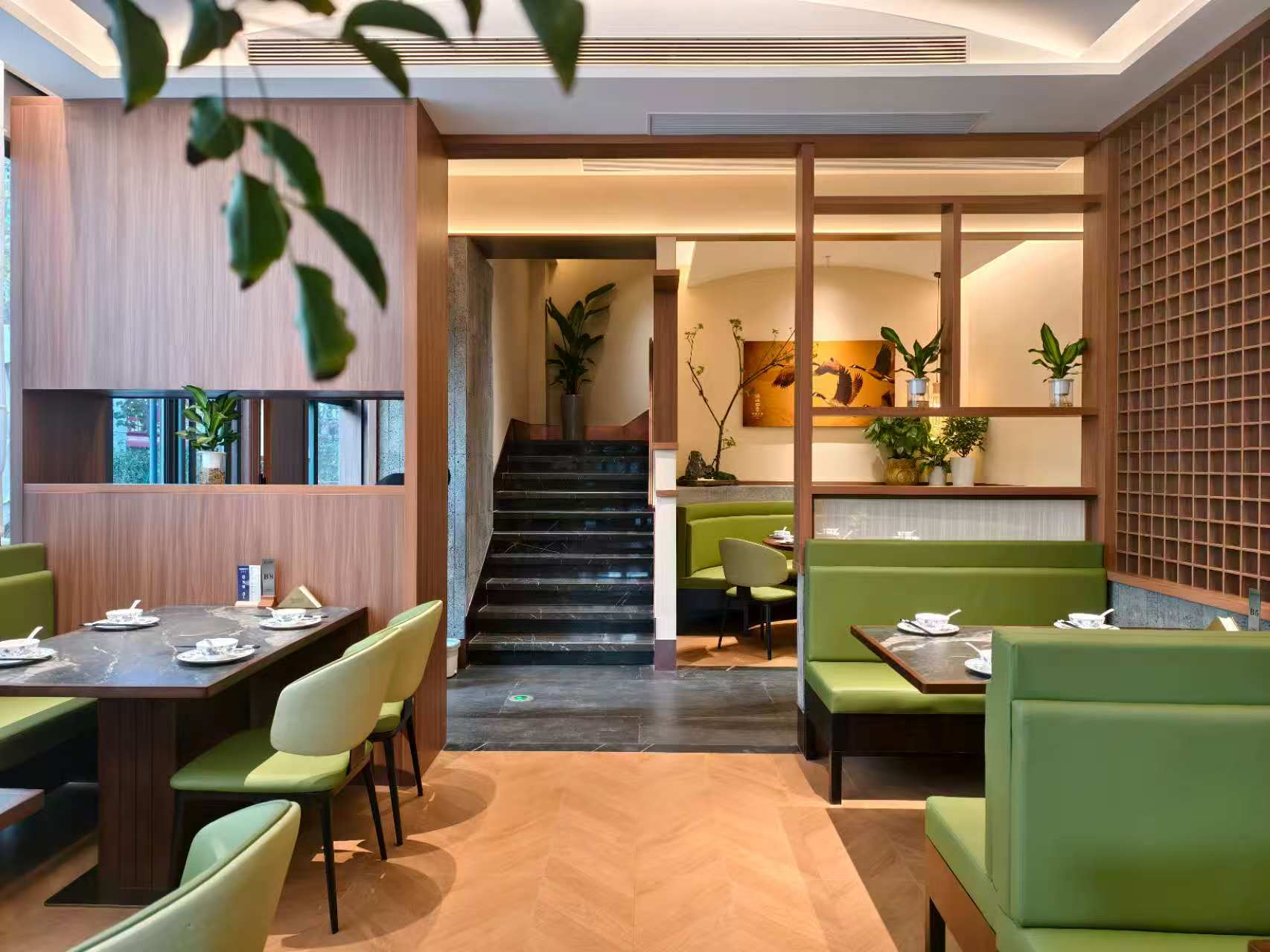 这间涌味四季的家,去那儿的路像一条蜿蜒的溪流,淙淙清亮,延伸向还不可知的远方和记忆的院子。室内张张围桌选用的胡桃木,温润且与木质肌理相映,一半是时光沉淀的拙朴,一半是都市生活的静雅。落坐窗边,整面落地玻璃也将天光云影邀入室内,树影婆娑时,空间便有了四季的呼吸。墙面覆以木块,像给建筑披了件透气布衣 —— 这是我们对自然的温柔注解 -