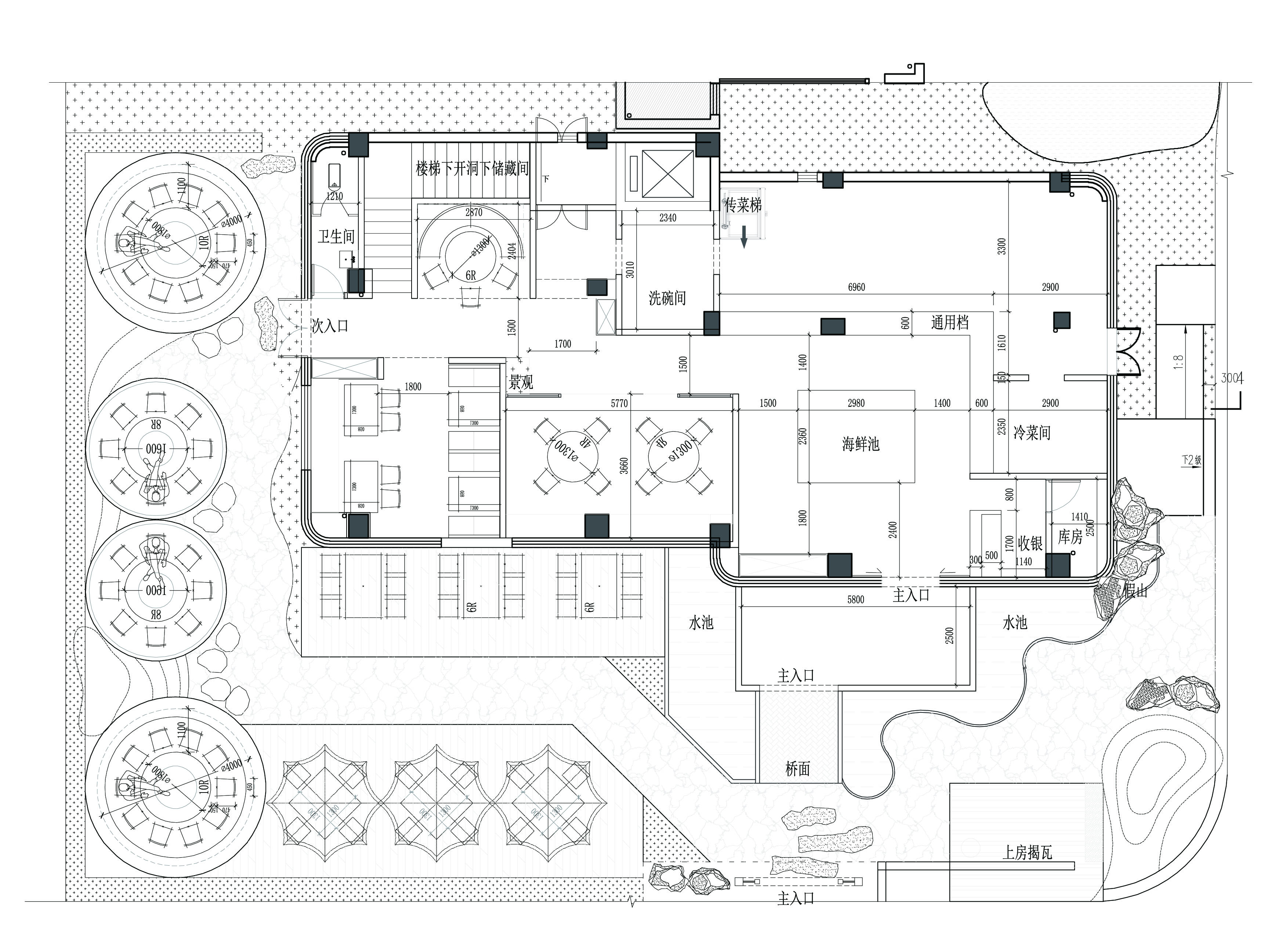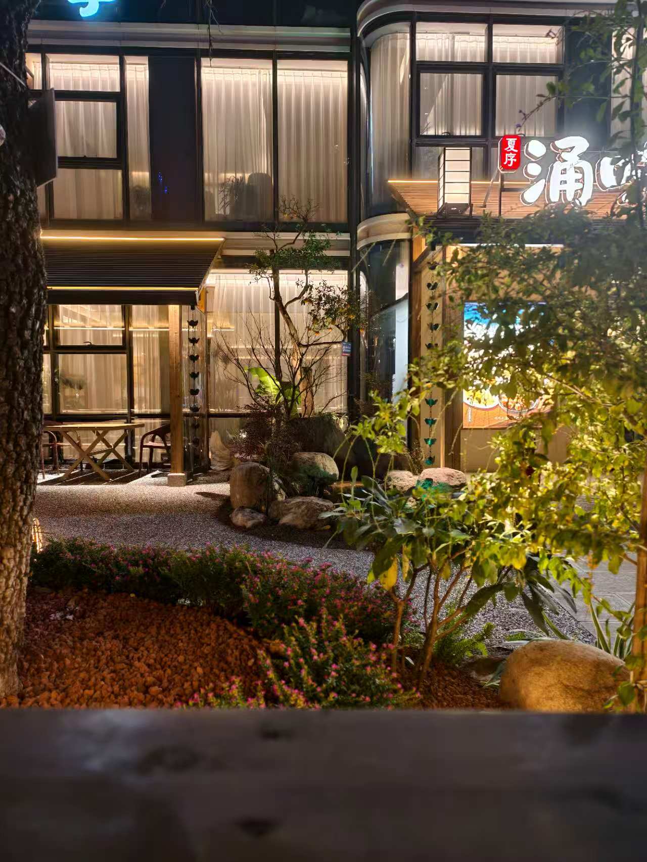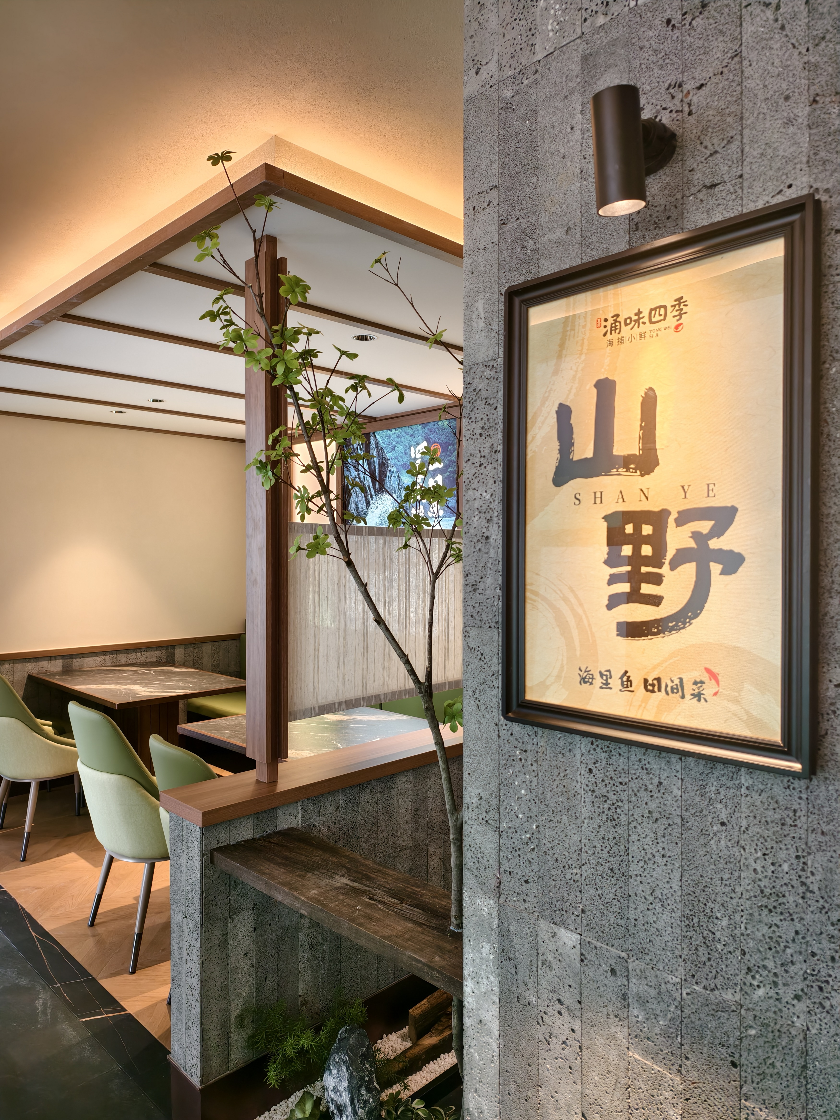 空间意境:涌味四季讲述了,“树”与“屋”的理念,把回家印象作为符号引入,不过形态上更加简化,入口进入院子,院子里有棵柿子树,斜屋檐高低错落,贯穿院子和室内。以树木贯穿空间,用光点亮氛围,取自然之景放入室内,尽可能地营造一个温馨而自在的用餐时刻。新屋延绵不大,却有外延的庭院,便以此作为室内室外空间的穿插,如画中留白,有一隅透气之地。我们再顺水行舟,铺上肥沃的泥土,决意按时节栽种植物,让窗中景于四季流转。