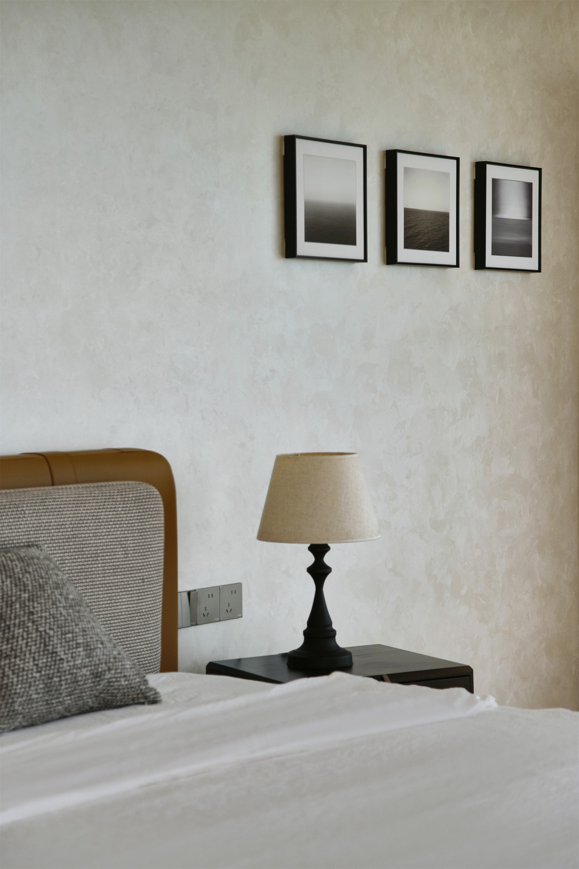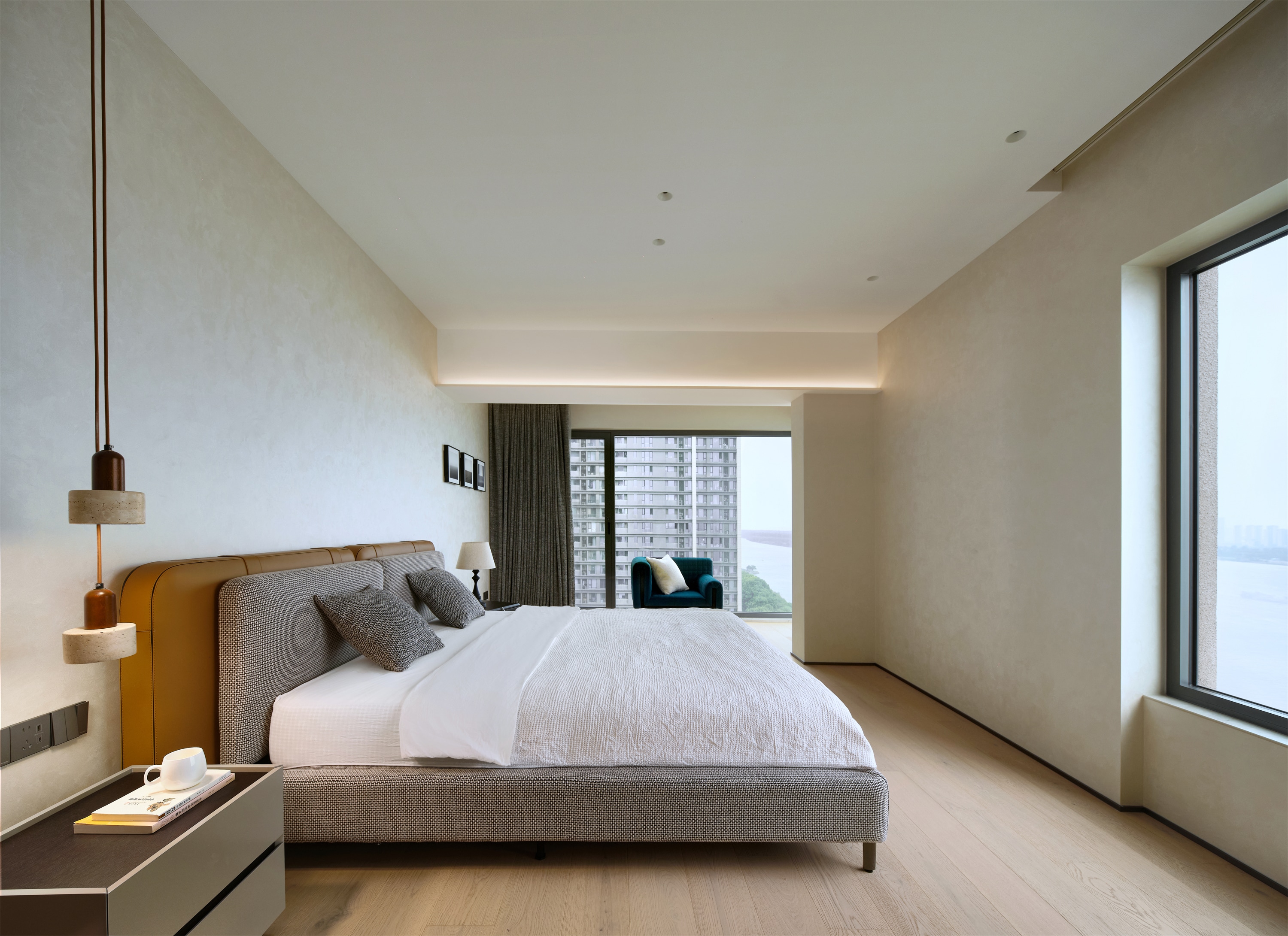 卧室整体氛围宁静且舒适。整体色调均采用柔和的米色,营造出温馨的感觉。浅色木地板,纹理自然,增添了空间的温暖质感。整个空间色彩对比和谐。床头悬挂着两盏现代感十足的圆柱形吊灯,颜色为深浅不一的灰色,设计简约而富有层次感。 -