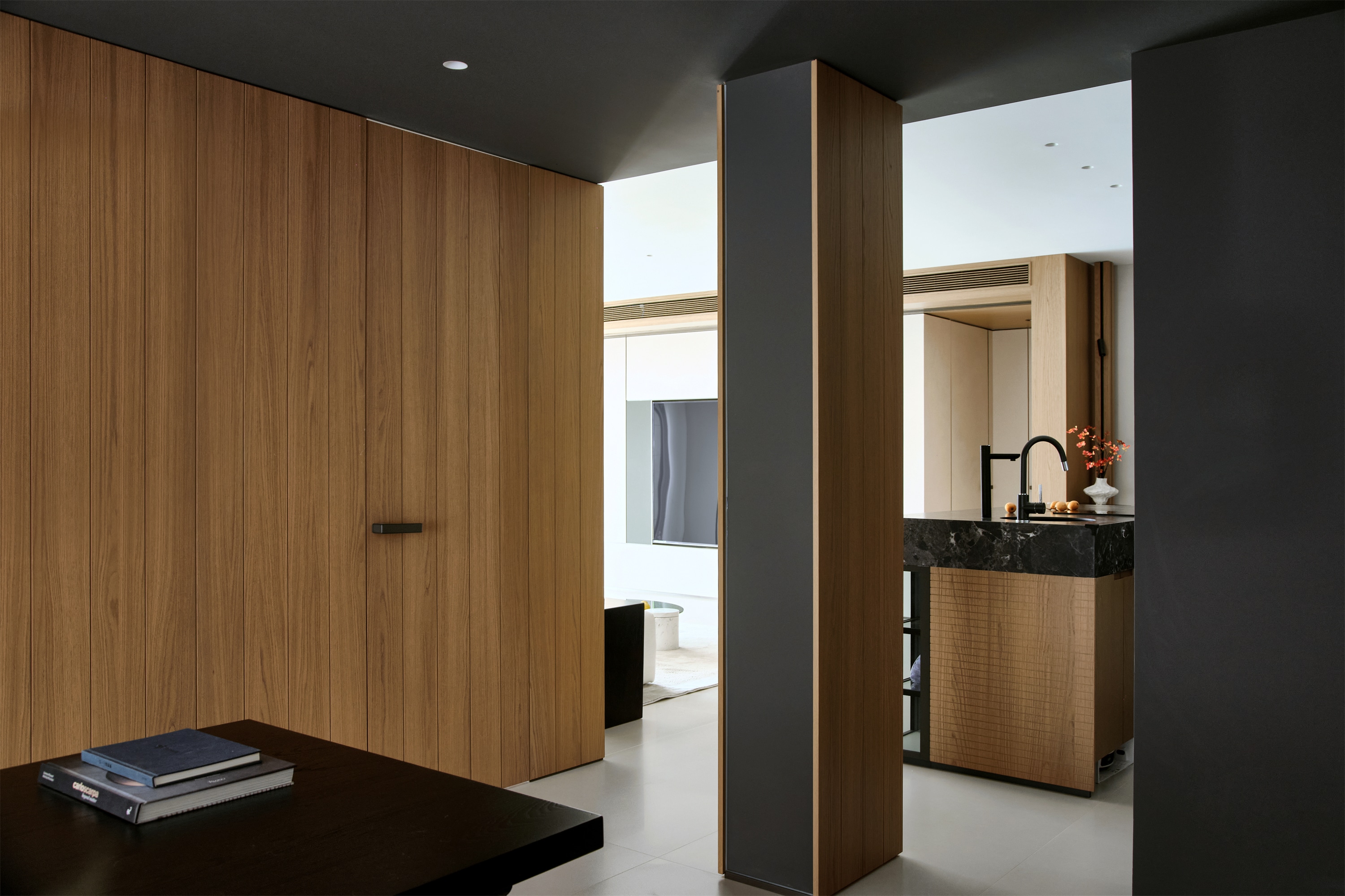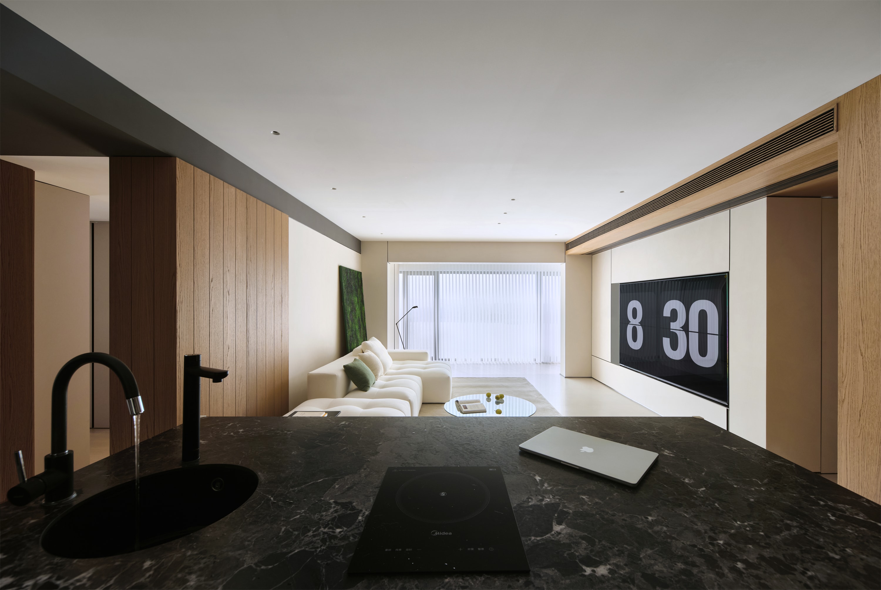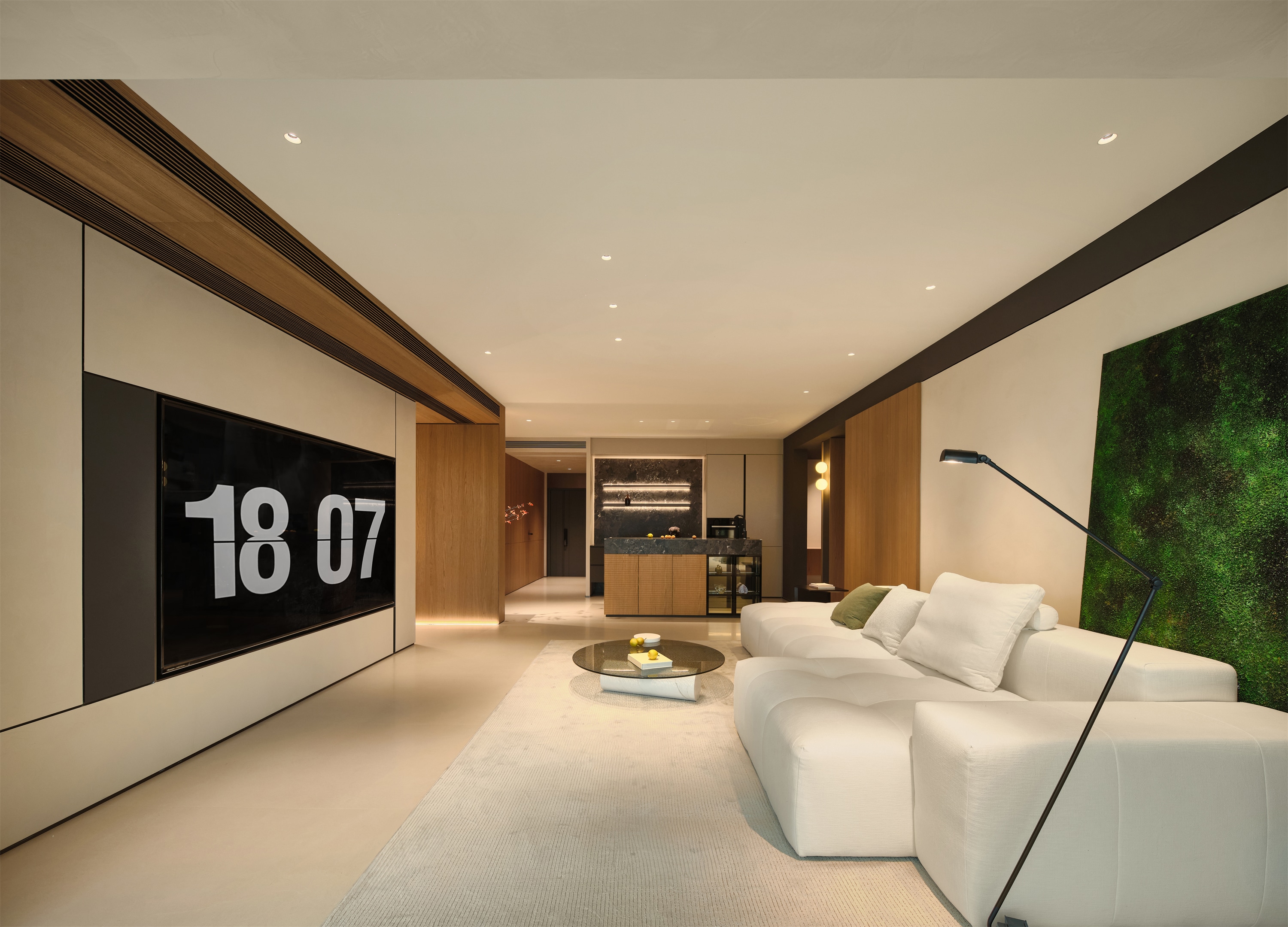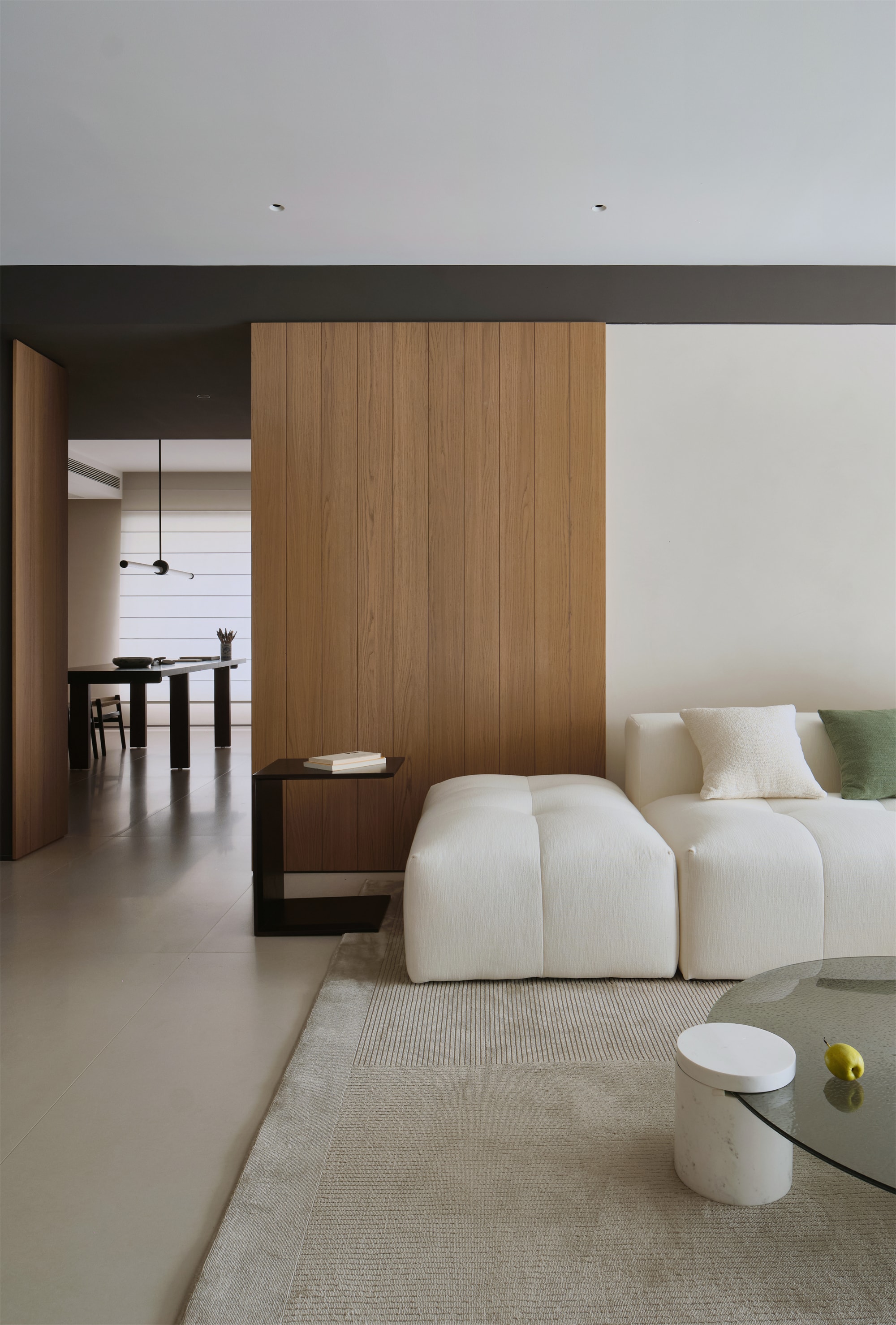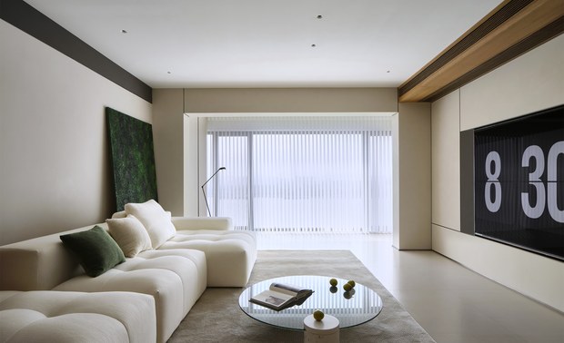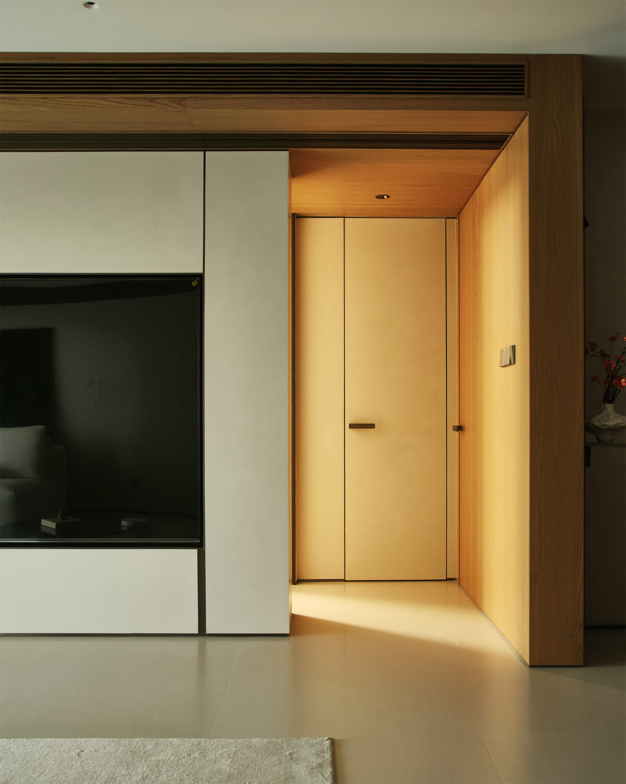 电视背景墙由白色和浅木色的板材构成,木色细长的吊顶通风口,增加了空间的质感和层次感,与走廊墙面的原木色木饰面装饰相呼应 -