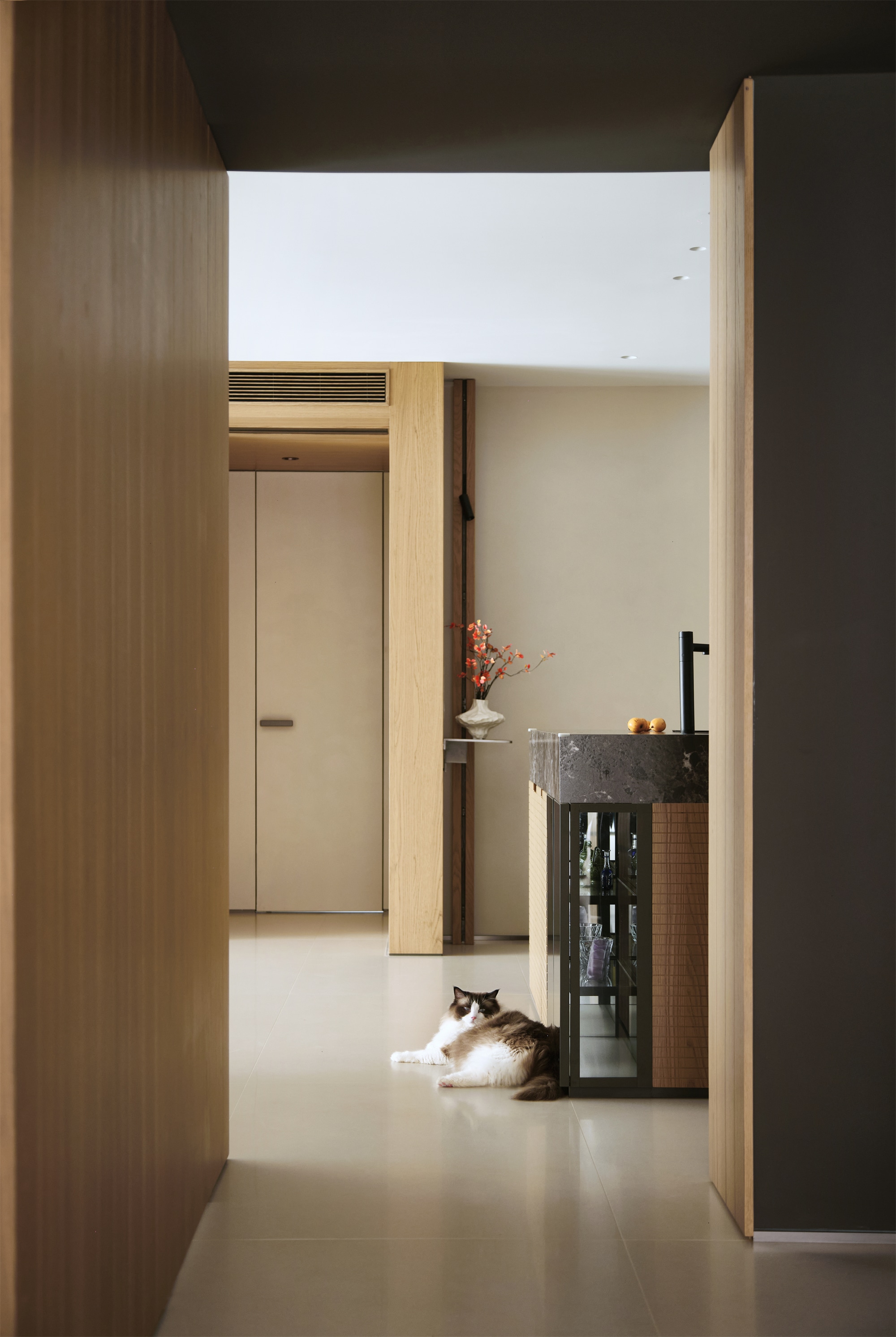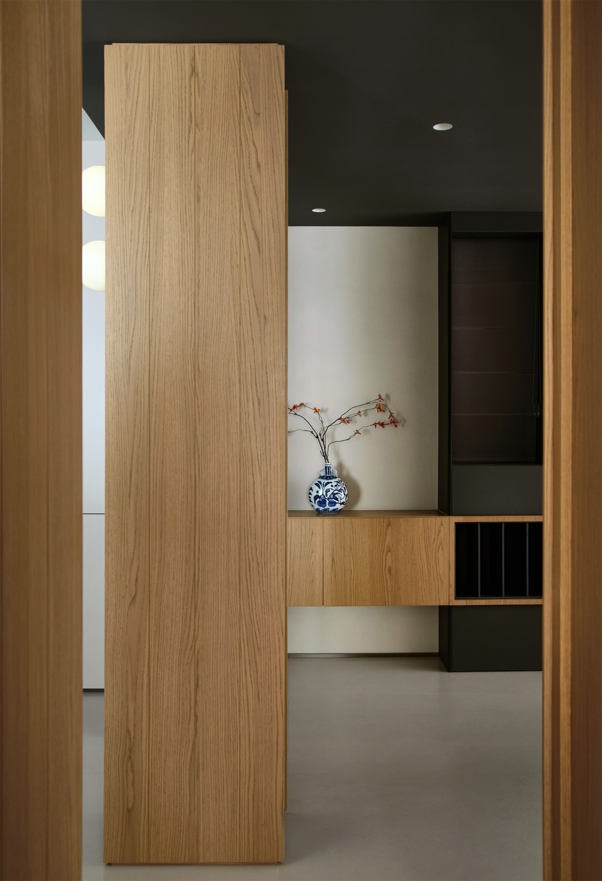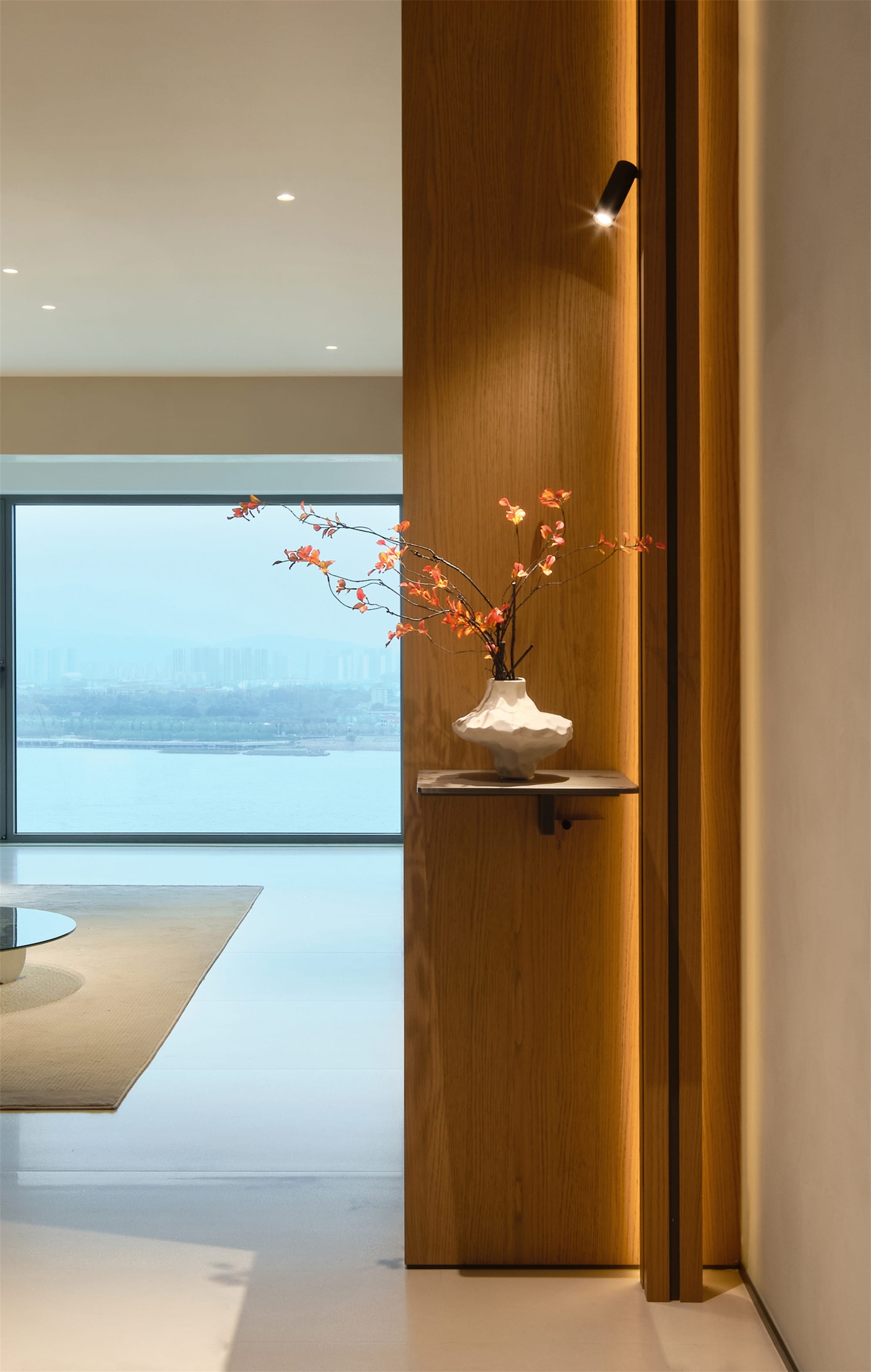 空间布局:从入户开始,映入眼帘就是一段走廊。在原来的户型中,可以一眼望到阳台。设计师在设计玄关时增加了一处端景:一个造型独特的白色花瓶,花瓶线条流畅,表面有自然的起伏,仿佛是被水流冲刷过。花瓶中插着几枝带有橙红色叶子的枝条,为整个空间增添了一抹亮色和一丝自然和灵动的气息。端景背靠着木质墙壁,木纹清晰可见,质感温润。墙壁连接着后面的廊道,与电视背景上方的吊顶形成一个“L”形的视觉效果,在暂隔视线的同时将空间与空间巧妙的联系在一起,趣味横生。墙壁前设计了一根型材柱,安装着一盏黑色的筒灯和线性灯带,灯光柔和地洒在墙面上,营造出温暖的氛围。设计师以原木类材质为媒介,暖黄色灯带加以辅助,延申至各个空间,建立起整个空间的秩序。